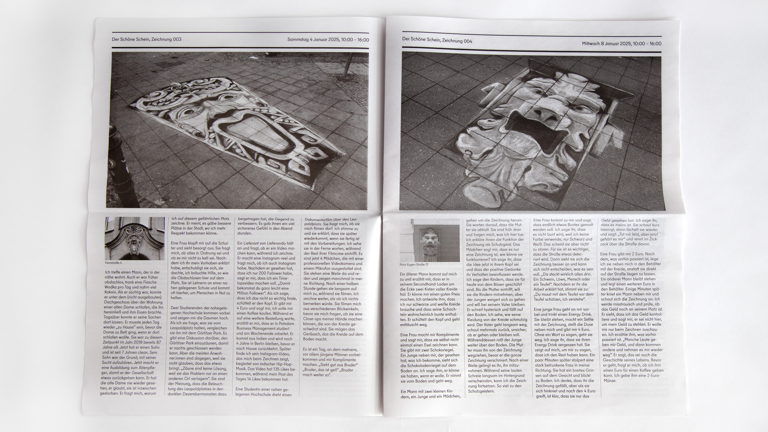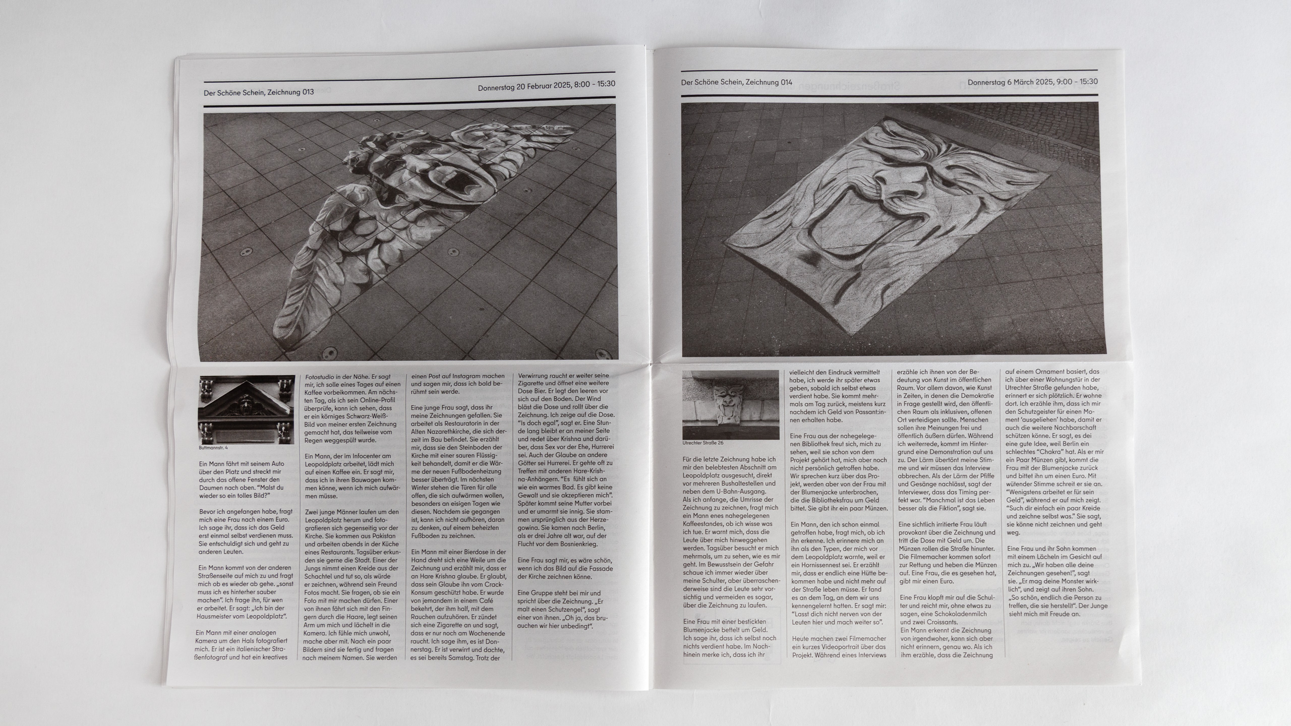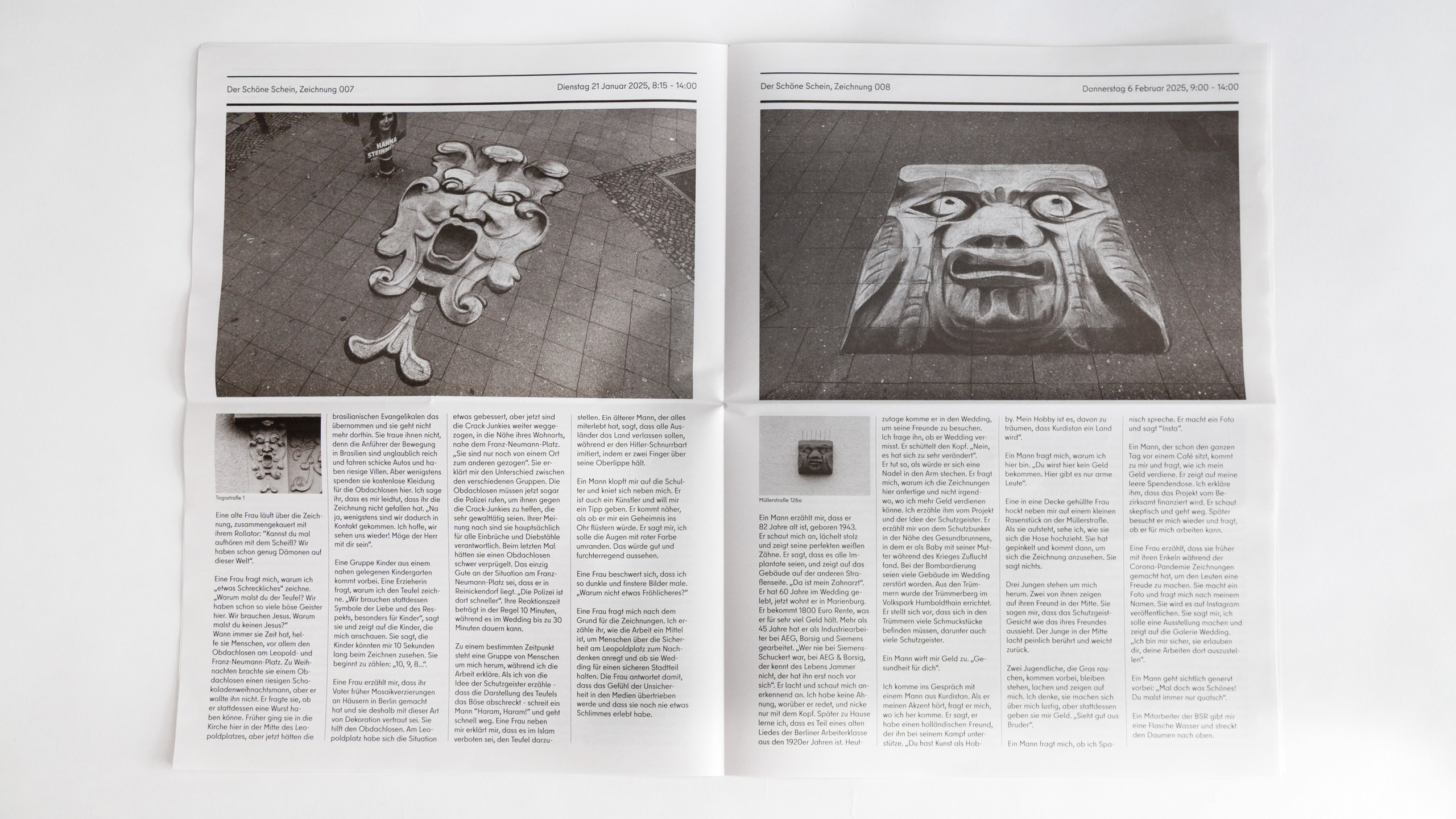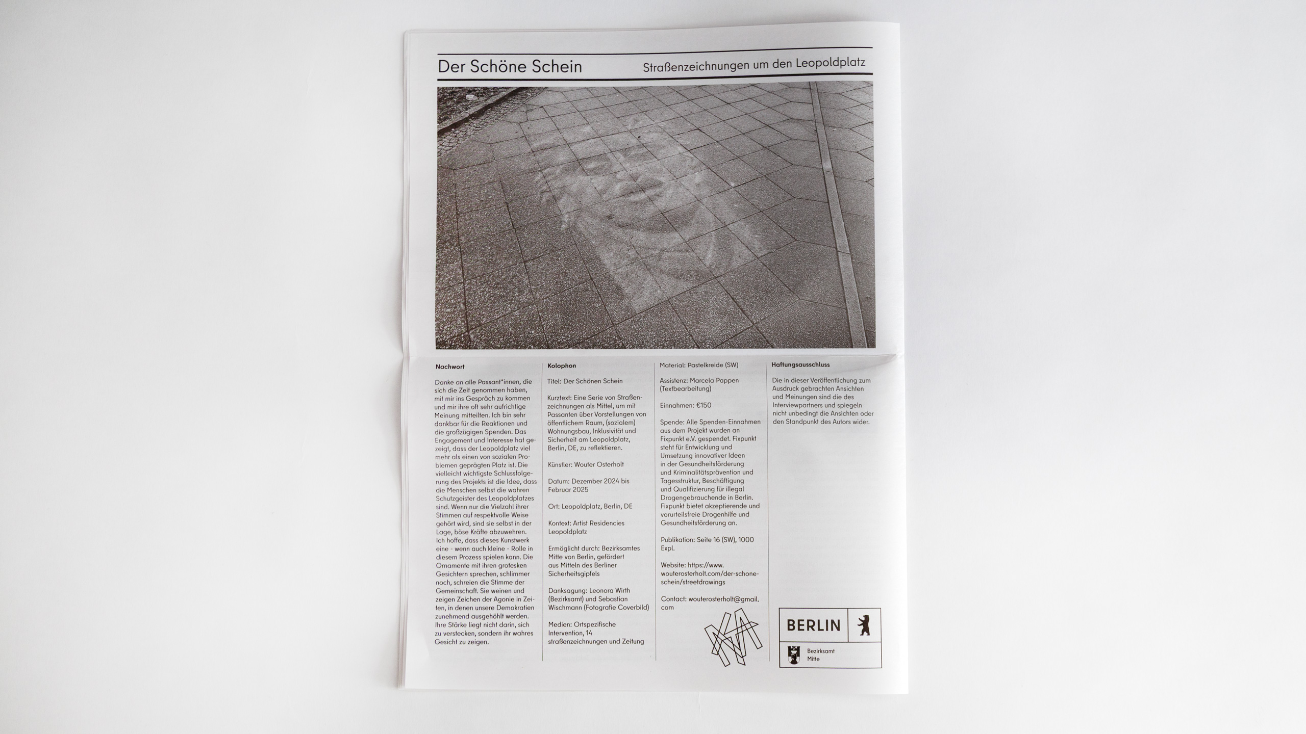The publication presents a selection of the encounters that took place during the production of the work. Some of these interactions were silent, others turned into longer conversations. Sometimes people expressed their frustration, but more often they gave money or something to eat and drink. At the end of the project, the publication was distributed in the neighbourhood around Leopoldplatz.