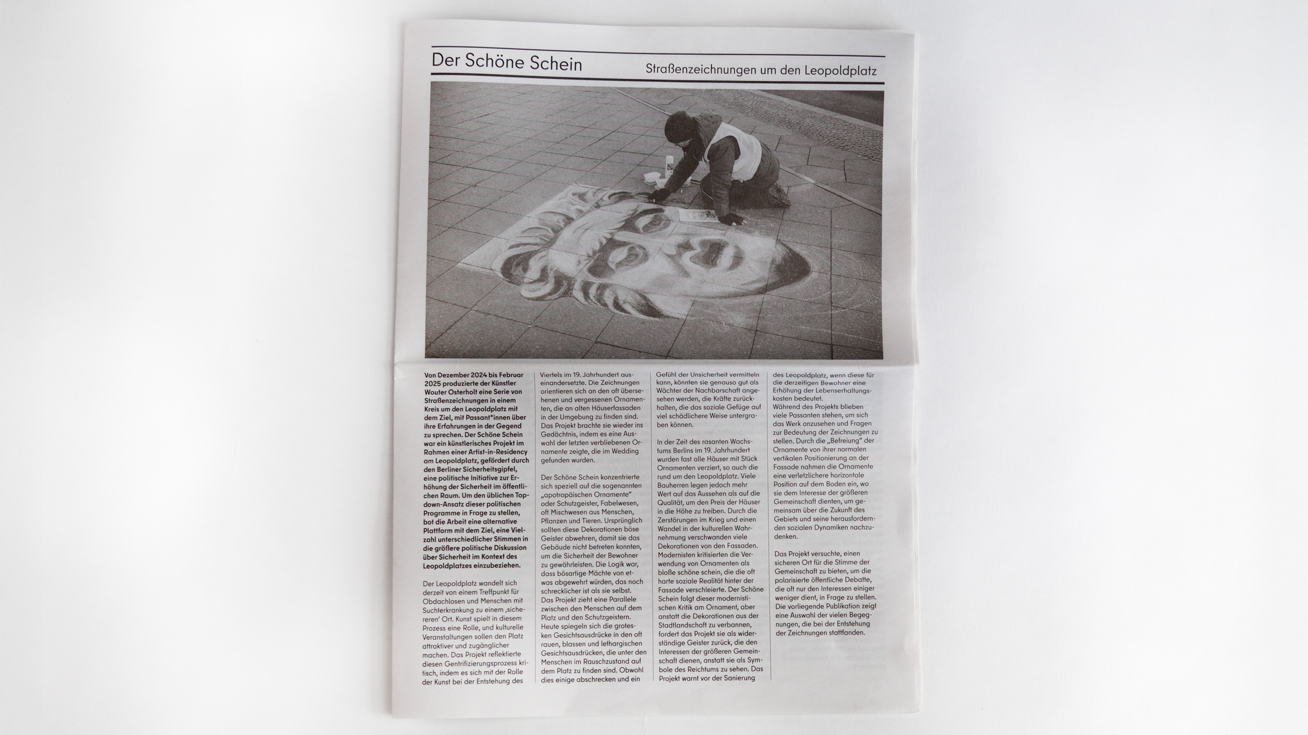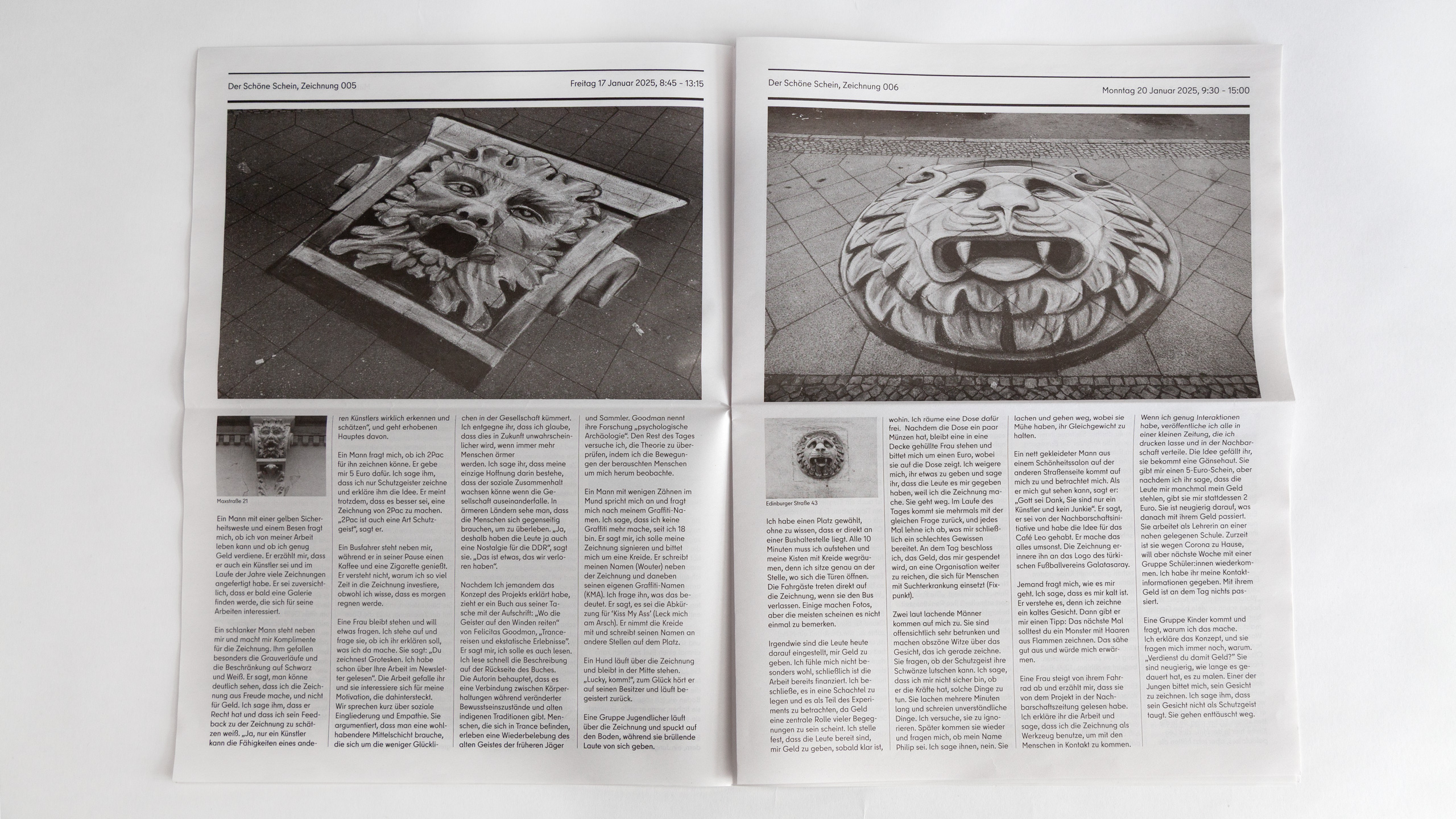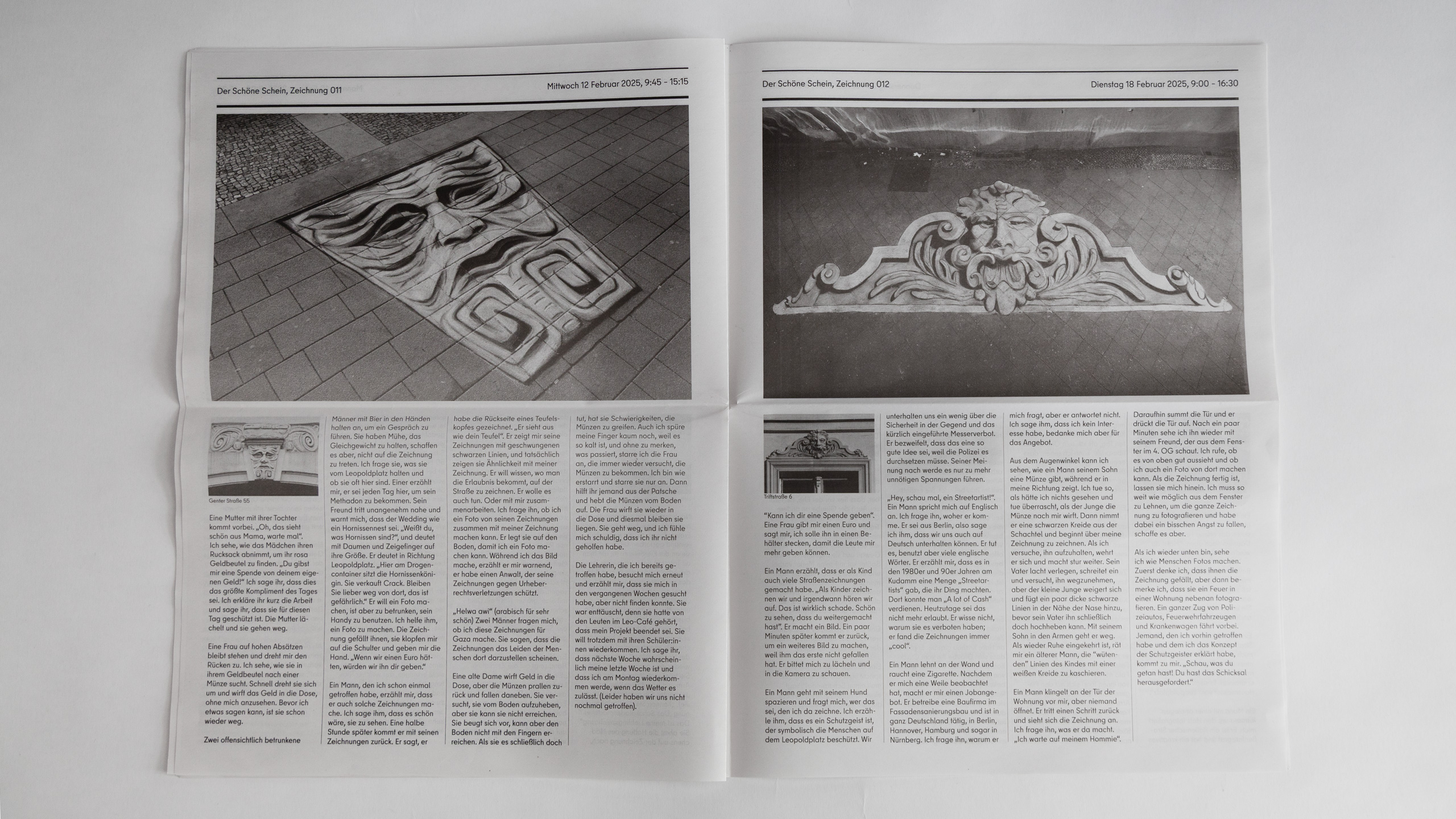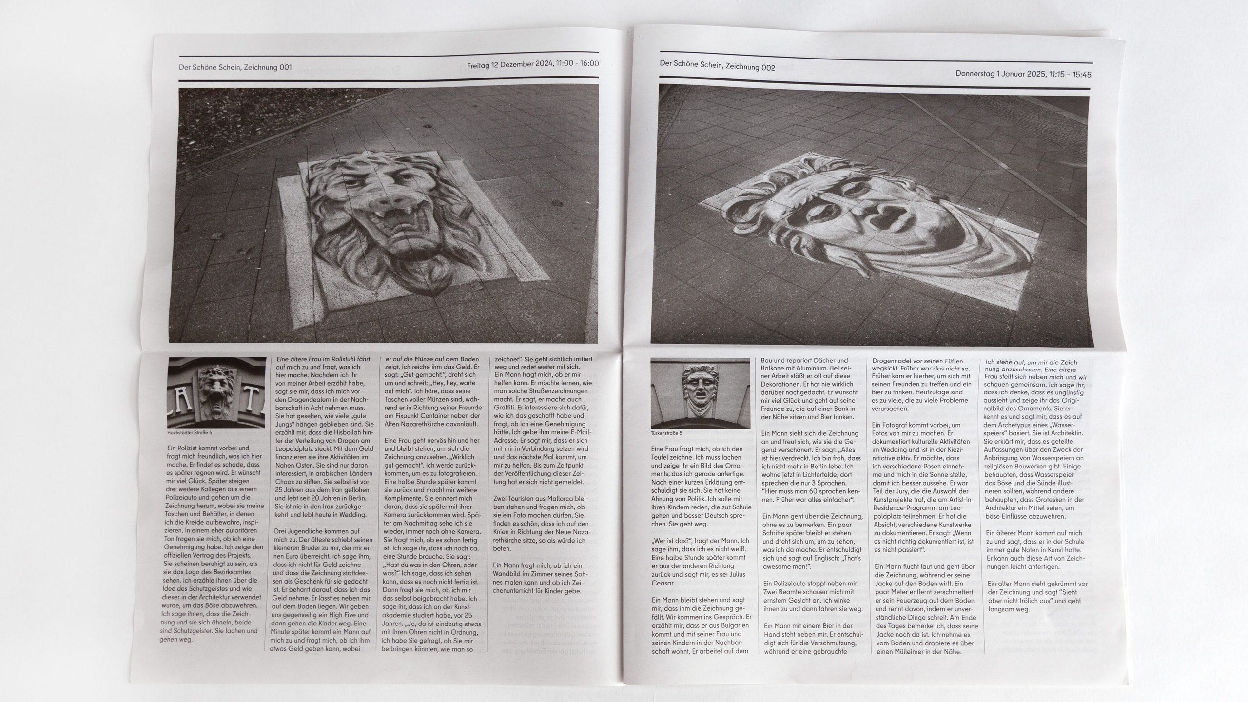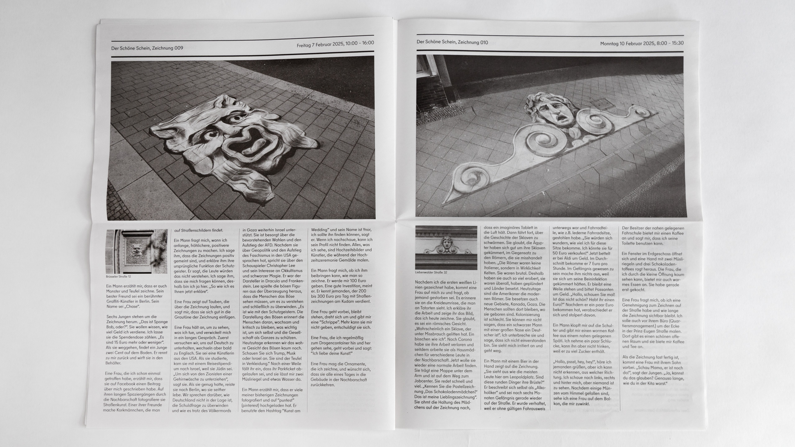 The publication presents a selection of the encounters that took place during the production of the work. Some of these interactions were silent, others turned into longer conversations. Sometimes people expressed their frustration, but more often they gave money or something to eat and drink. At the end of the project, the publication was distributed in the neighbourhood around Leopoldplatz.