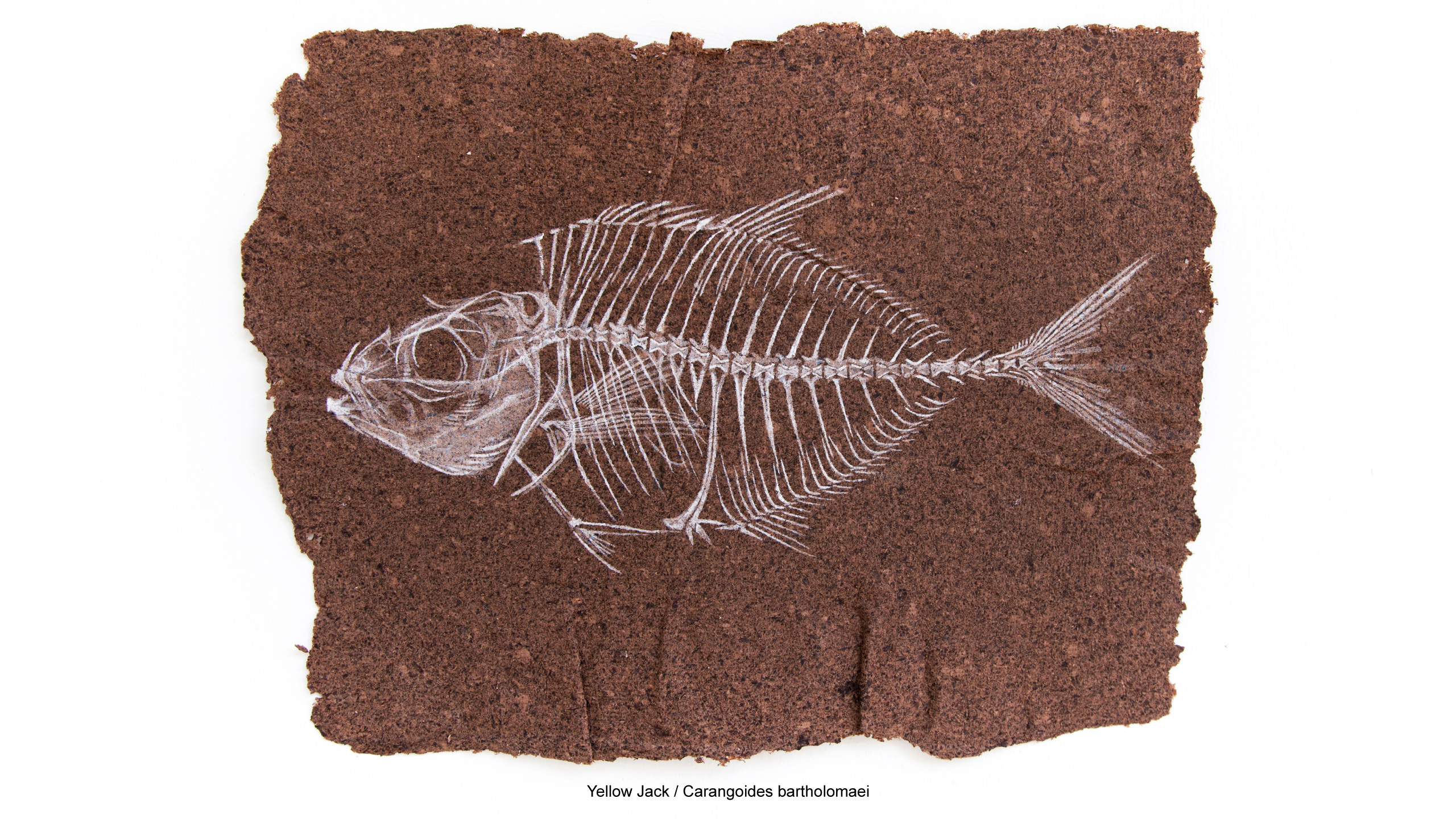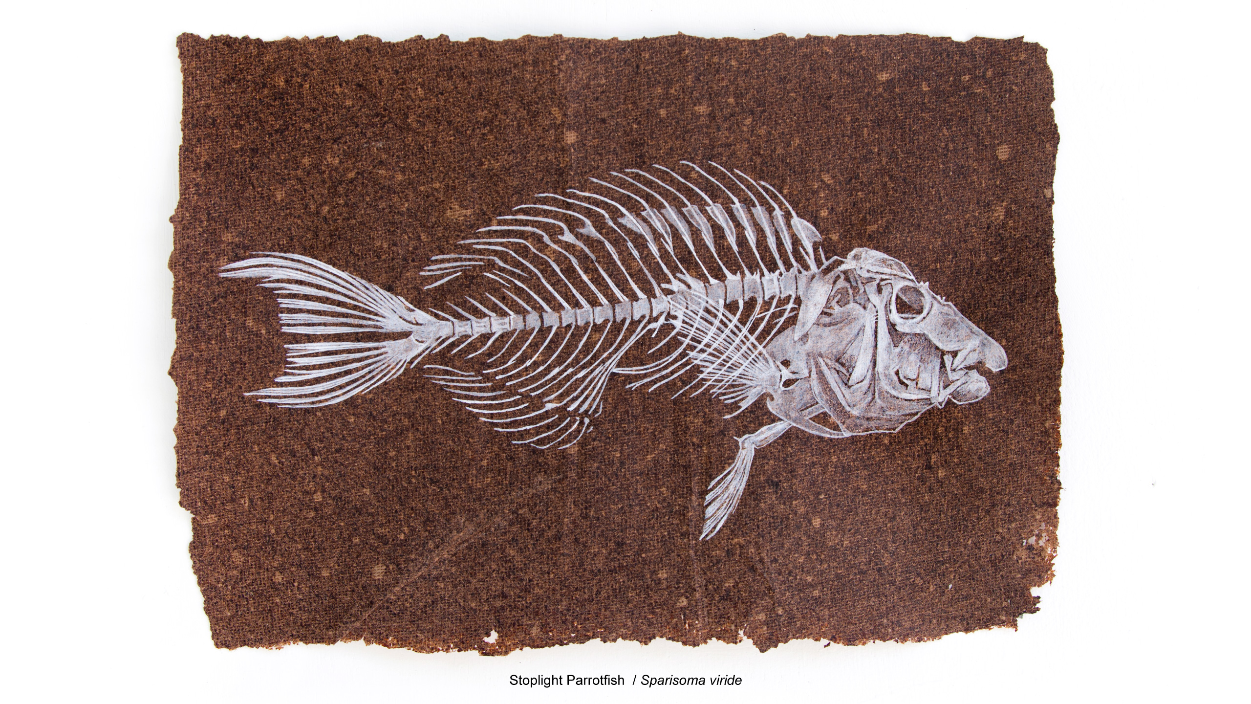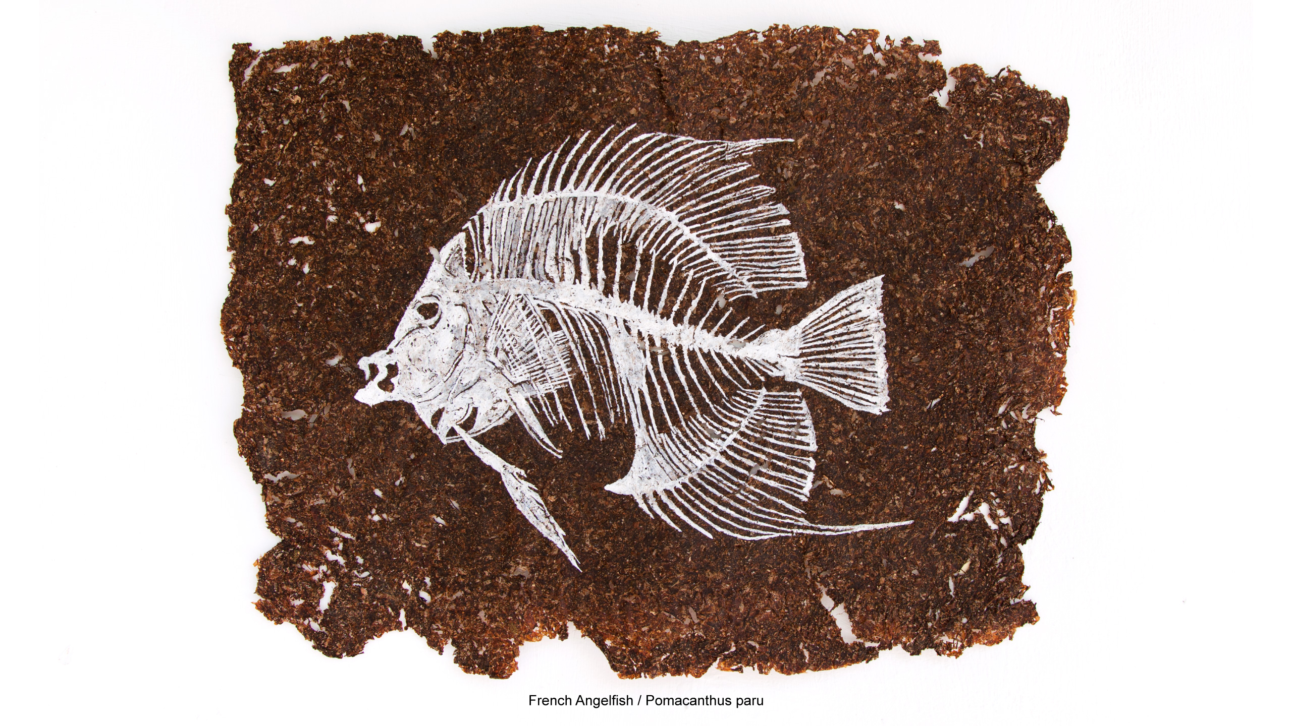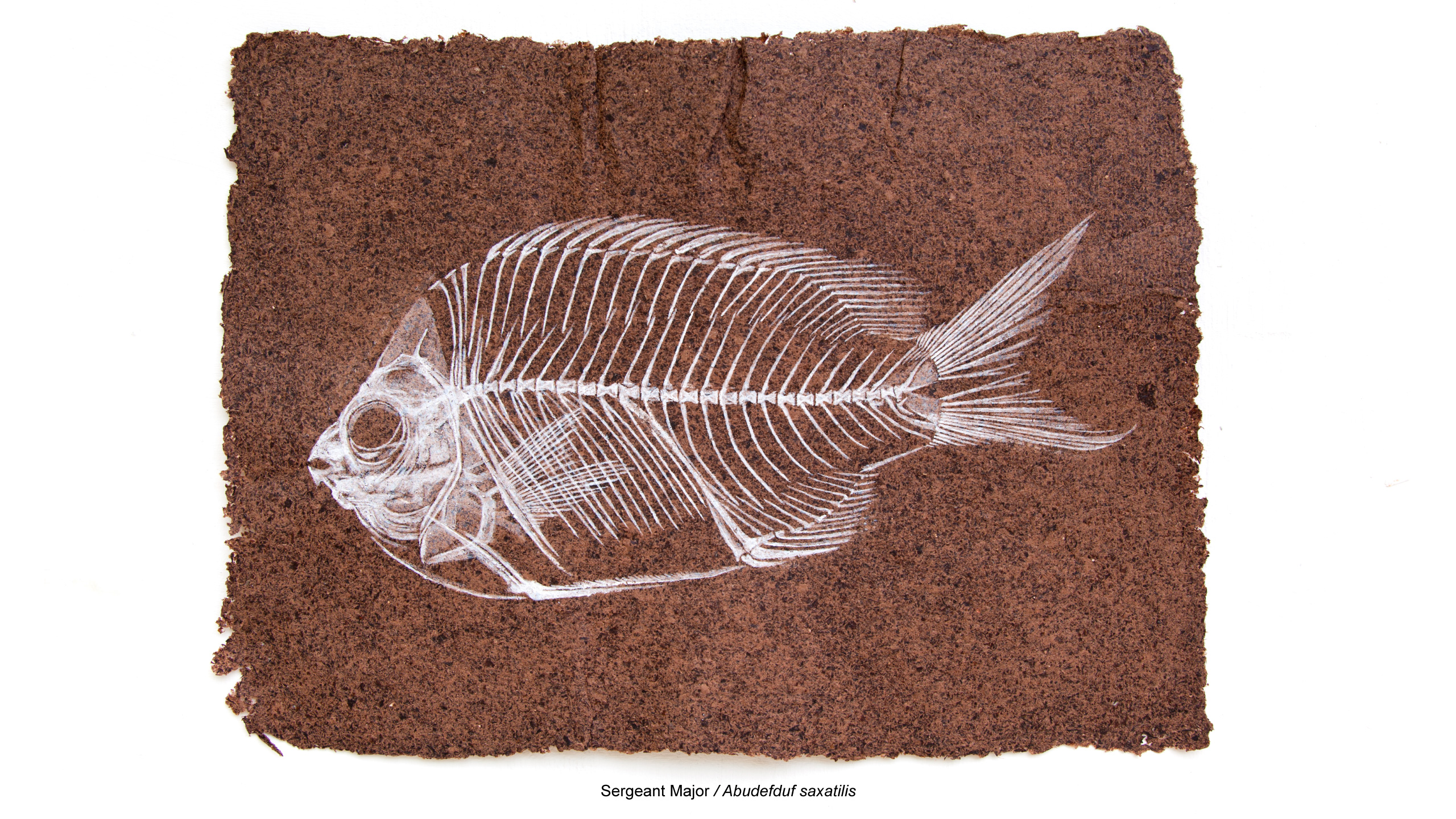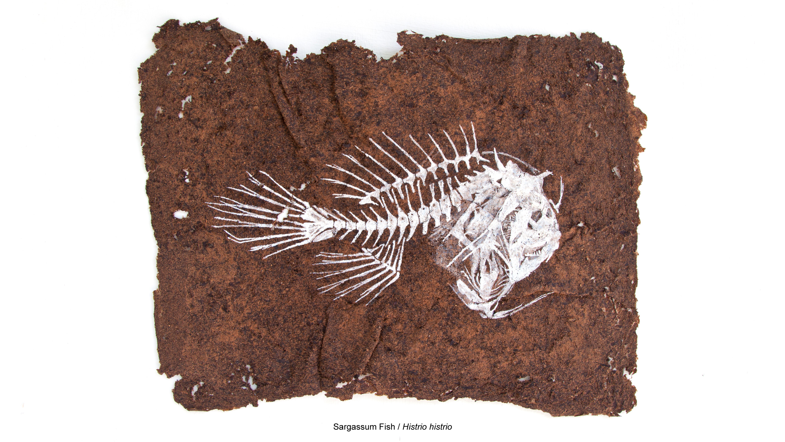 The images of the skeletal remains are painted on paper made from sargassum seaweed and depict species that died as a consequence of the recent influx of sargassum in the Caribbean sea. In total 24 different species are depicted.