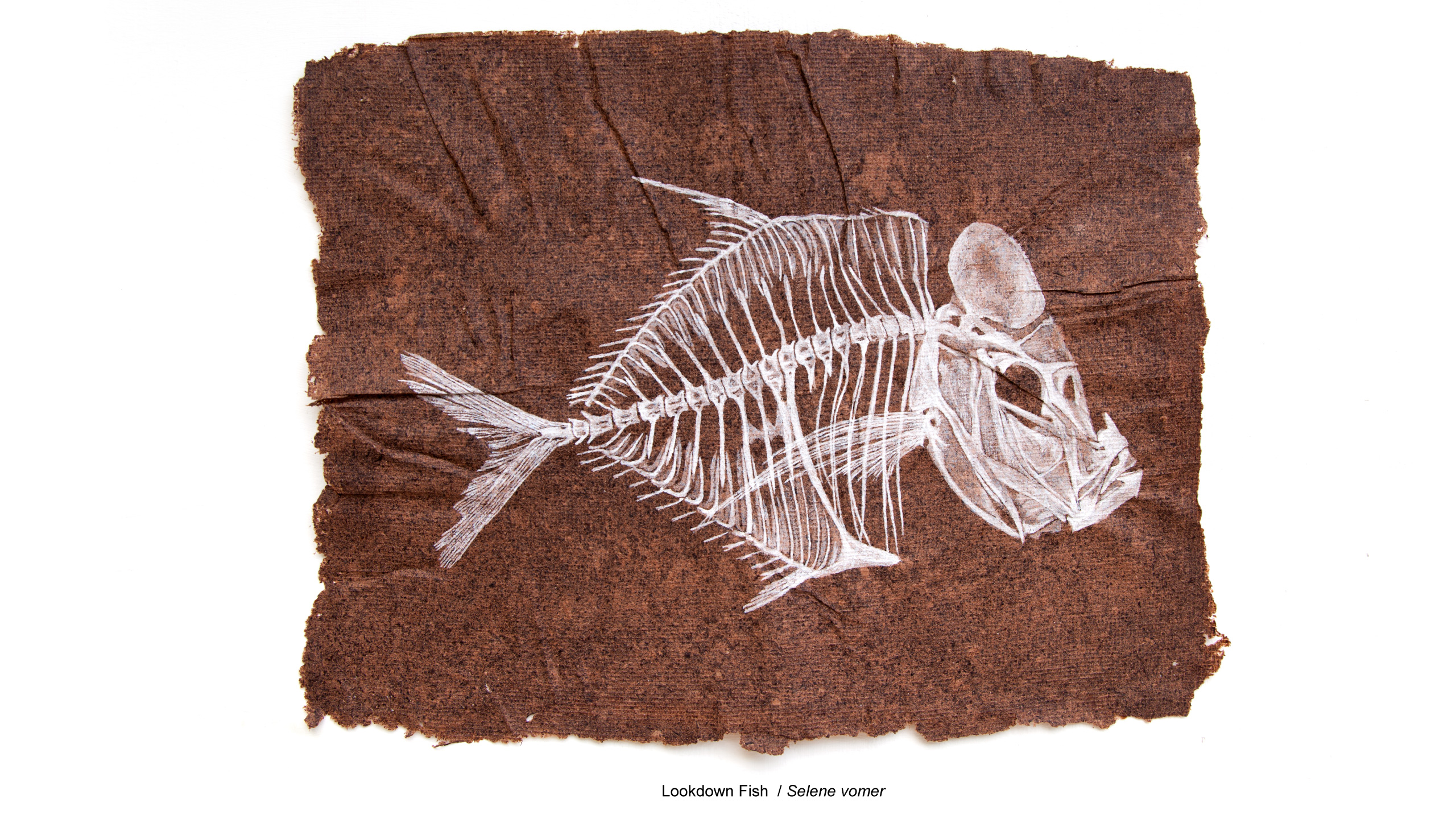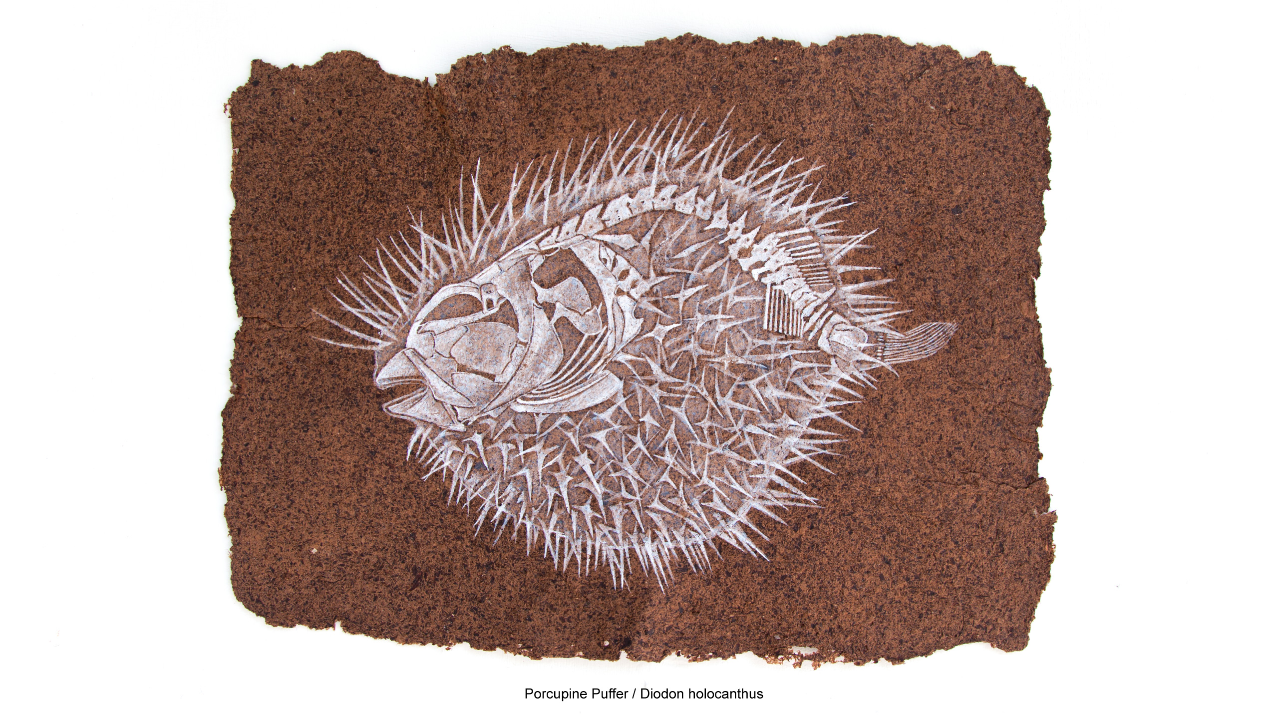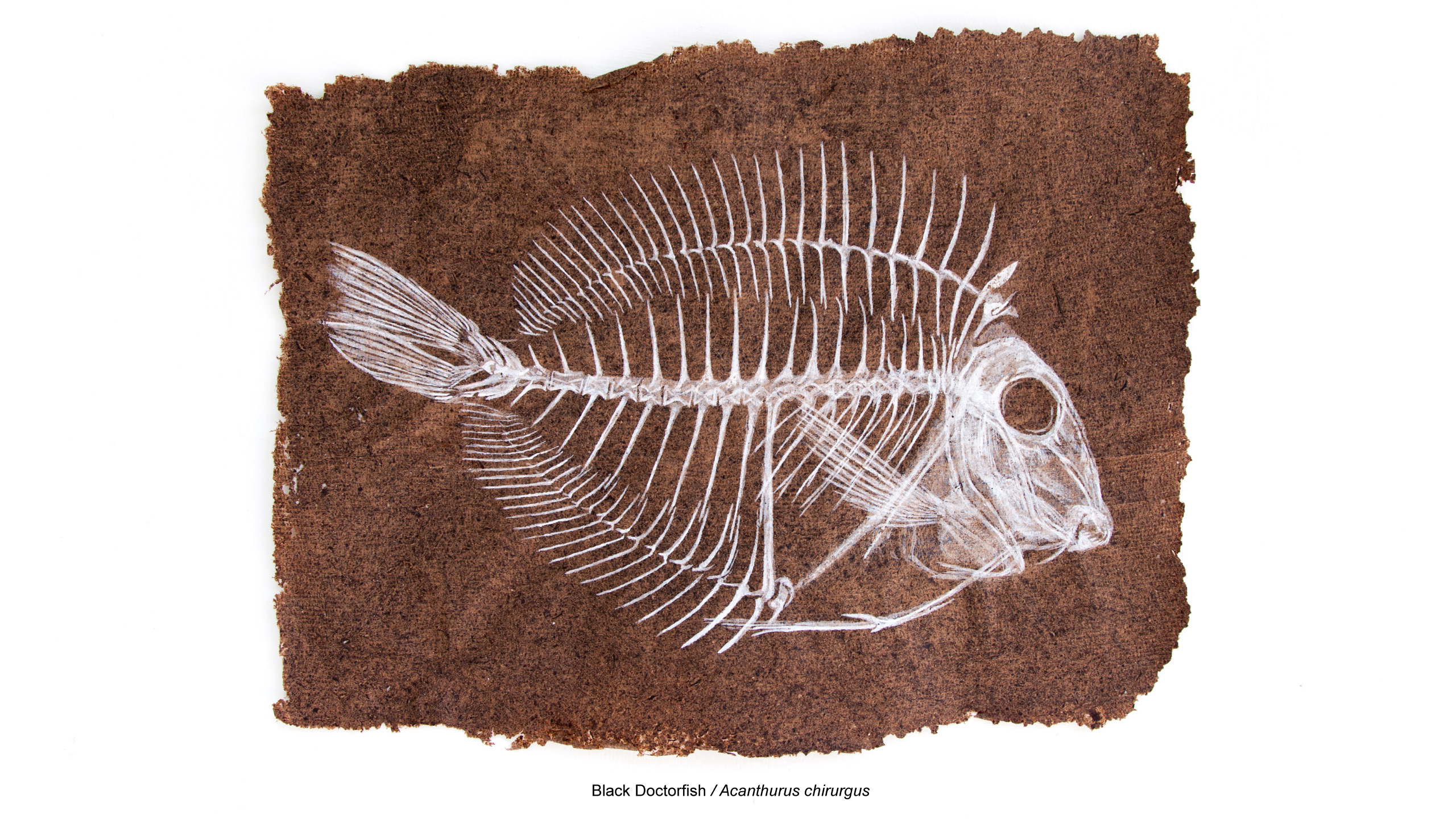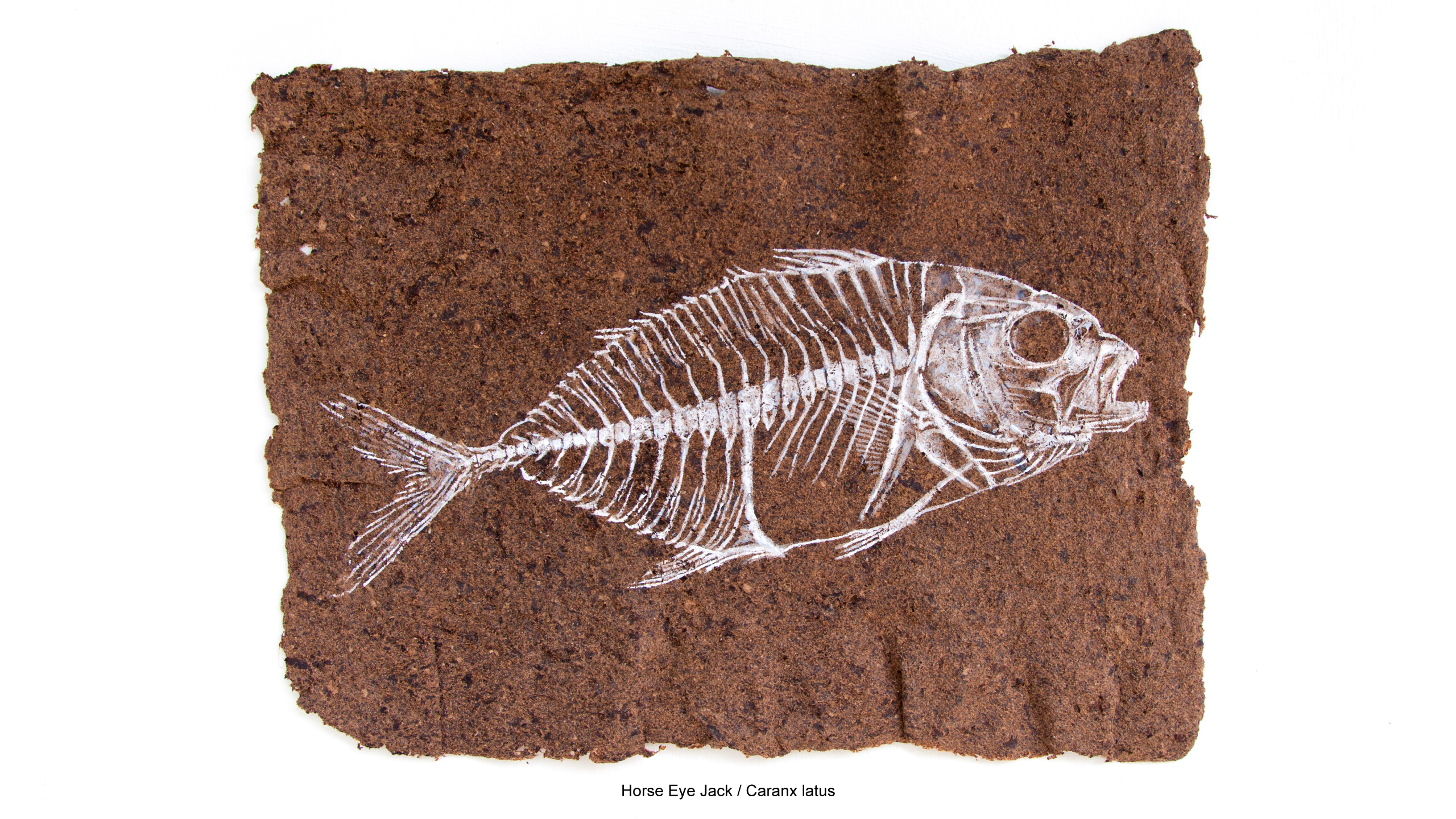 The images of the skeletal remains are painted on paper made from sargassum seaweed and depict species that died as a consequence of the recent influx of sargassum in the Caribbean sea. In total 24 different species are depicted.