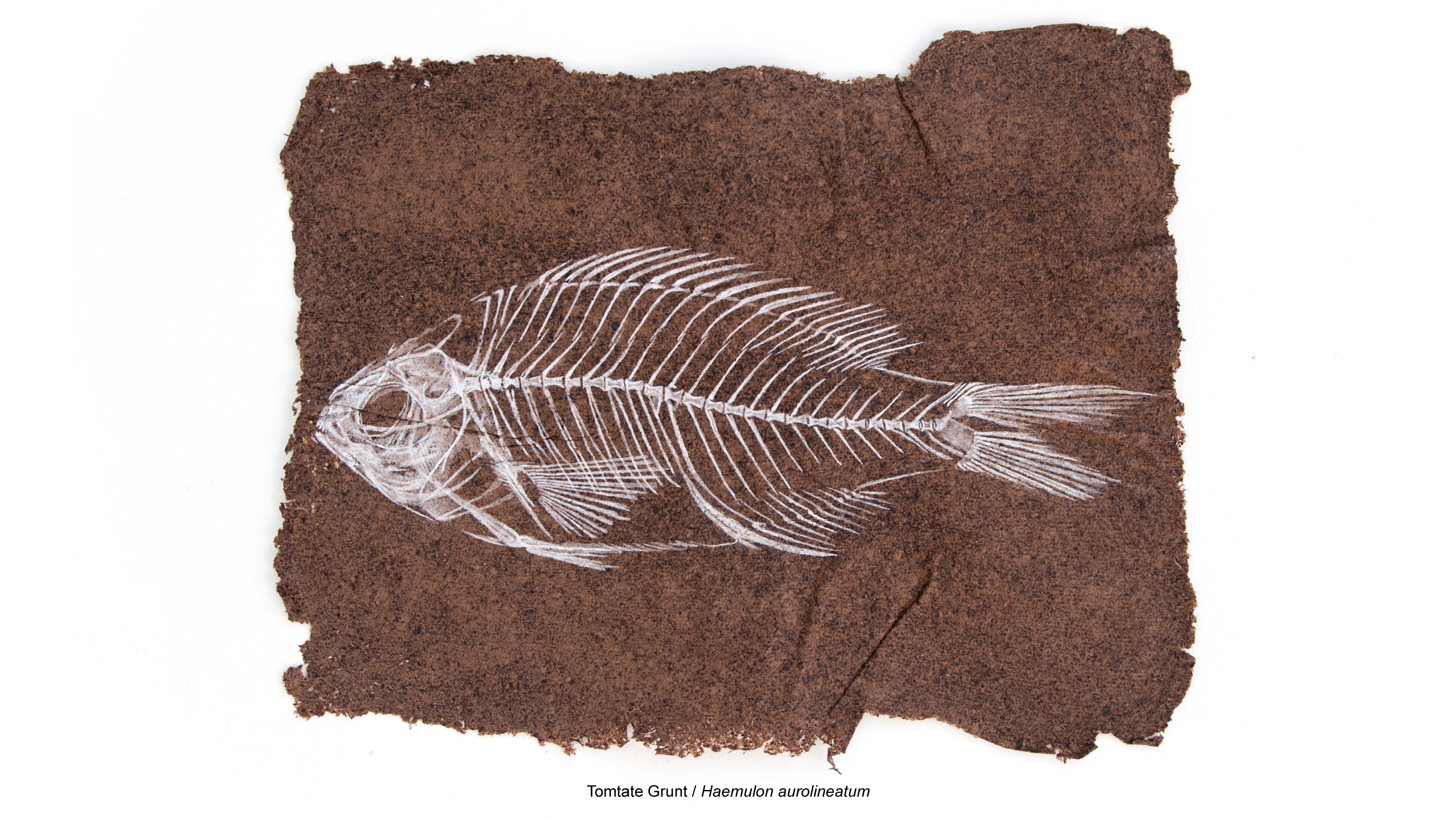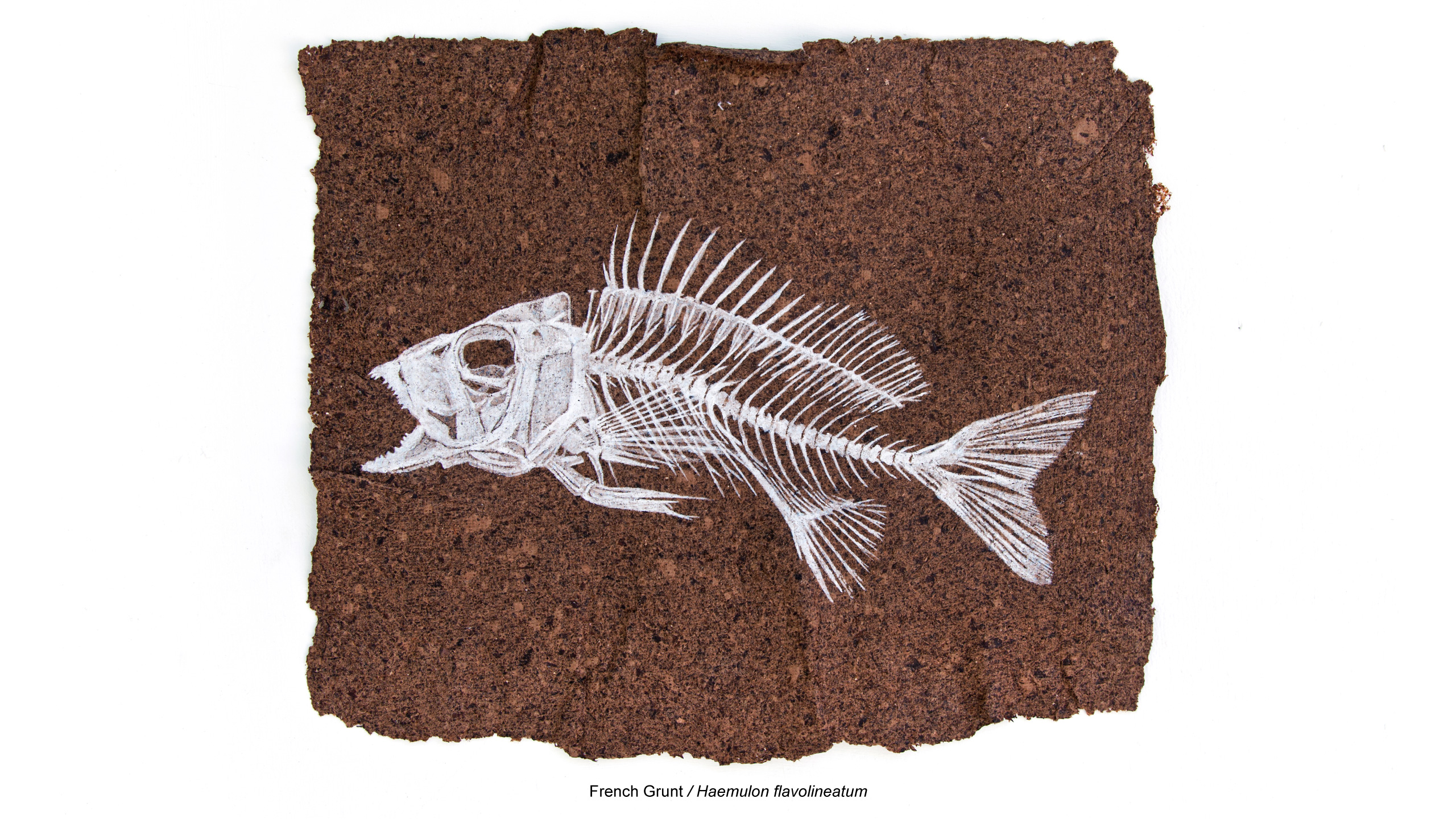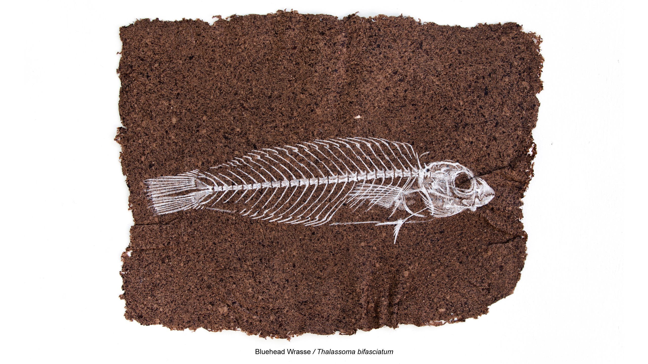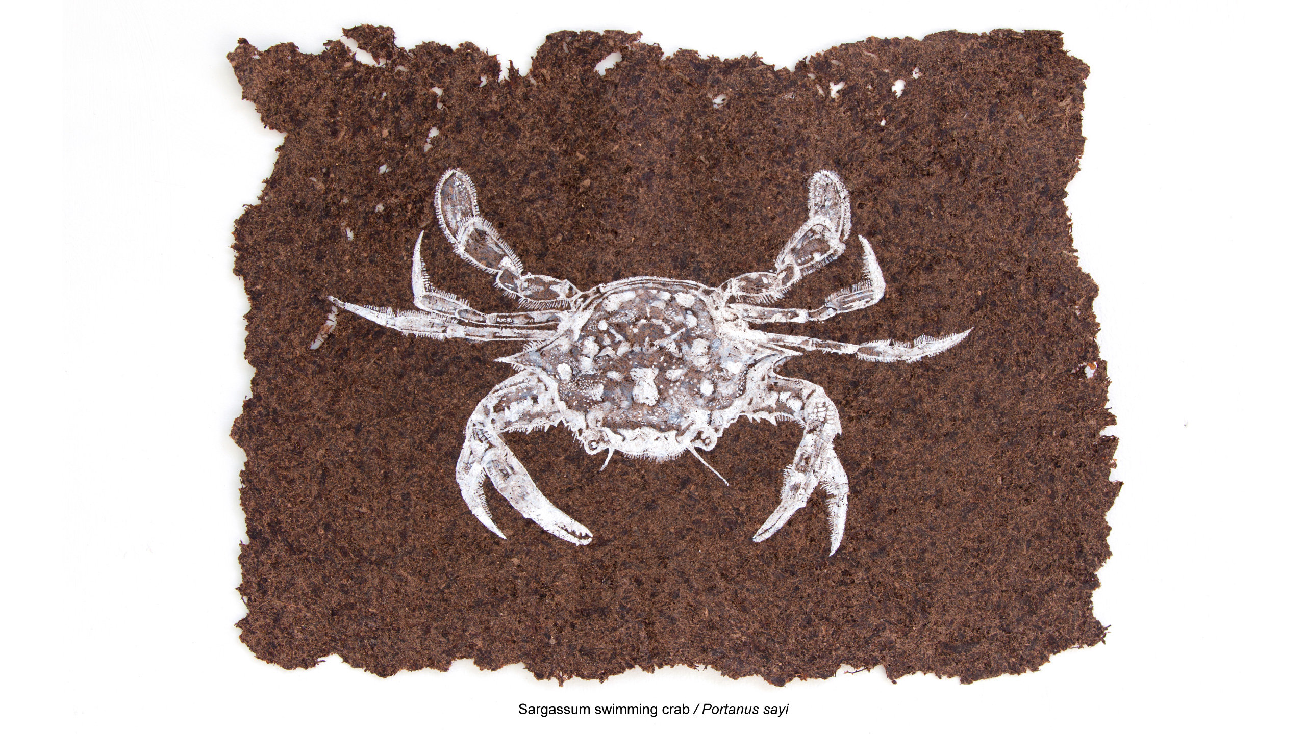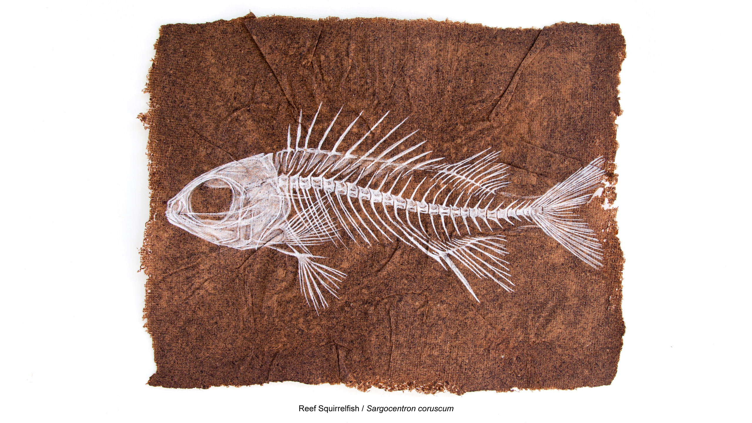 The images of the skeletal remains are painted on paper made from sargassum seaweed and depict species that died as a consequence of the recent influx of sargassum in the Caribbean sea. In total 24 different species are depicted.