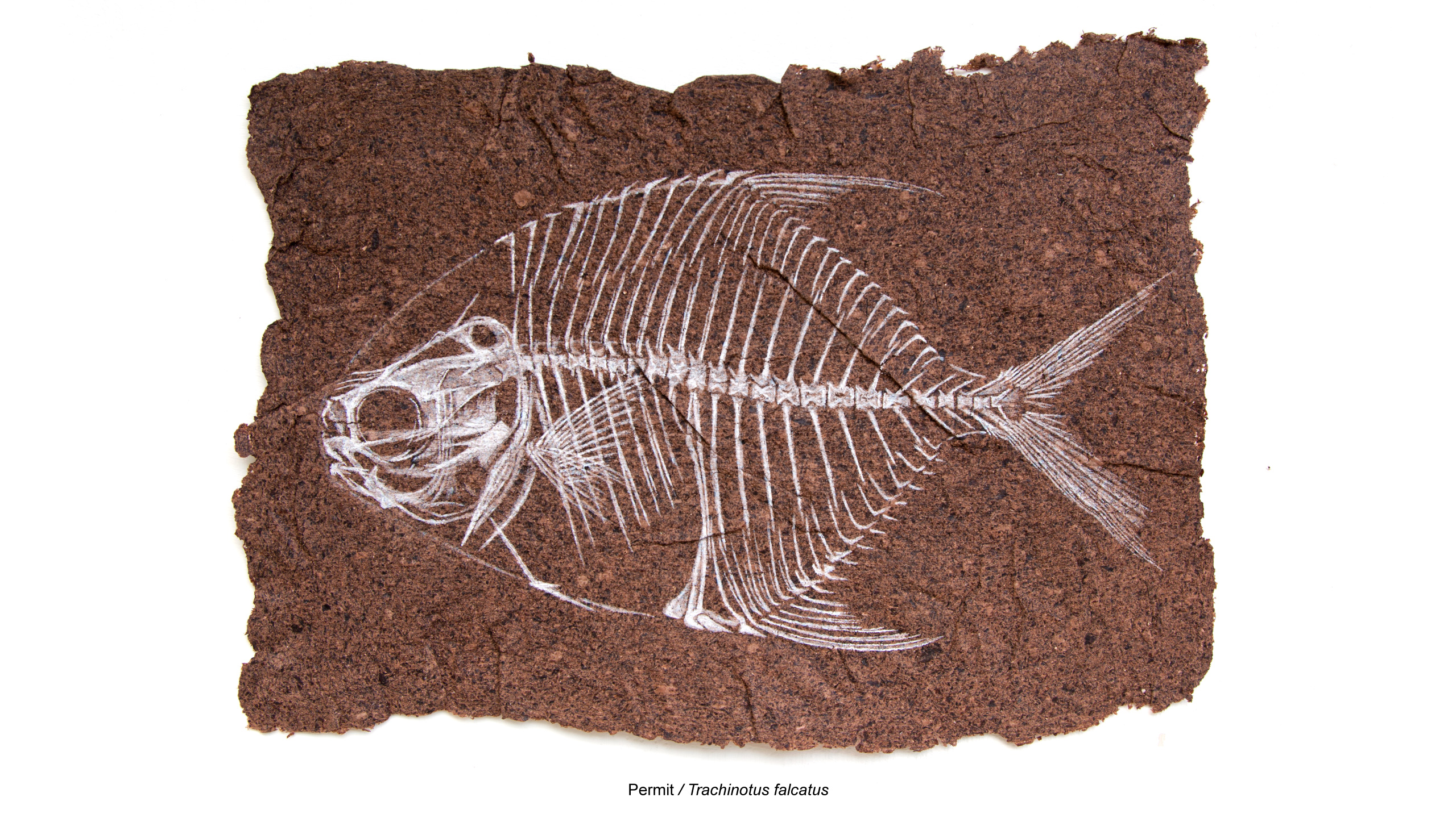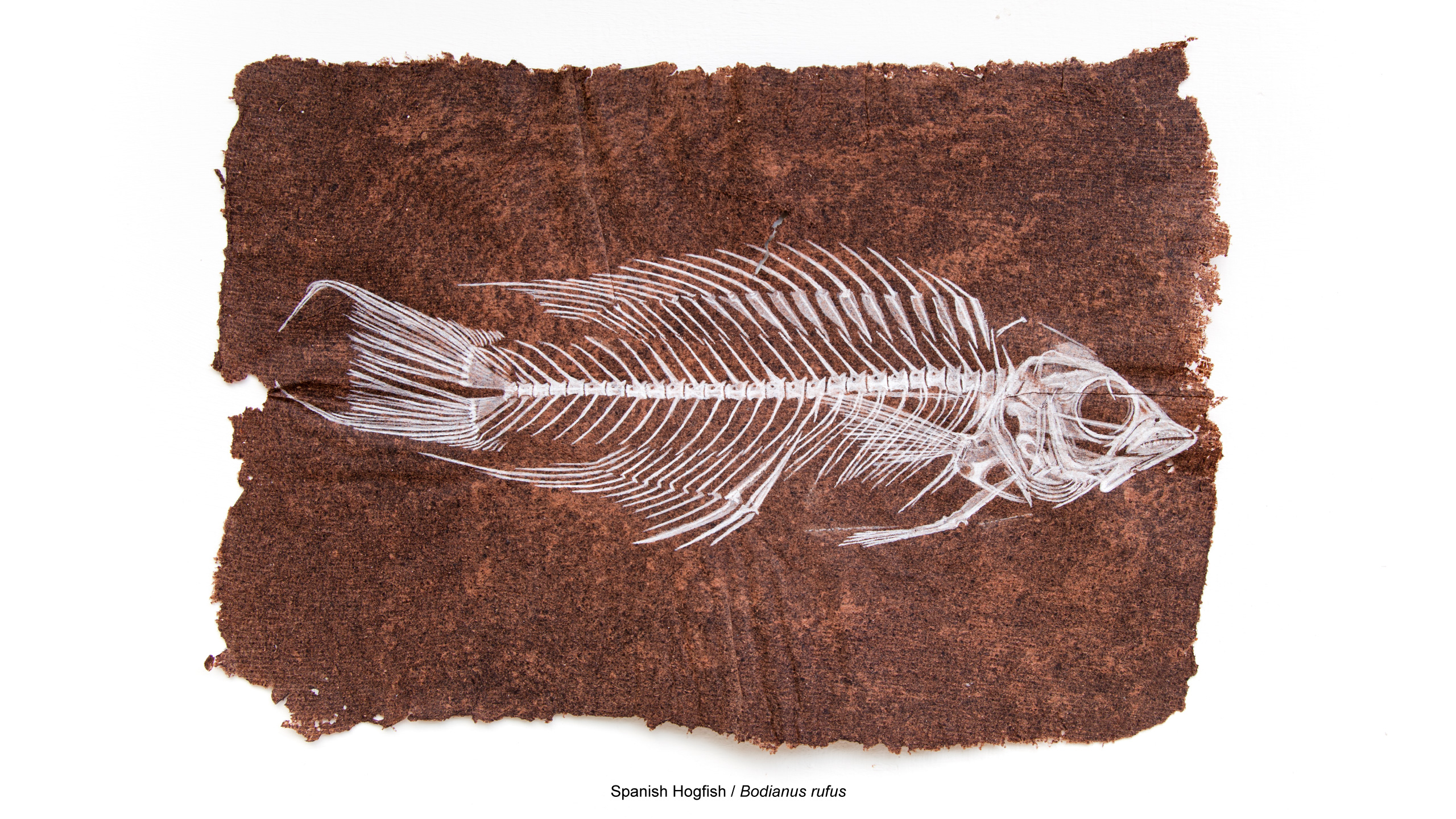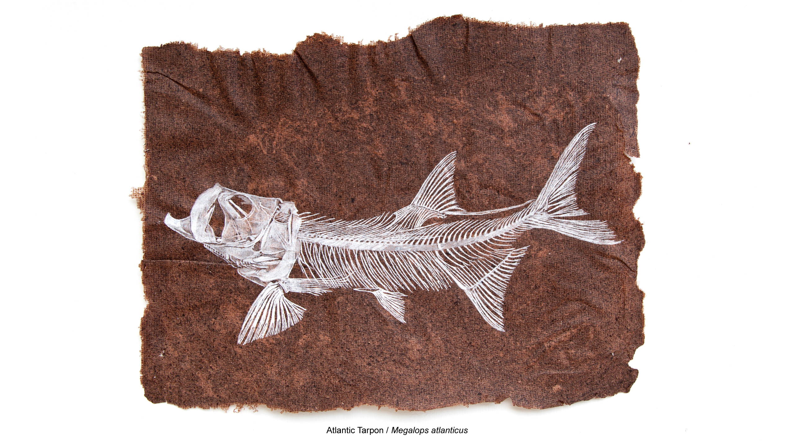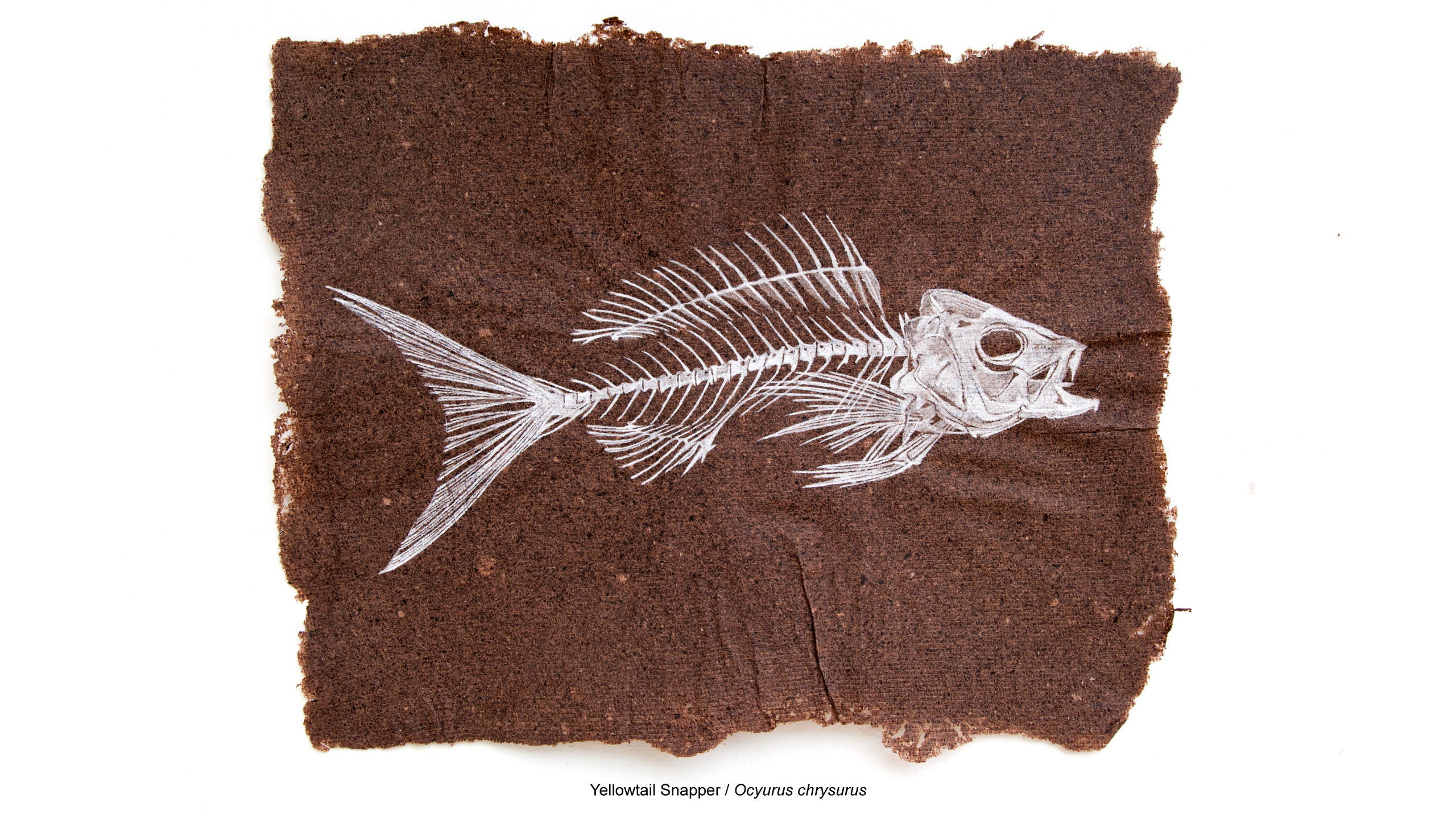 The images of the skeletal remains are painted on paper made from sargassum seaweed and depict species that died as a consequence of the recent influx of sargassum in the Caribbean sea. In total 24 different species are depicted.