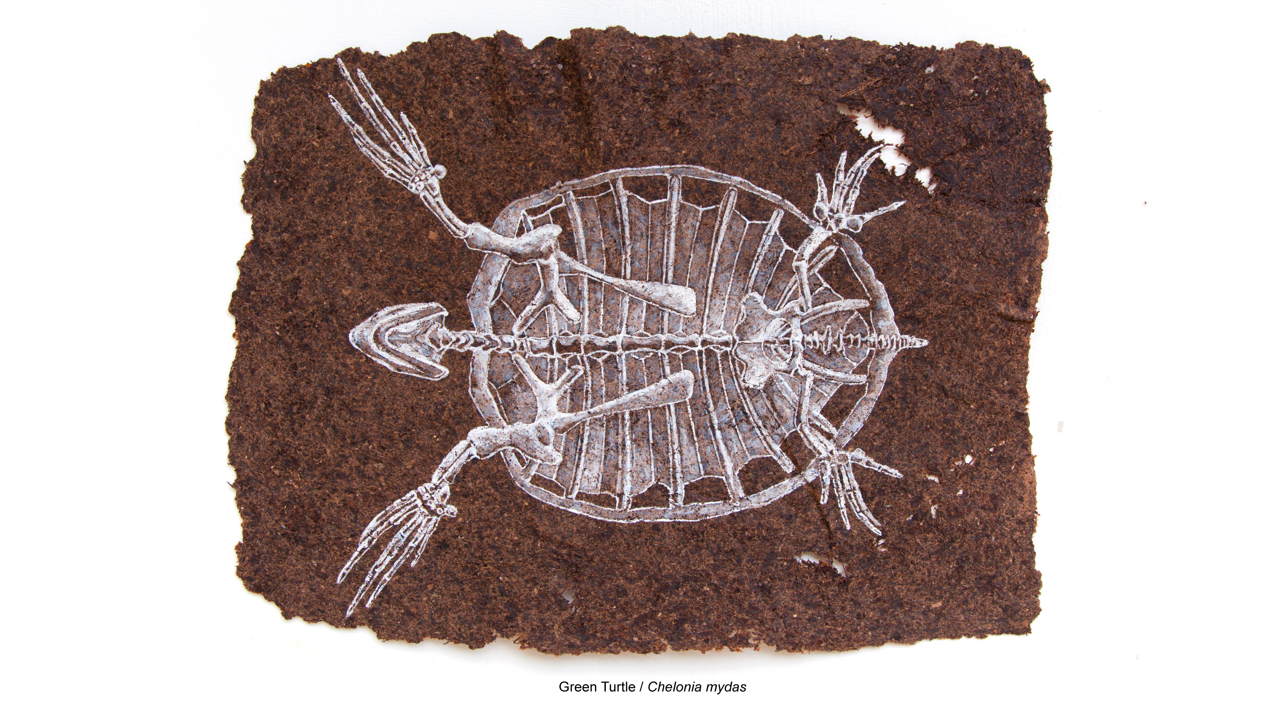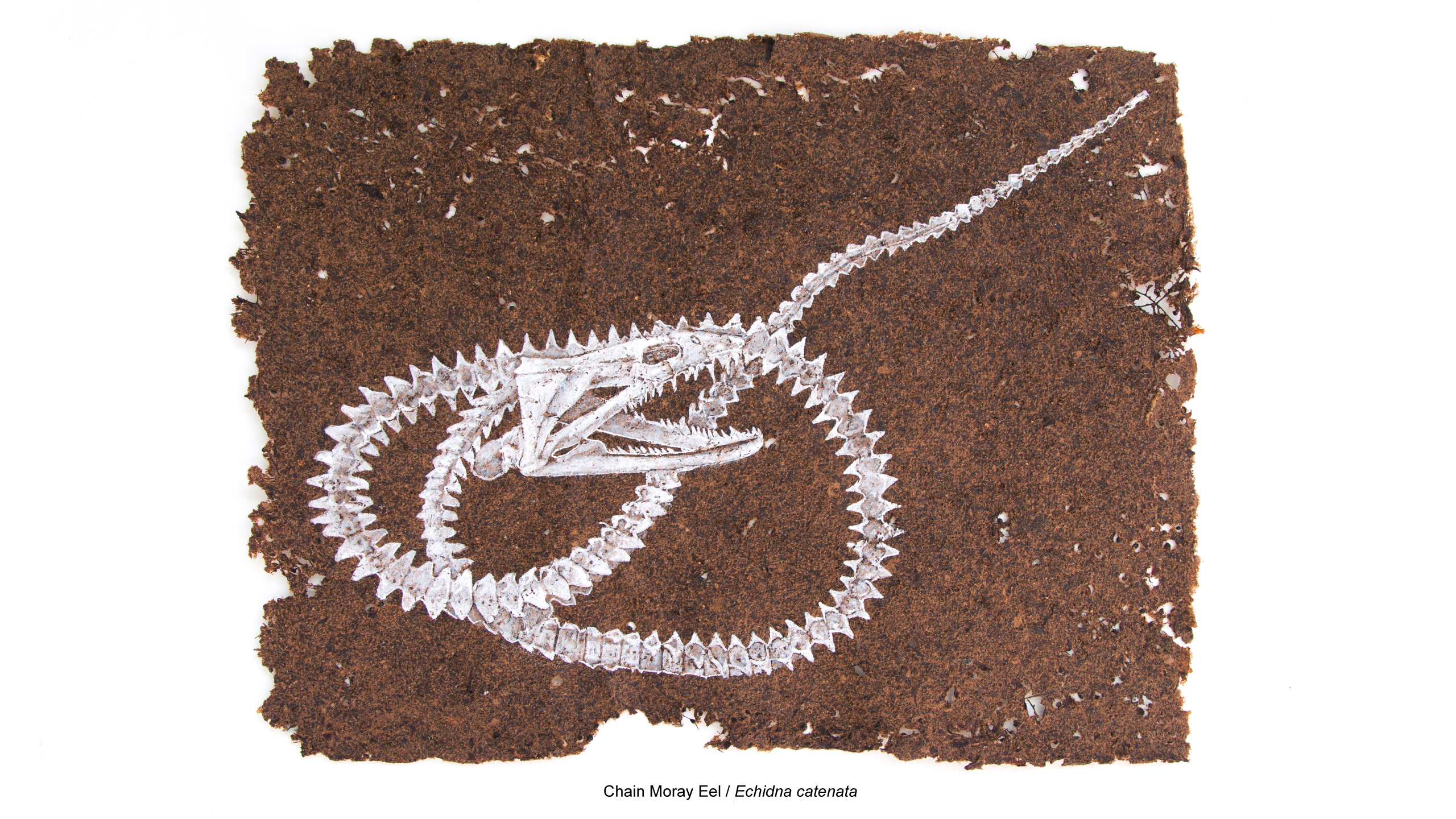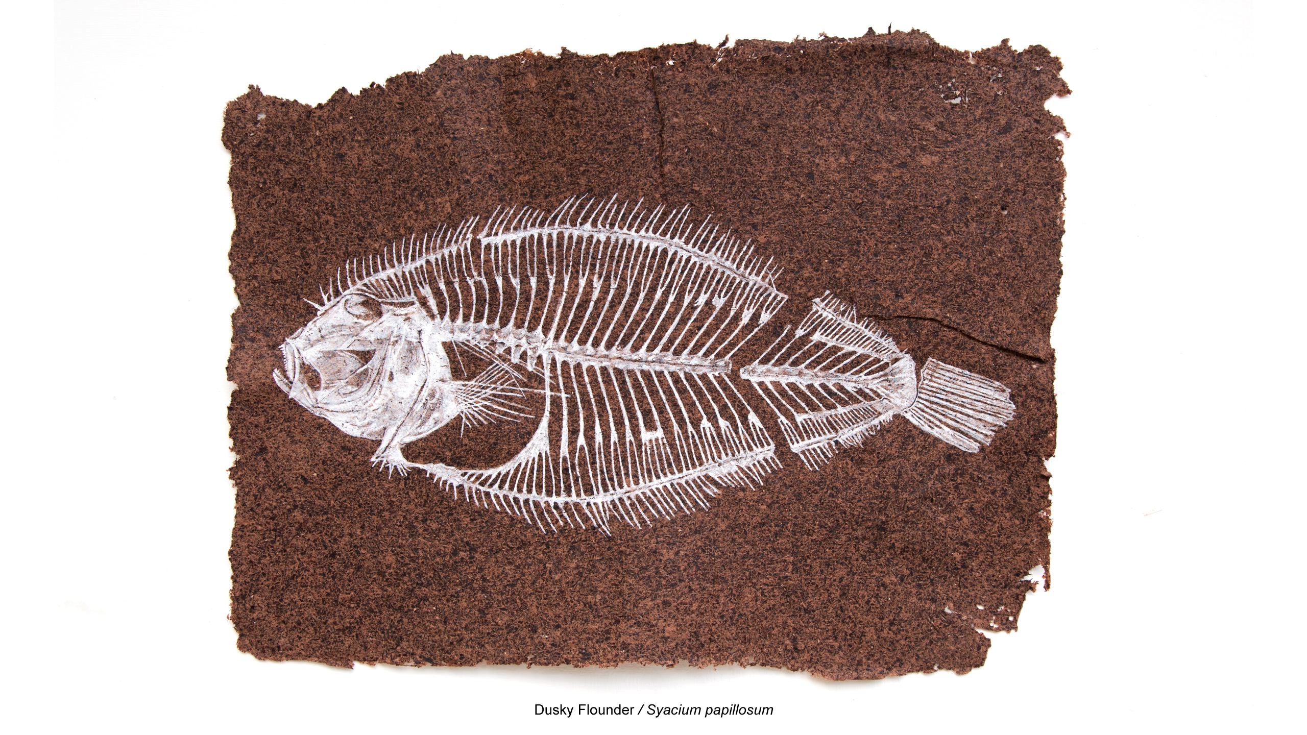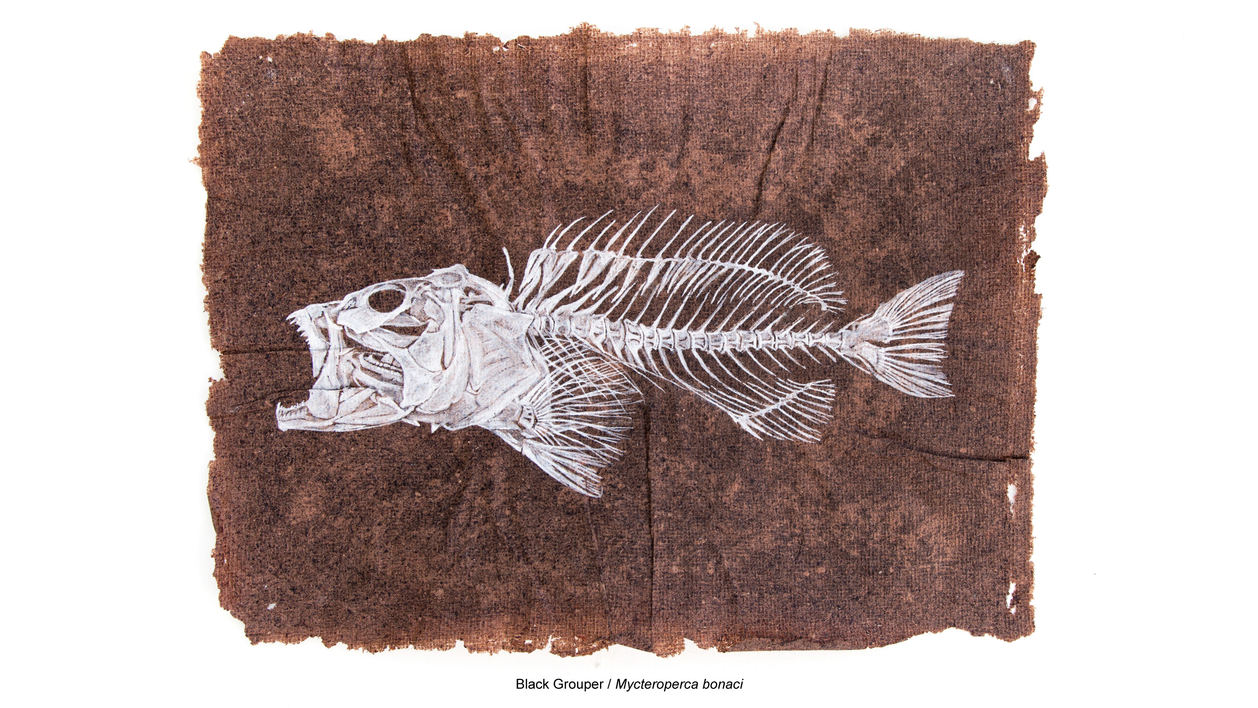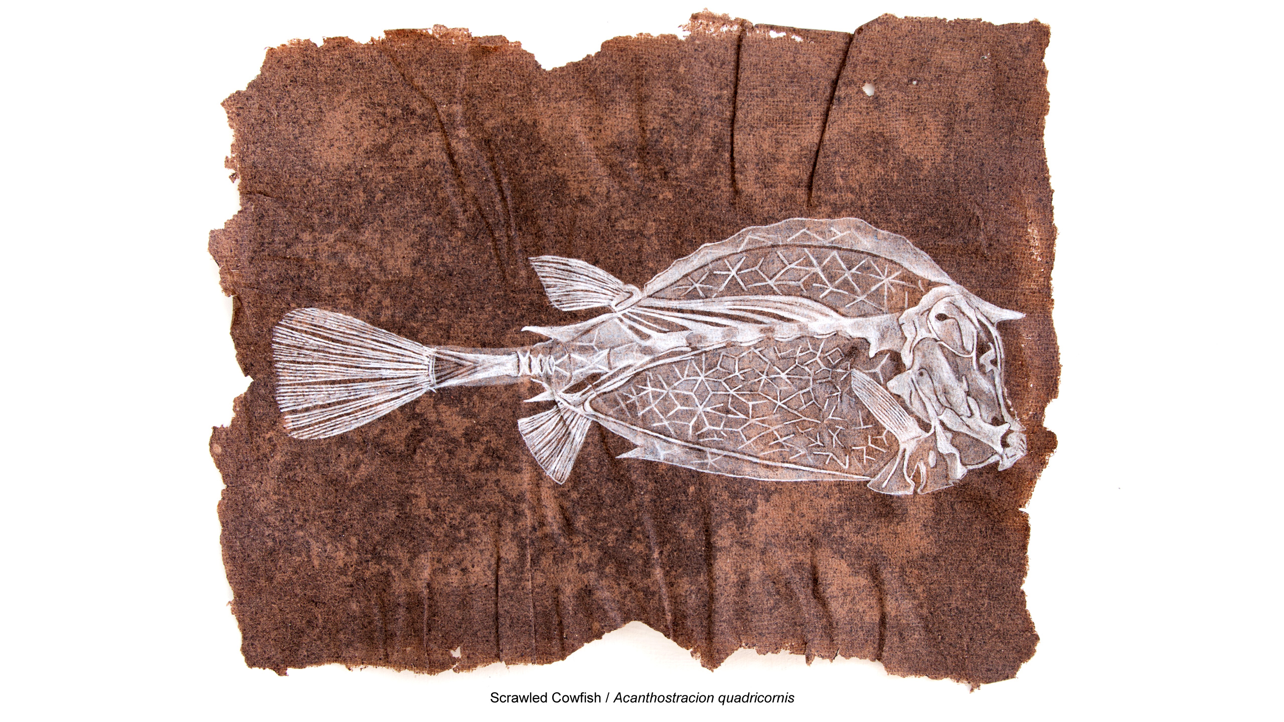 The images of the skeletal remains are painted on paper made from sargassum seaweed and depict species that died as a consequence of the recent influx of sargassum in the Caribbean sea. In total 24 different species are depicted.