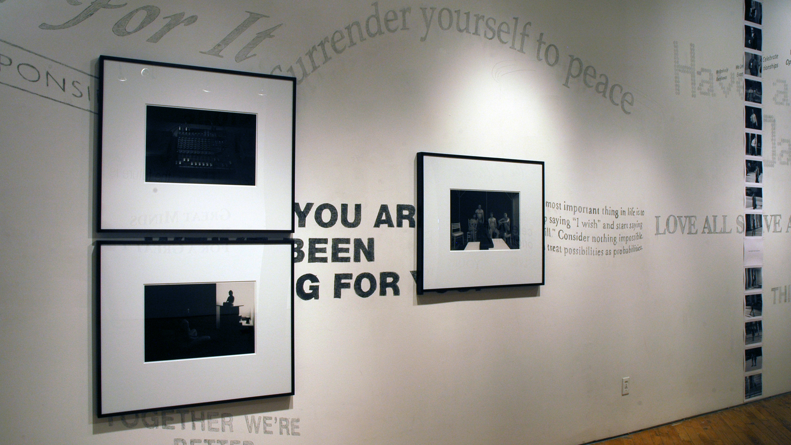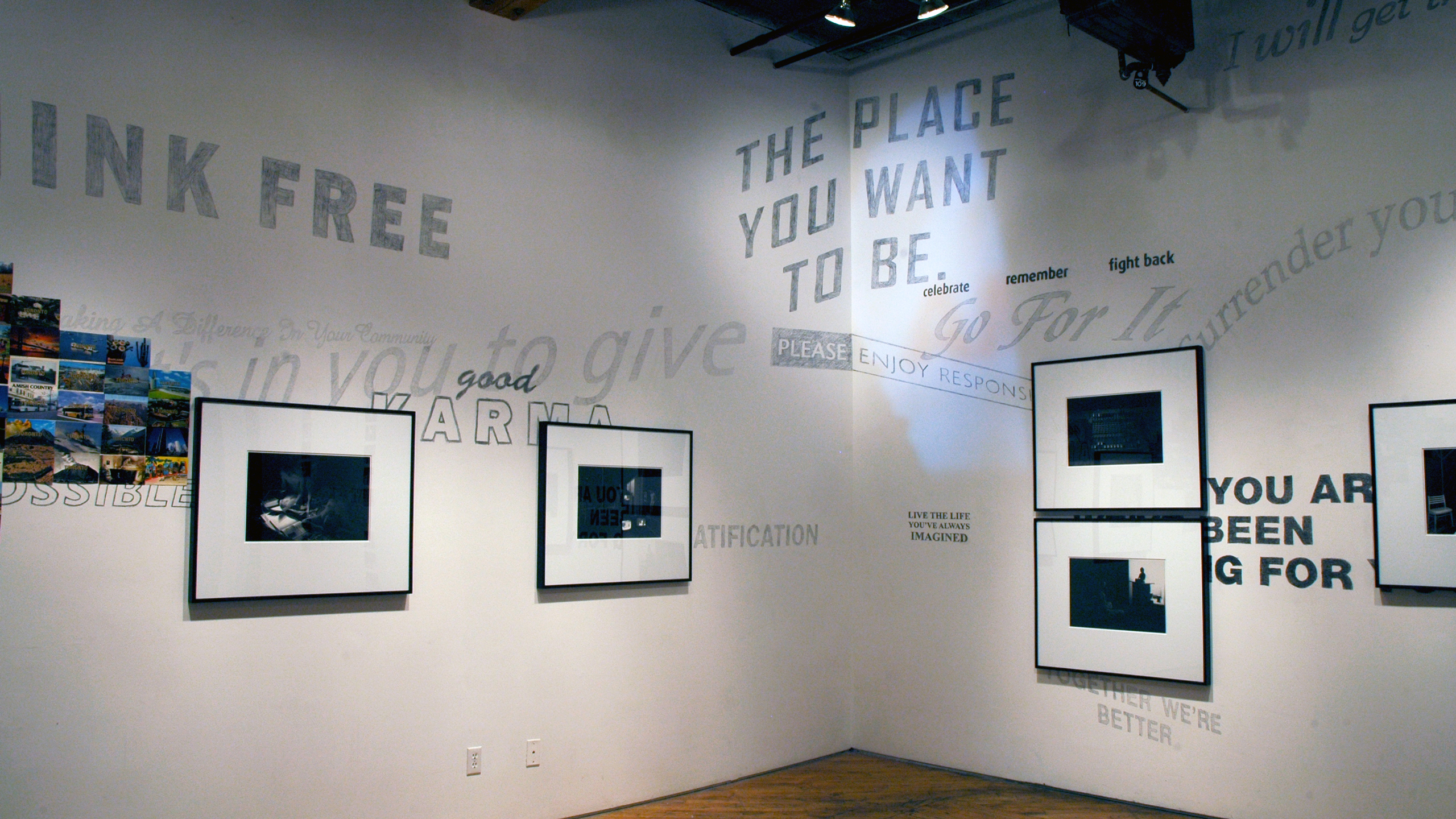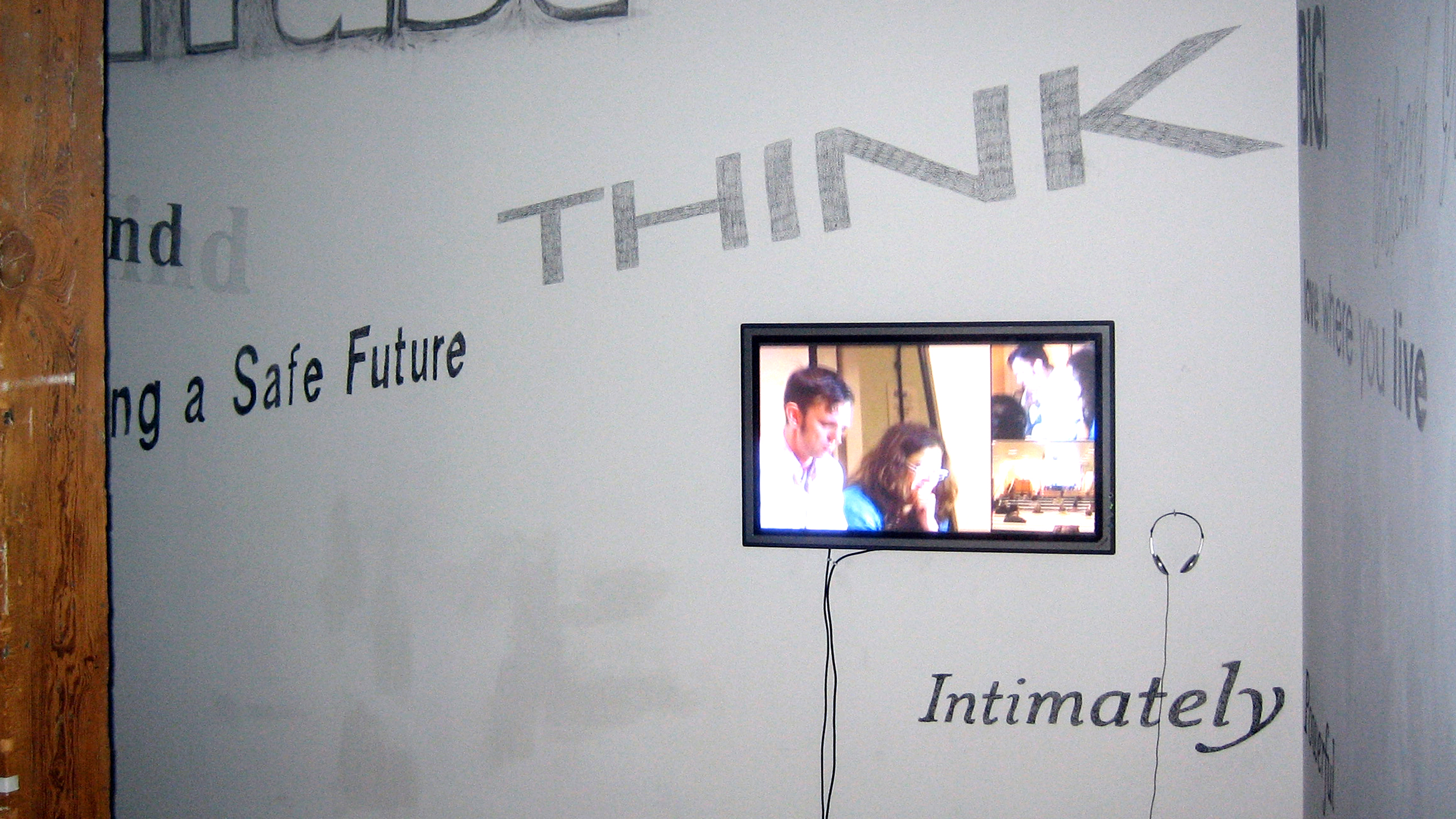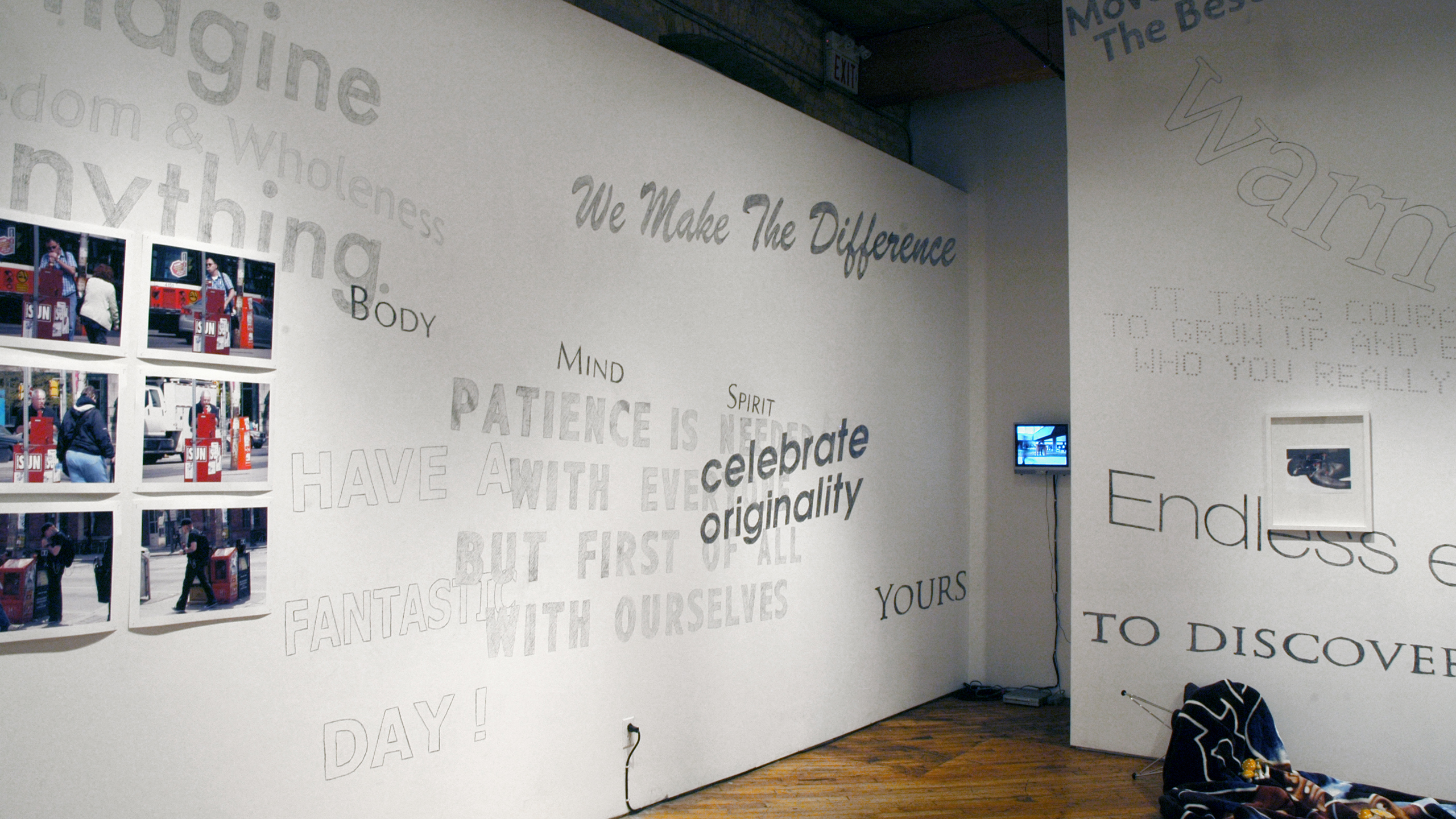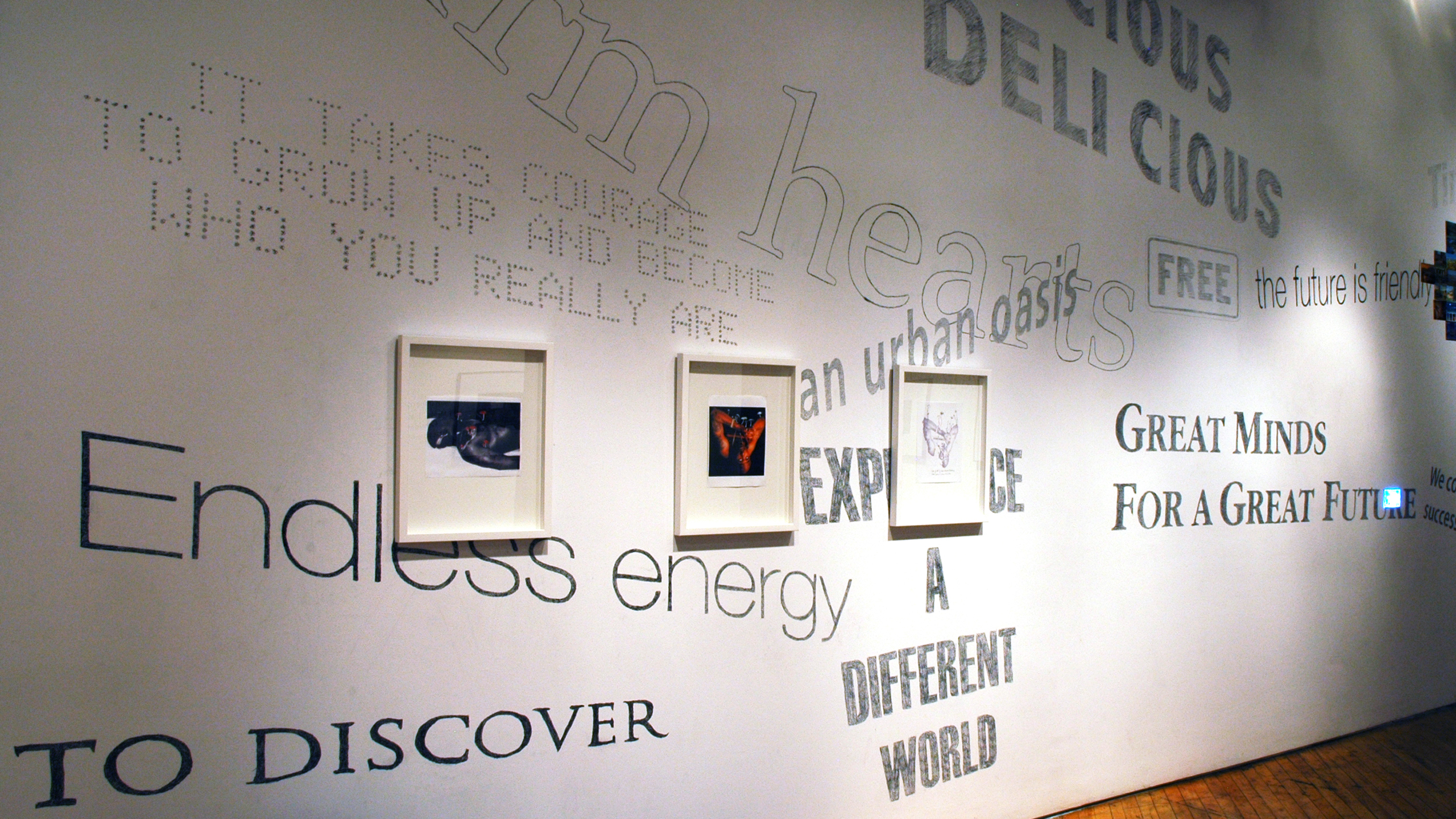 The video is shown during a group exhibition at YYZ Gallery in Toronto from 02.05.2008 – 14.06.2008. The collection of slogans were used to cover the walls of the gallery space. They formed the backdrop of the exhibition.