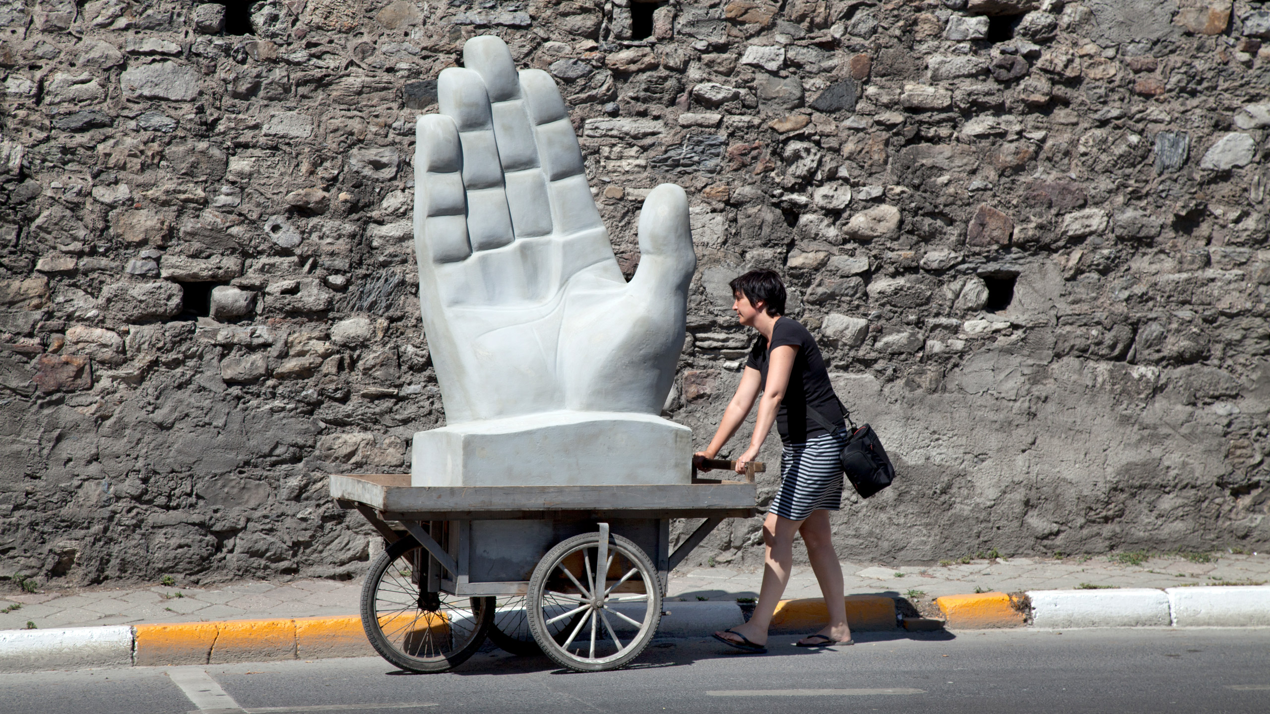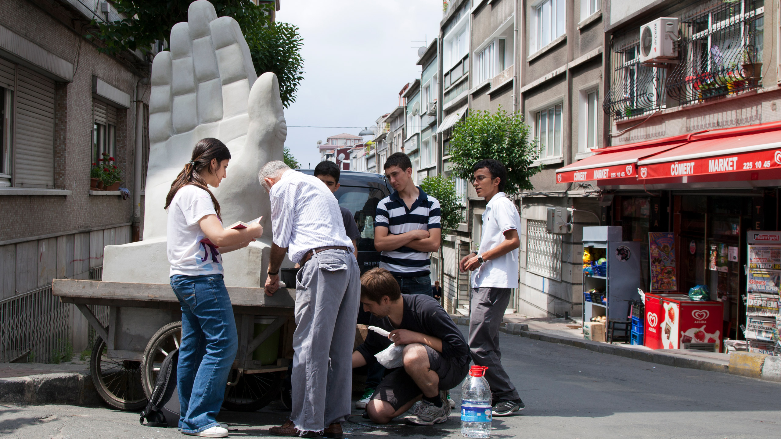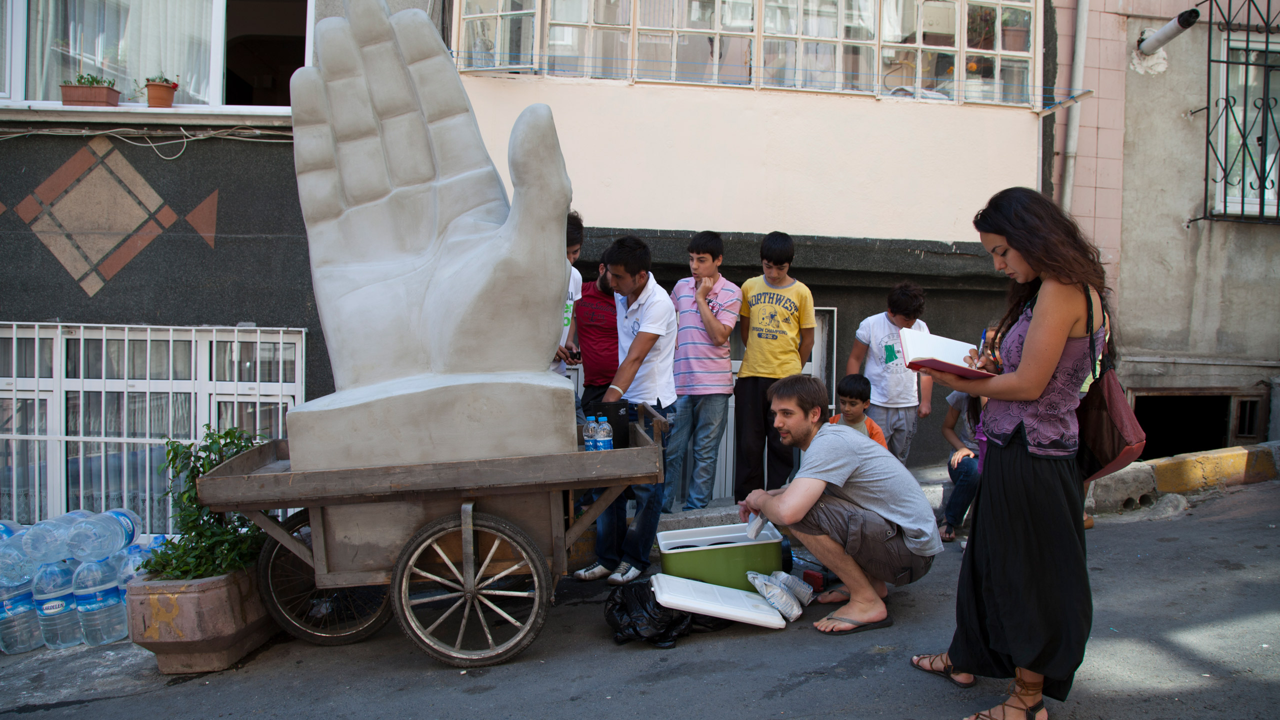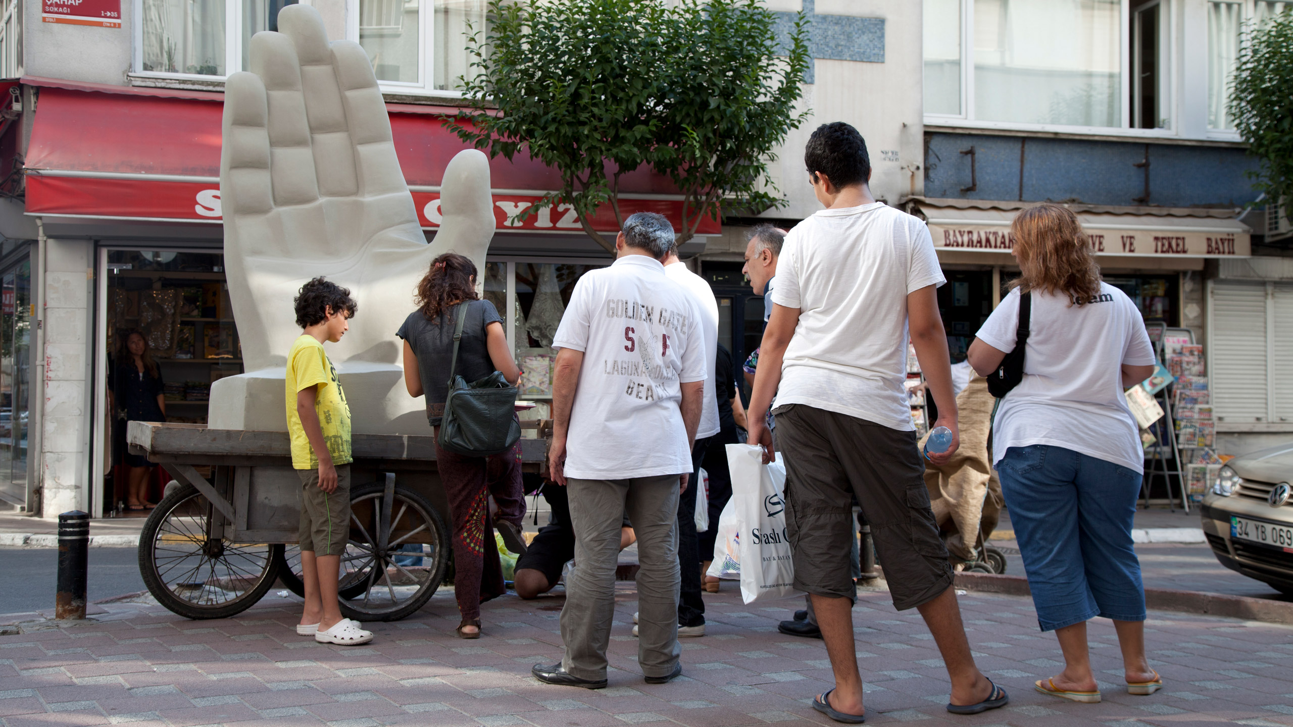 (Turkish for Monument to Humanity – Helping Hands) dealt with the demolition of a controversial monument in Kars, 2011. The project tried to offer a stage for a public debate on the topic through the construction of an alternative monument. A mobile studio was used as a catalyst for engaging the citizenry. While wheeling the cart through different neighborhoods in Istanbul, passersby were asked to lend a helping hand and contribute to the construction of a new monument. They were interviewed and a plaster copy of one of their hands was made. The plaster hands served as the building blocks for the new monument. After this intervention, the hands were installed on the site of the demolished sculpture. The interviews were published in a publication, together with pictures of the process.