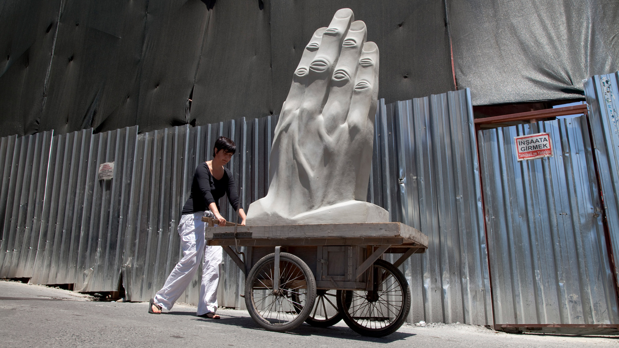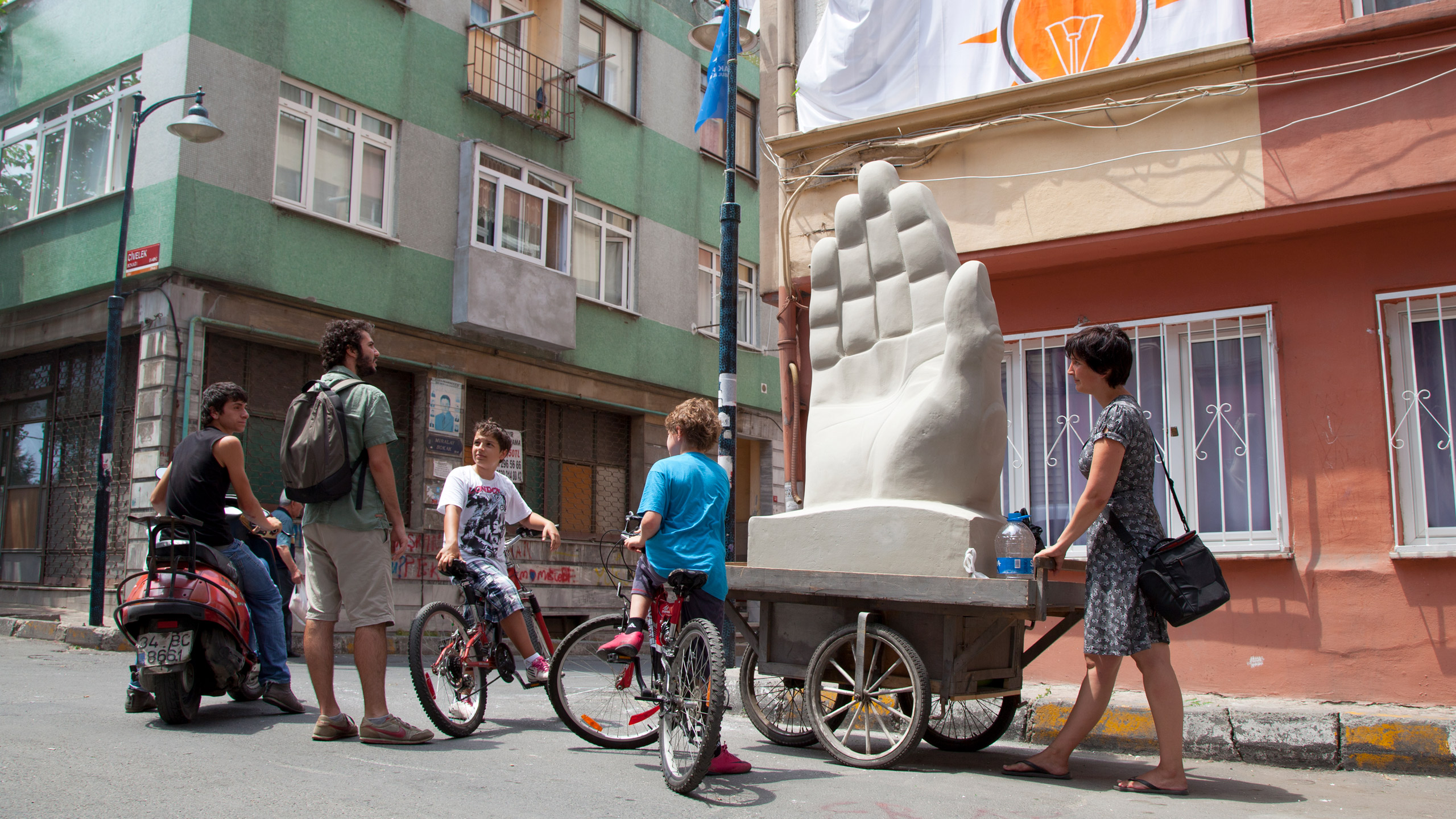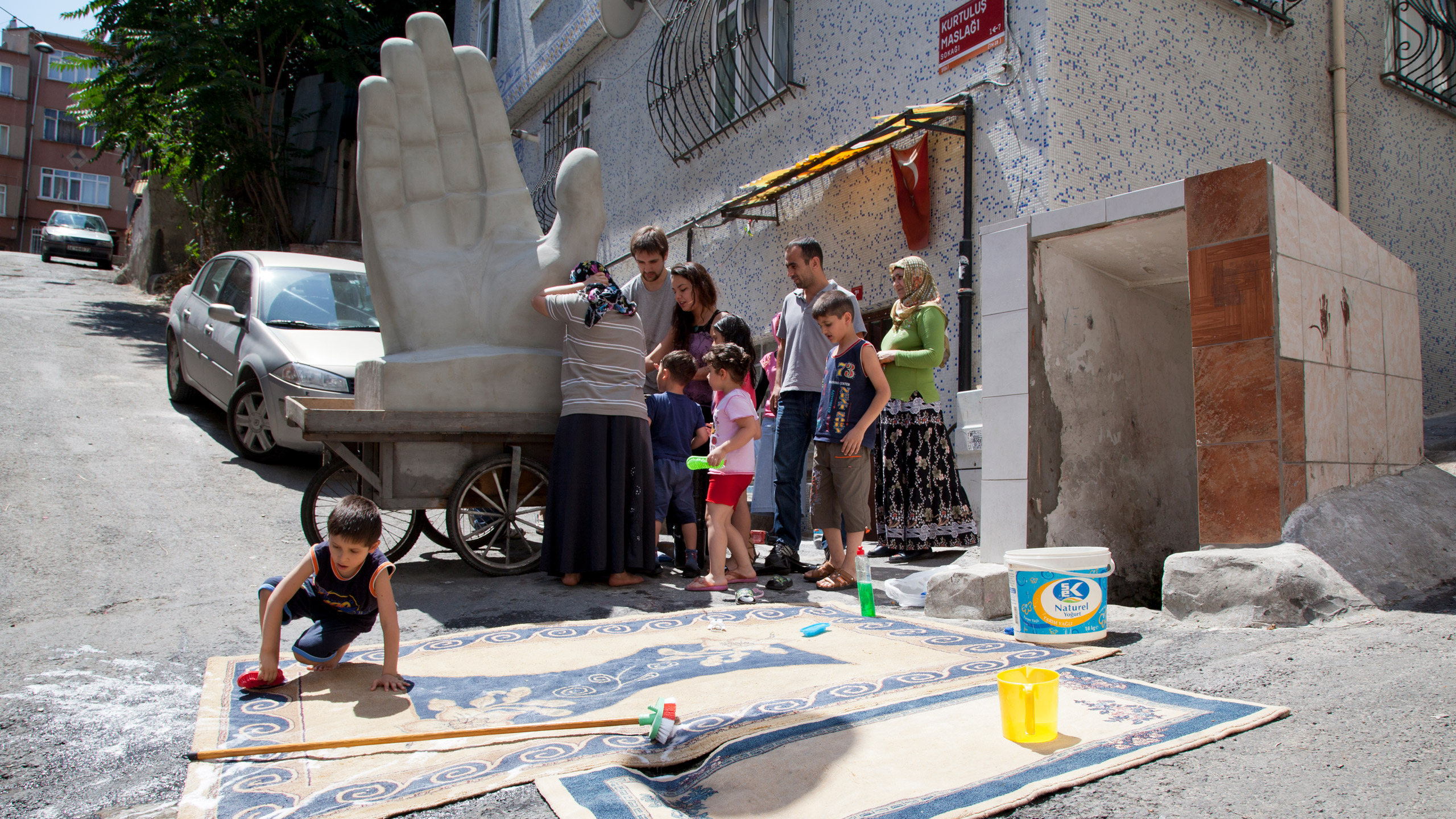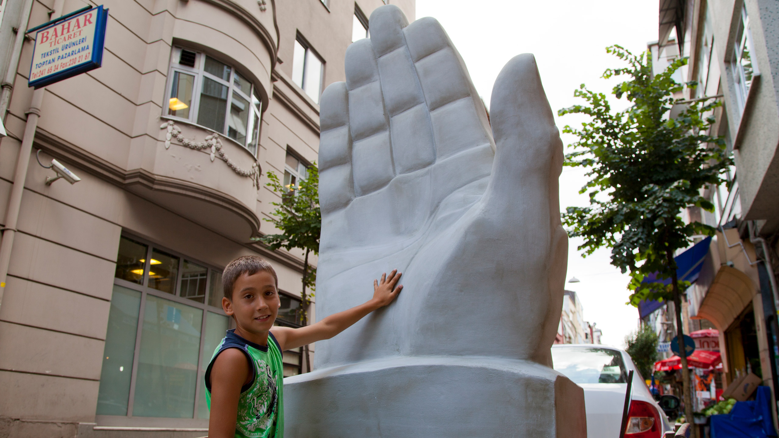 (Turkish for Monument to Humanity – Helping Hands) dealt with the demolition of a controversial monument in Kars, 2011. The project tried to offer a stage for a public debate on the topic through the construction of an alternative monument. A mobile studio was used as a catalyst for engaging the citizenry. While wheeling the cart through different neighborhoods in Istanbul, passersby were asked to lend a helping hand and contribute to the construction of a new monument. They were interviewed and a plaster copy of one of their hands was made. The plaster hands served as the building blocks for the new monument. After this intervention, the hands were installed on the site of the demolished sculpture. The interviews were published in a publication, together with pictures of the process.
