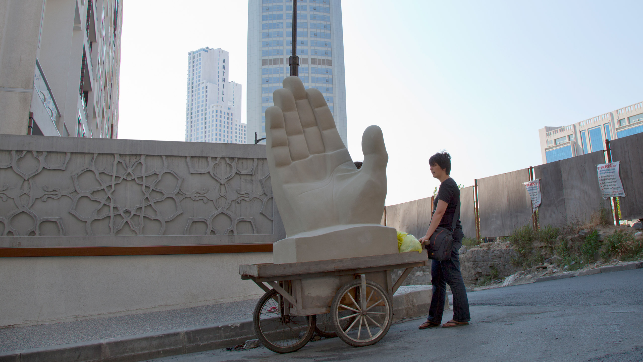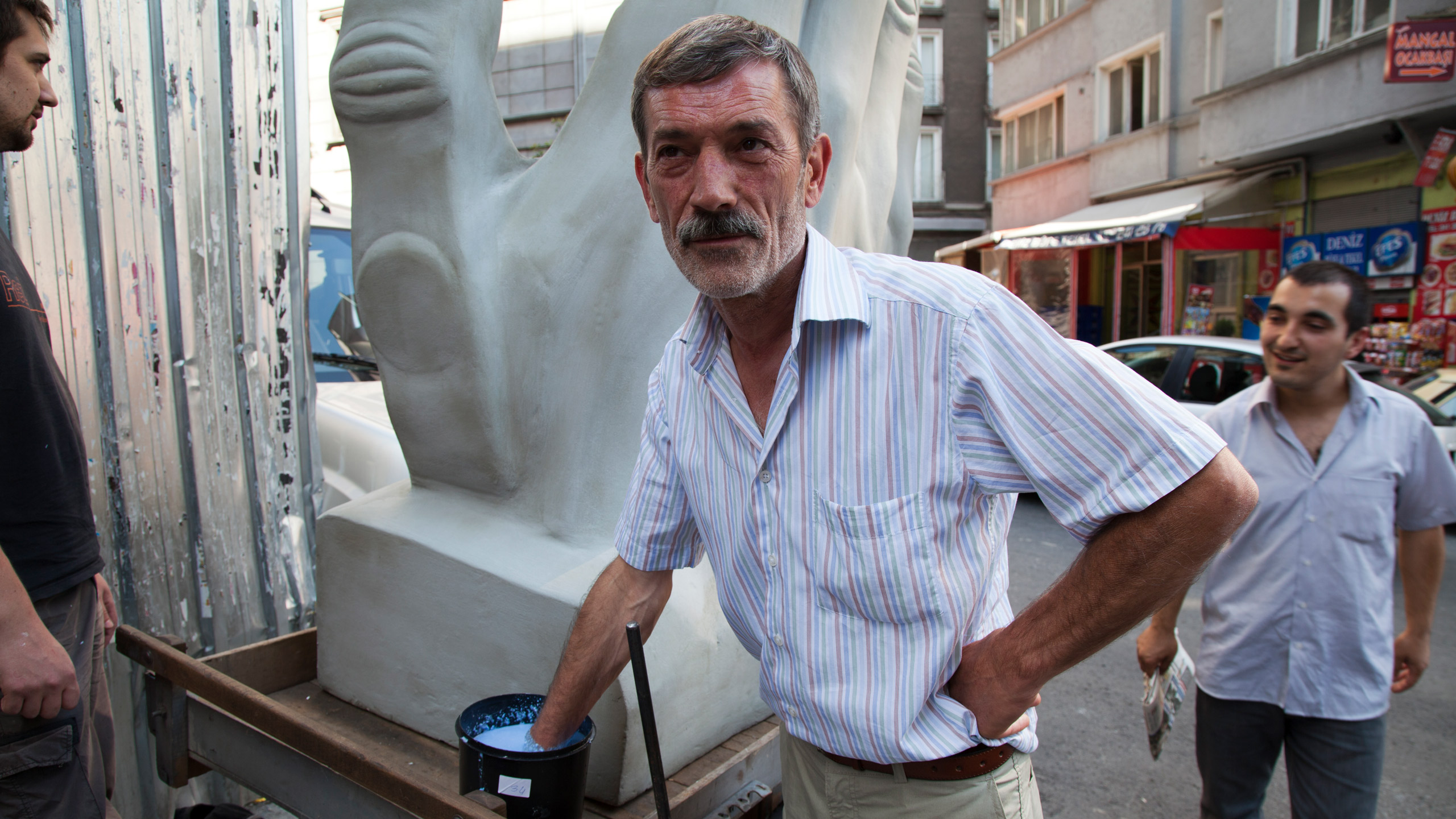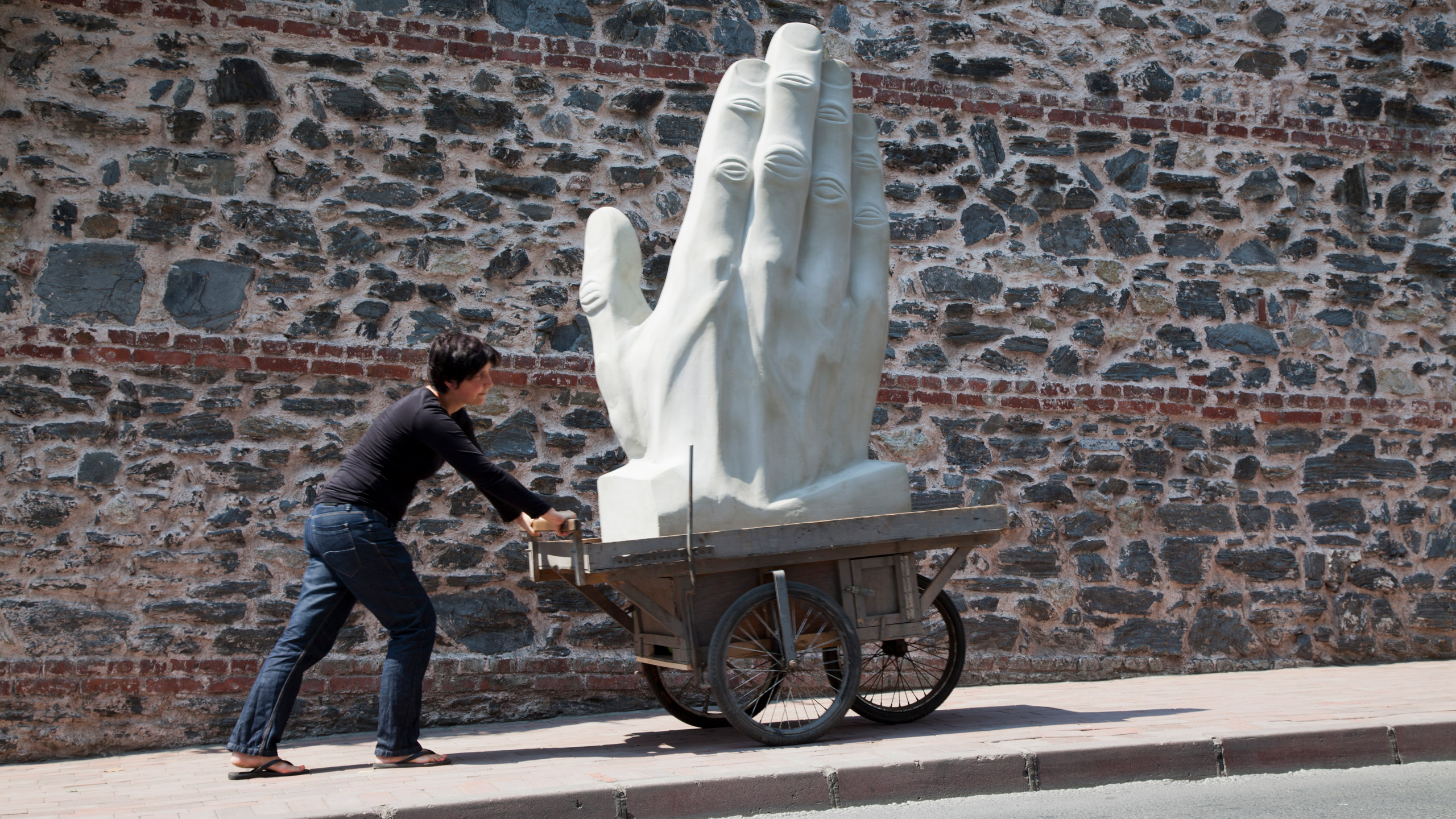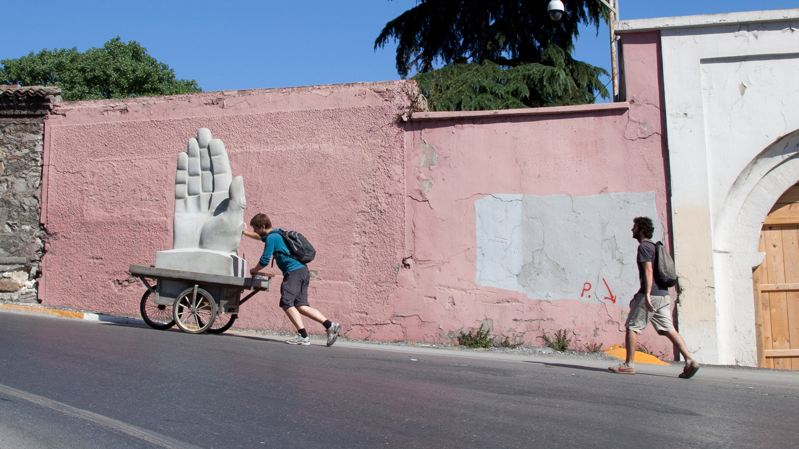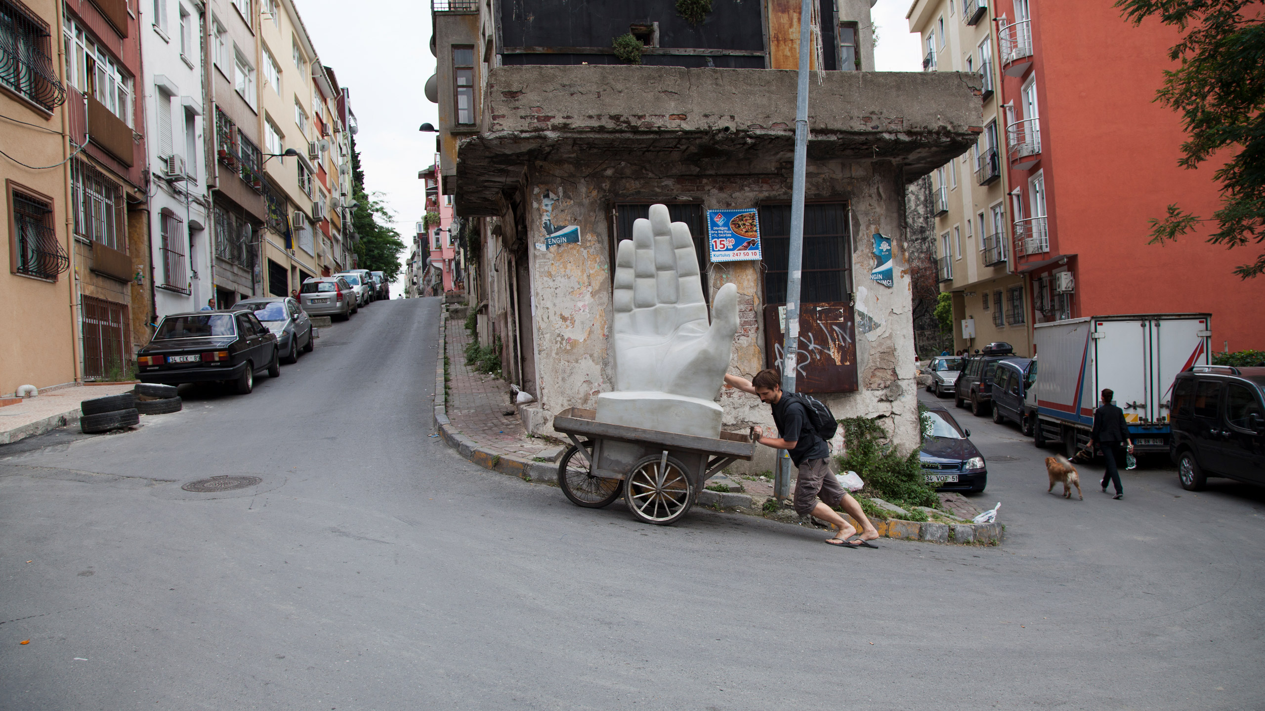 (Turkish for Monument to Humanity – Helping Hands) dealt with the demolition of a controversial monument in Kars, 2011. The project tried to offer a stage for a public debate on the topic through the construction of an alternative monument. A mobile studio was used as a catalyst for engaging the citizenry. While wheeling the cart through different neighborhoods in Istanbul, passersby were asked to lend a helping hand and contribute to the construction of a new monument. They were interviewed and a plaster copy of one of their hands was made. The plaster hands served as the building blocks for the new monument. After this intervention, the hands were installed on the site of the demolished sculpture. The interviews were published in a publication, together with pictures of the process.
