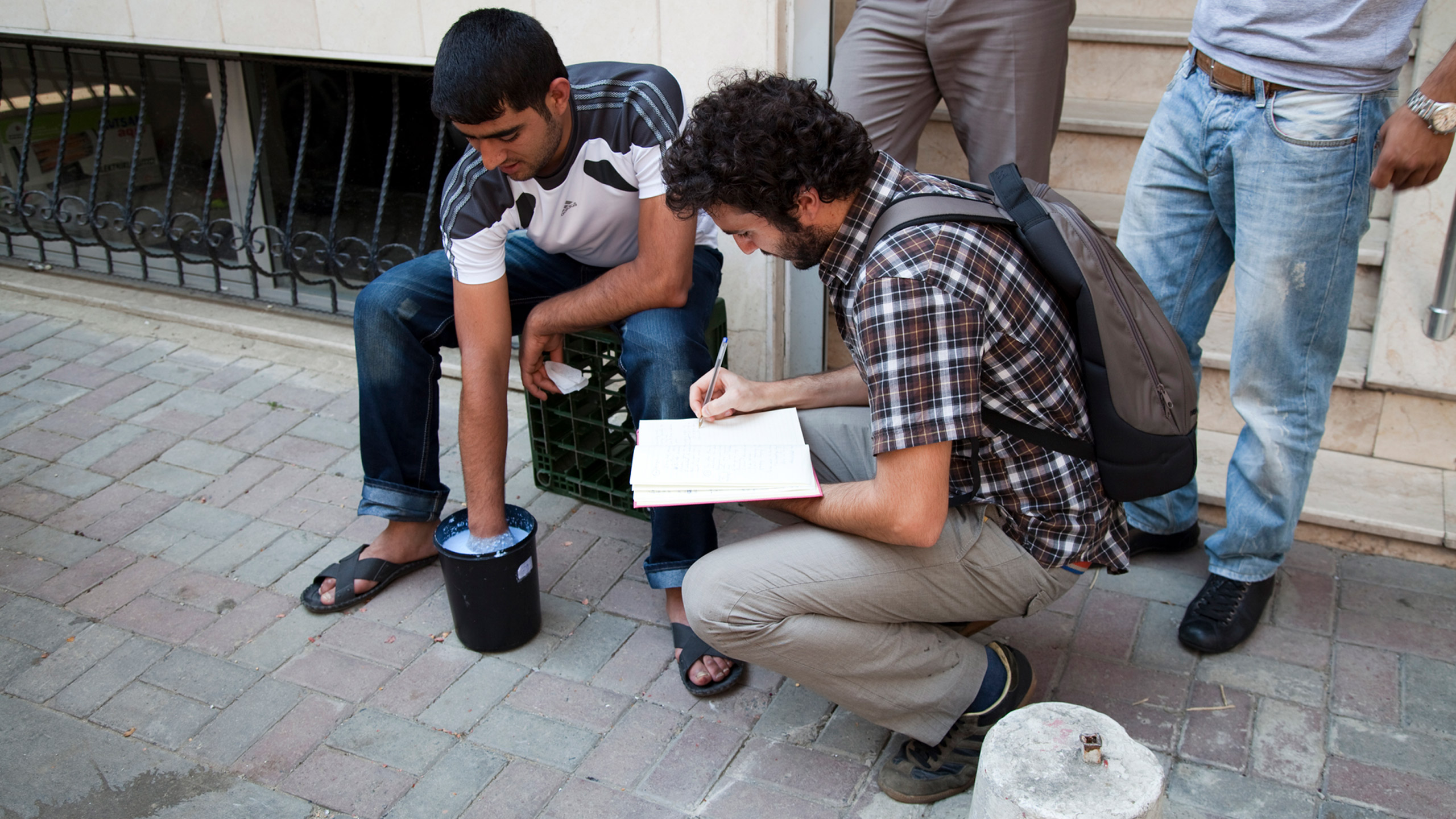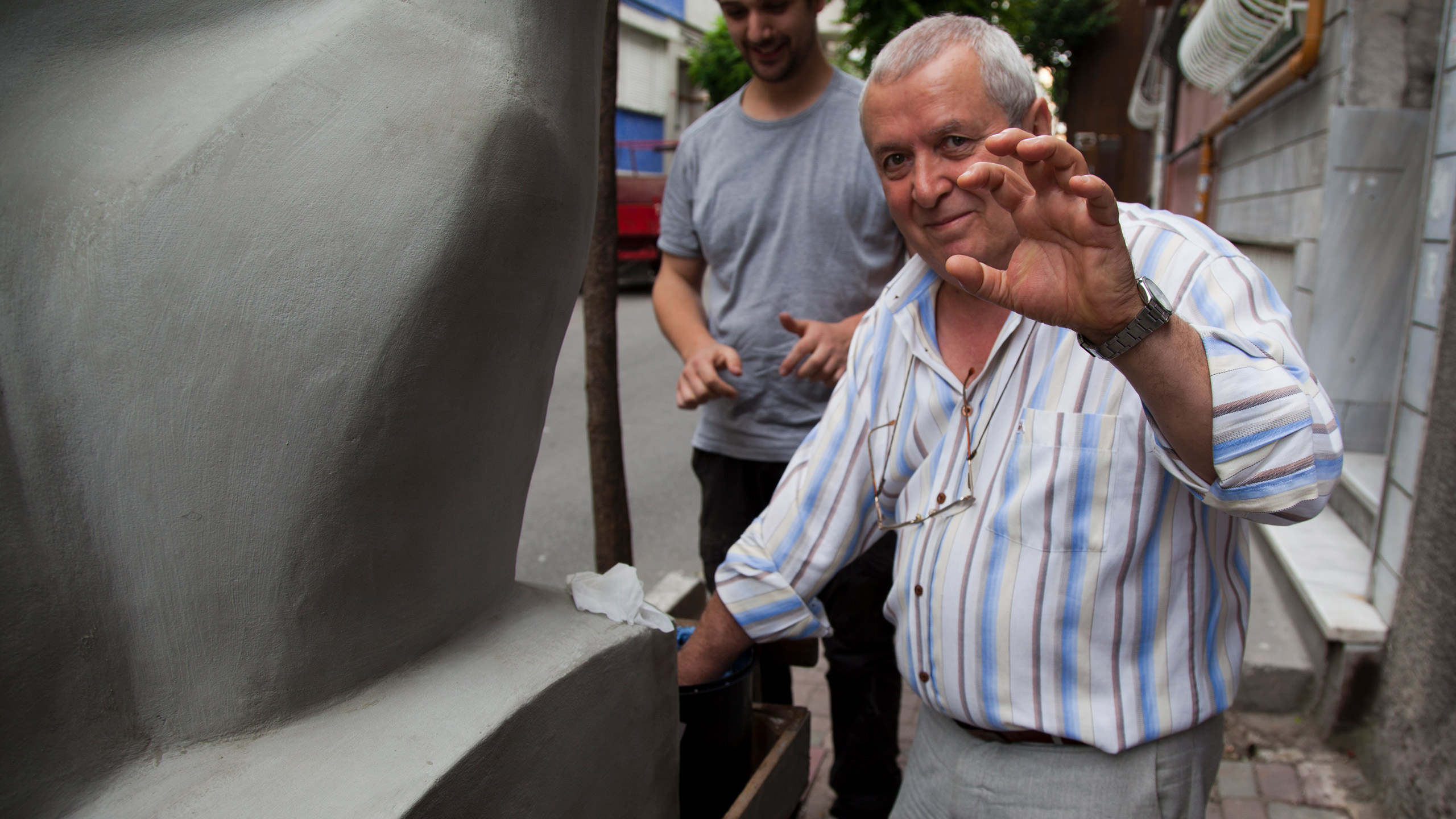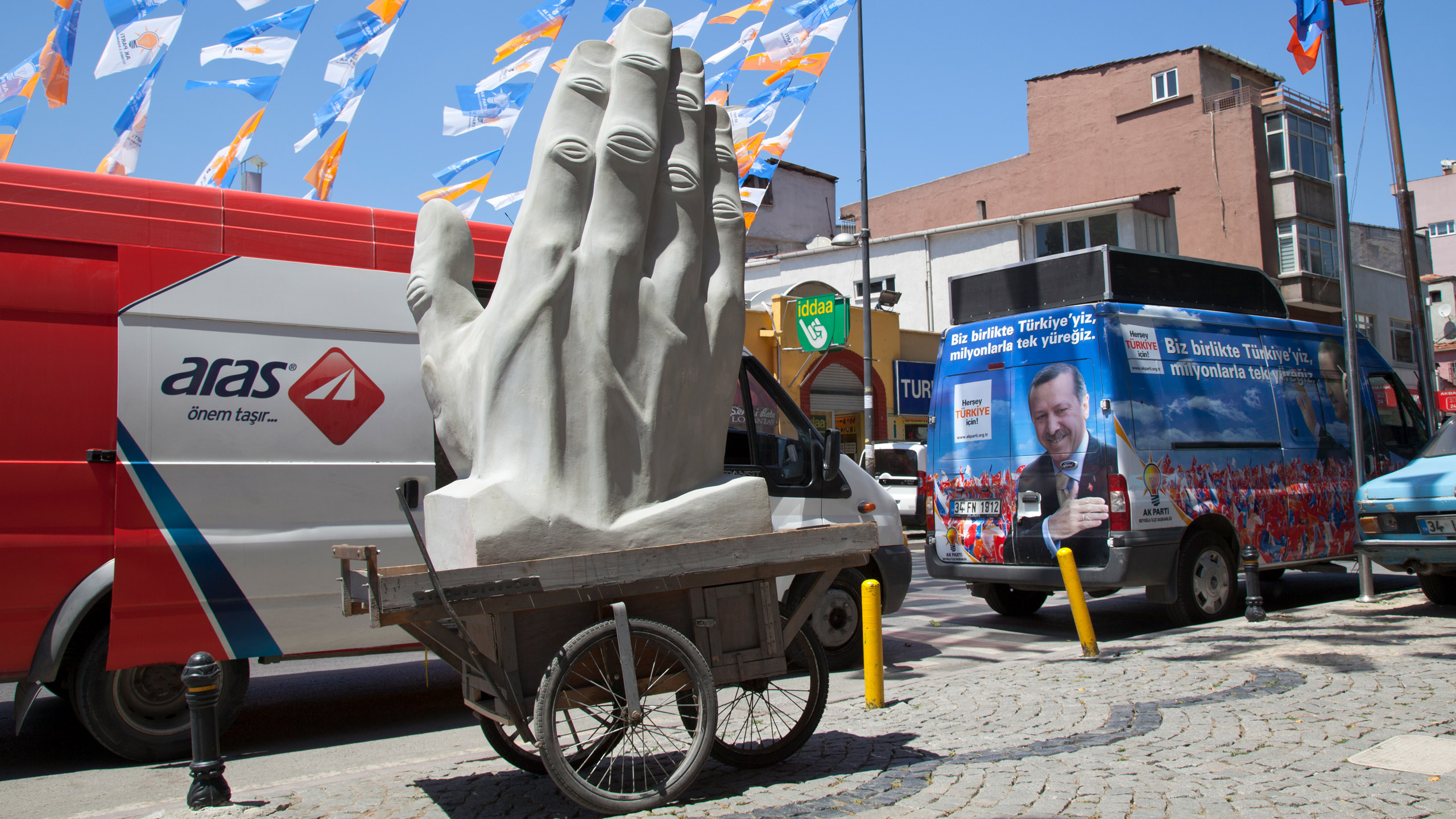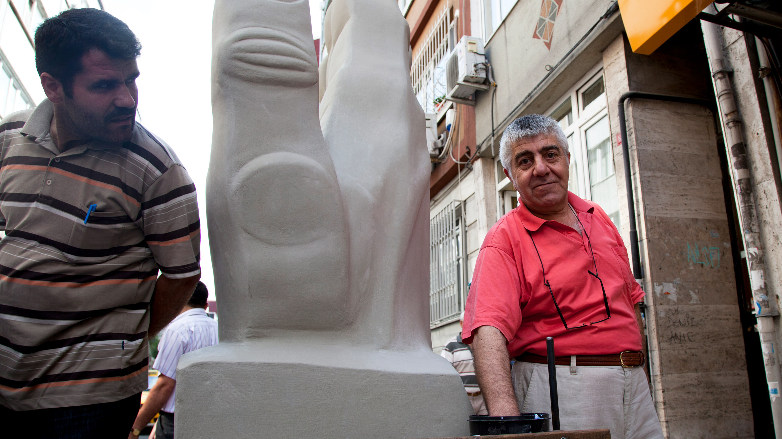 (Turkish for Monument to Humanity – Helping Hands) dealt with the demolition of a controversial monument in Kars, 2011. The project tried to offer a stage for a public debate on the topic through the construction of an alternative monument. A mobile studio was used as a catalyst for engaging the citizenry. While wheeling the cart through different neighborhoods in Istanbul, passersby were asked to lend a helping hand and contribute to the construction of a new monument. They were interviewed and a plaster copy of one of their hands was made. The plaster hands served as the building blocks for the new monument. After this intervention, the hands were installed on the site of the demolished sculpture. The interviews were published in a publication, together with pictures of the process.