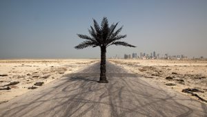 Bahrain was once a tropical paradise, known as the island of a million palm trees. But in a few decades the face of the land changed dramatically and the iconic date palm groves have almost completely disappeared due to the rapid urbanisation and the development of artificial islands. The project took place on the Nurana island, a man-made island on the northern coast of Bahrain, constructed in 2010 and imagined to become part of a new city with luxury apartments, villas, hotels, commercial spaces and waterfront promenades. After the completion of the island all further construction projects were halted, leaving the island empty. This vast open space is now temporary reclaimed by people from the neighbouring communities and used as a ‘park’ for walking, horse riding, jogging, swimming and car racing. As a result of the racing, the sides of the only asphalted road in the middle of the island are covered in huge amounts of rubber debris. The black palm tree is made from this material and installed in the middle of the island as a monument in commemoration of the many palm trees that have disappeared from Bahrain.