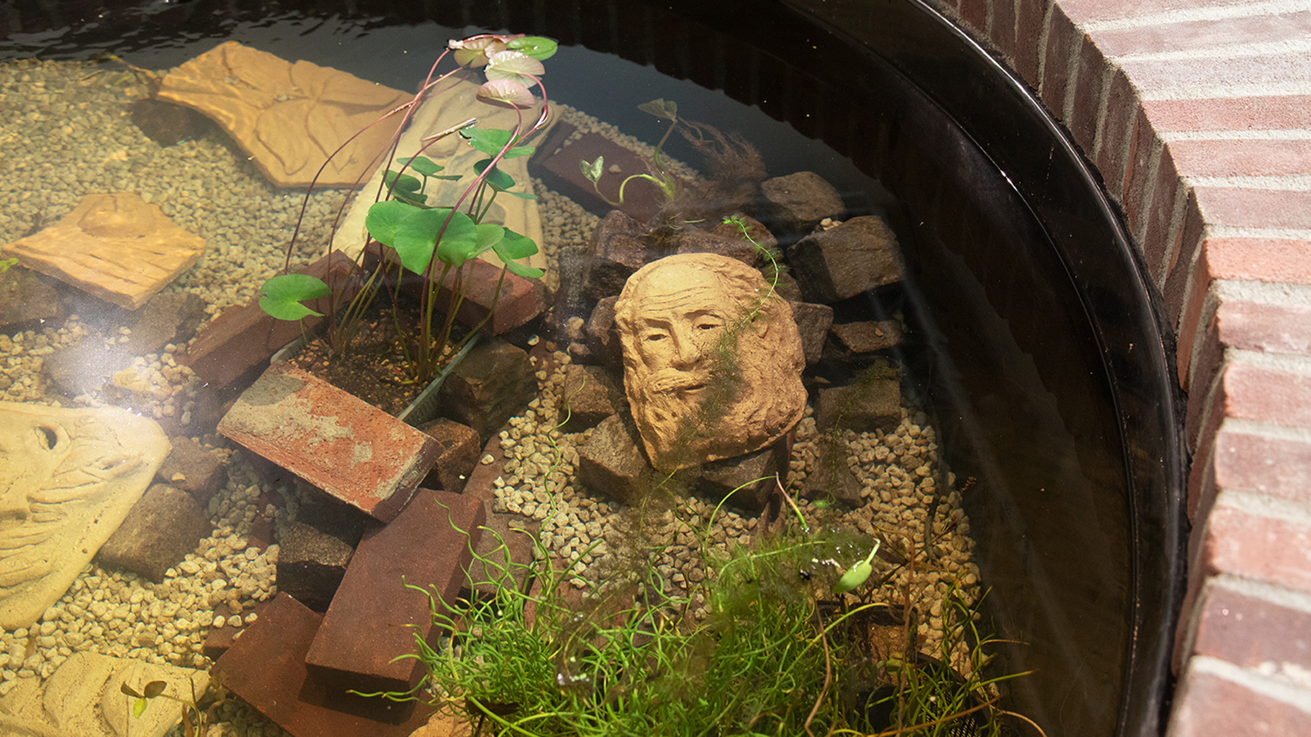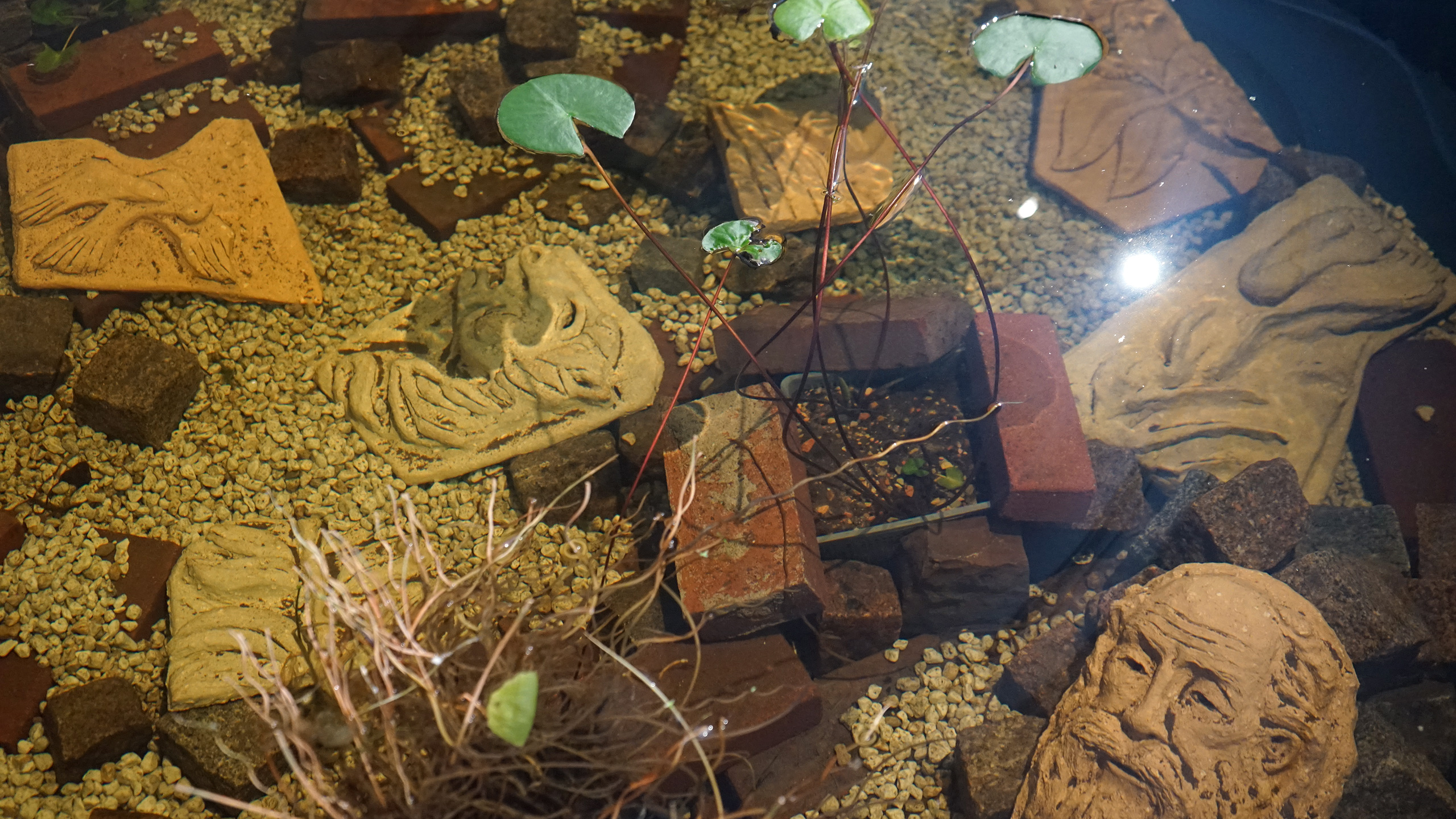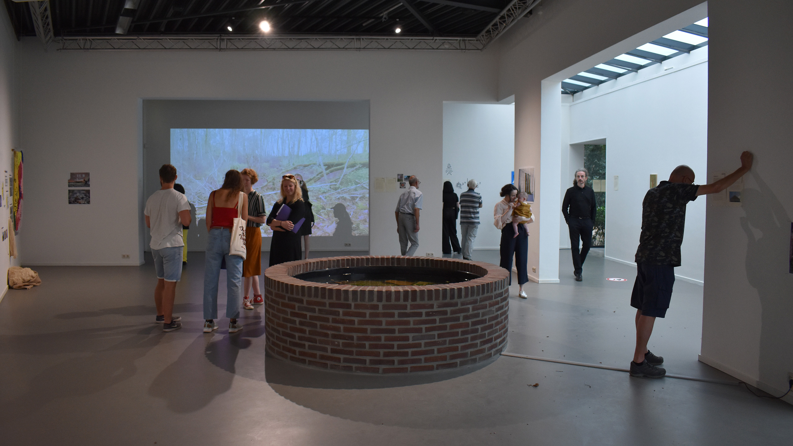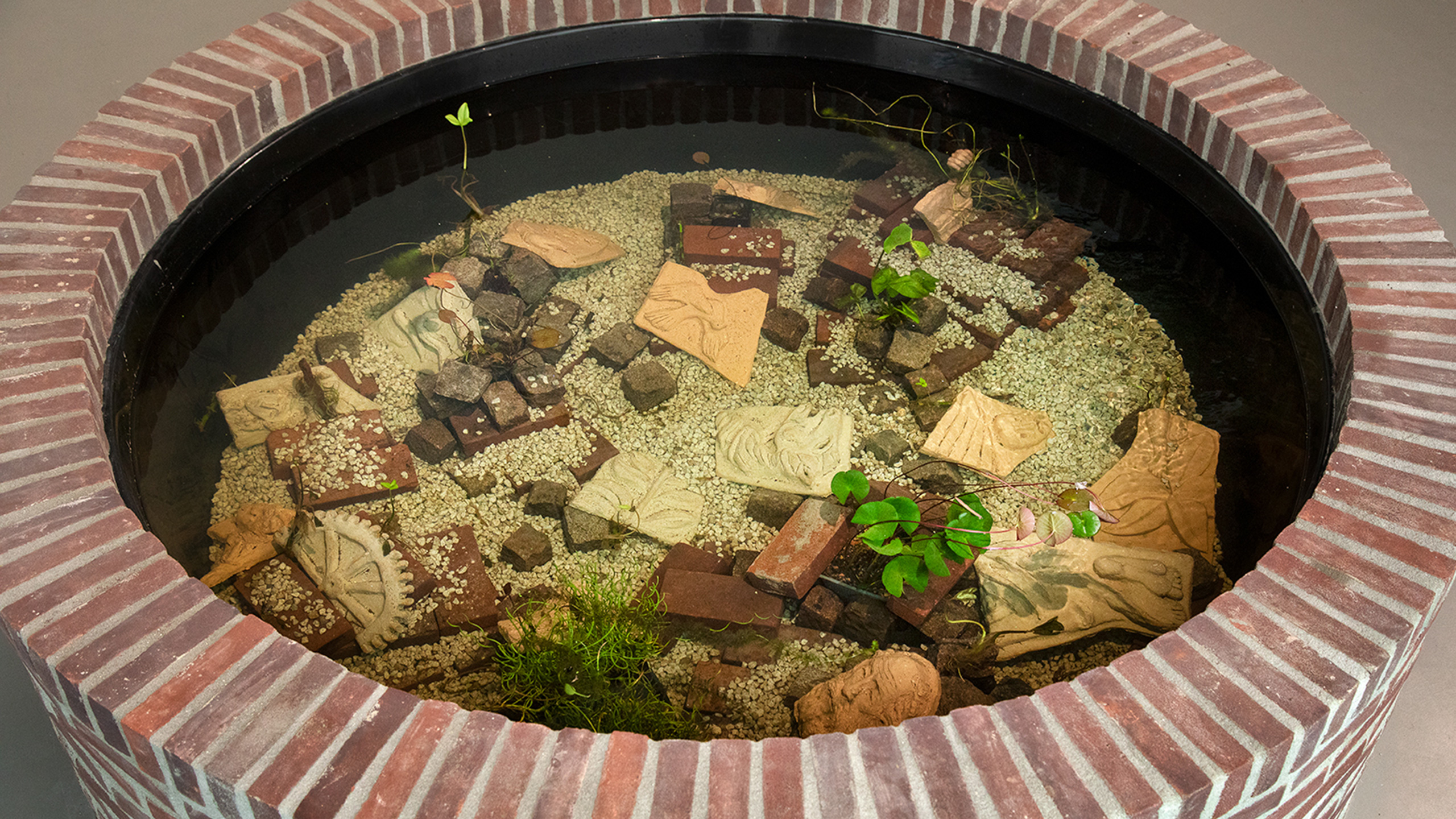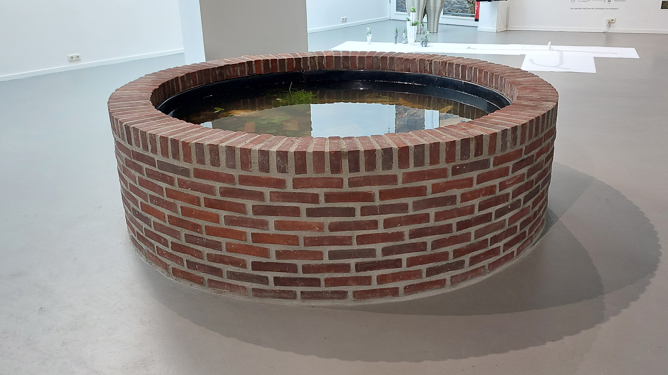 The sculpture in the exhibition at Odapark forms a diptych with the another sculpture in the center of Tegelen. There, the land plants play a leading role, in Odapark (Venray) the aquatic plants. The sculpture shows an apocalyptic image: the tympanum of the former Tegelen town hall, designed by artist Charles Eyck in 1946, broken and sunken in water. Fragments of the tympanum depicting the industrial activity of the city, such as the cogwheel that symbolised progress, a horse’s head and Mercury, the Roman god of trade, have been disconnected from the tympanum and lie among aquatic plants planted by Eugene Dubois on the De Bedelaar estate, such as water lilies, water sedge and bladderwort. The sculpture references the recent July 2021 floods, as well as the nickname given to the town hall when it was built: Swamp Palace. Since the monumental building was built on a swampy piece of land, local residents thought the monumental building would quickly sink into the swampy soil.