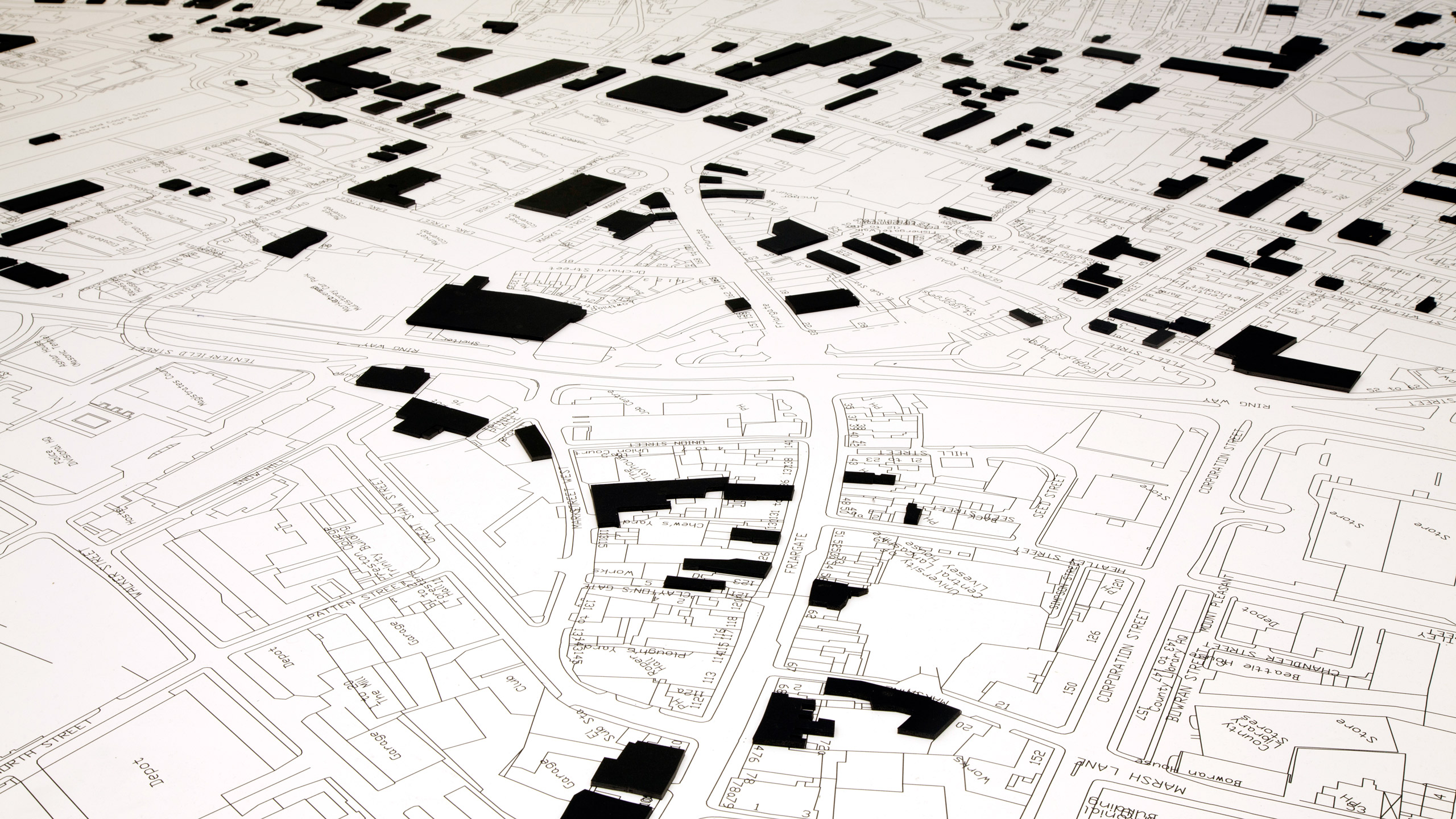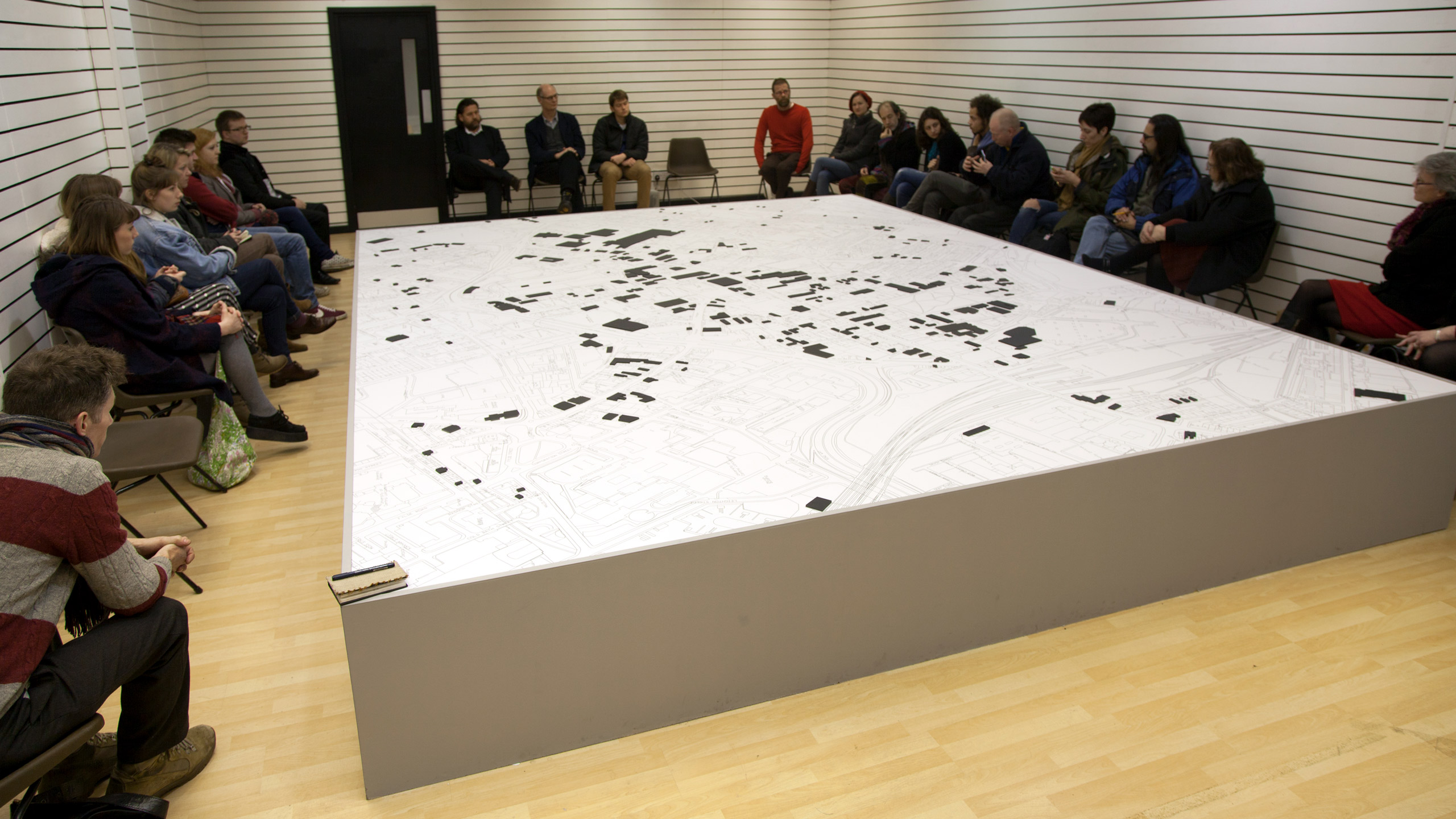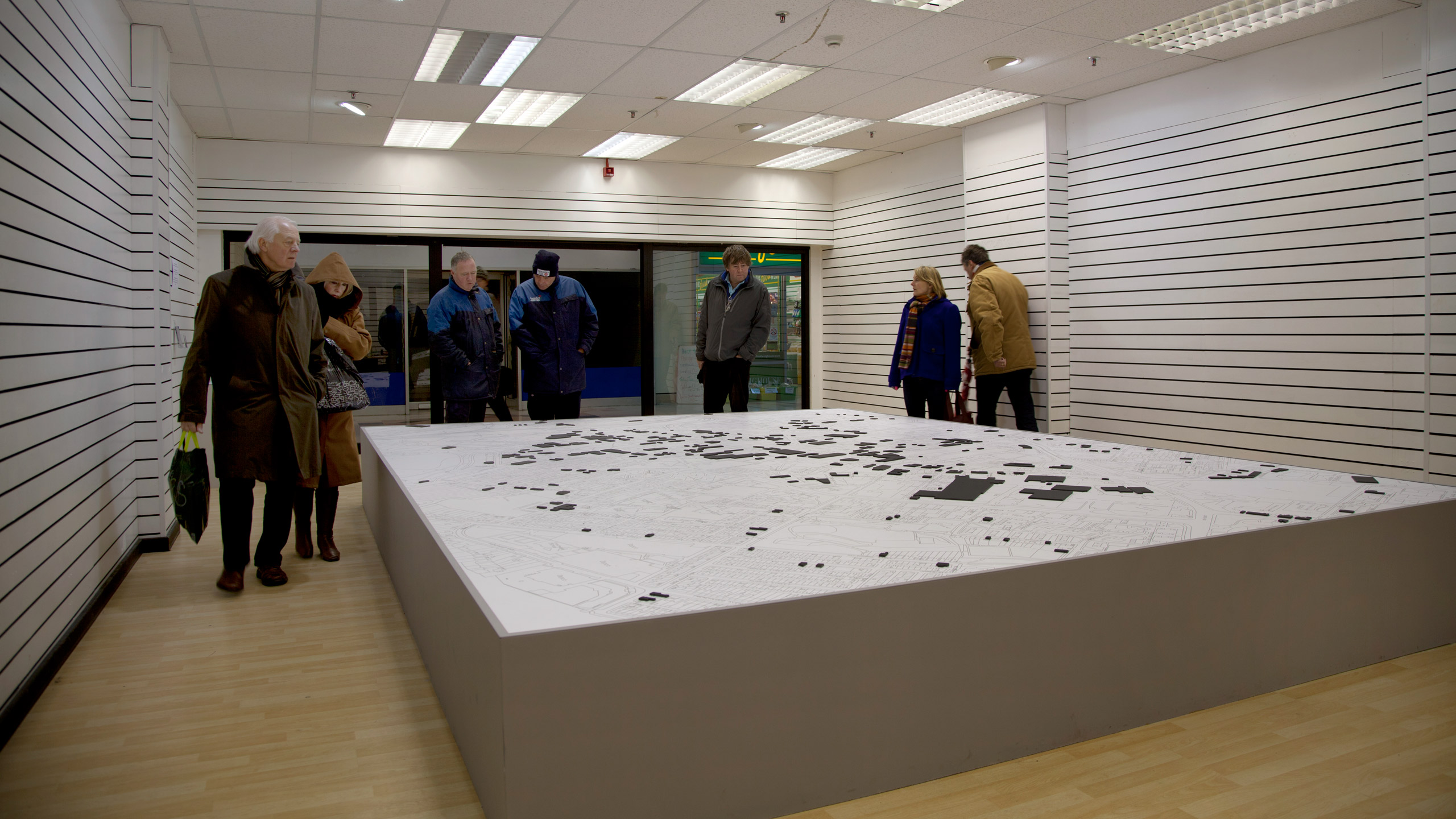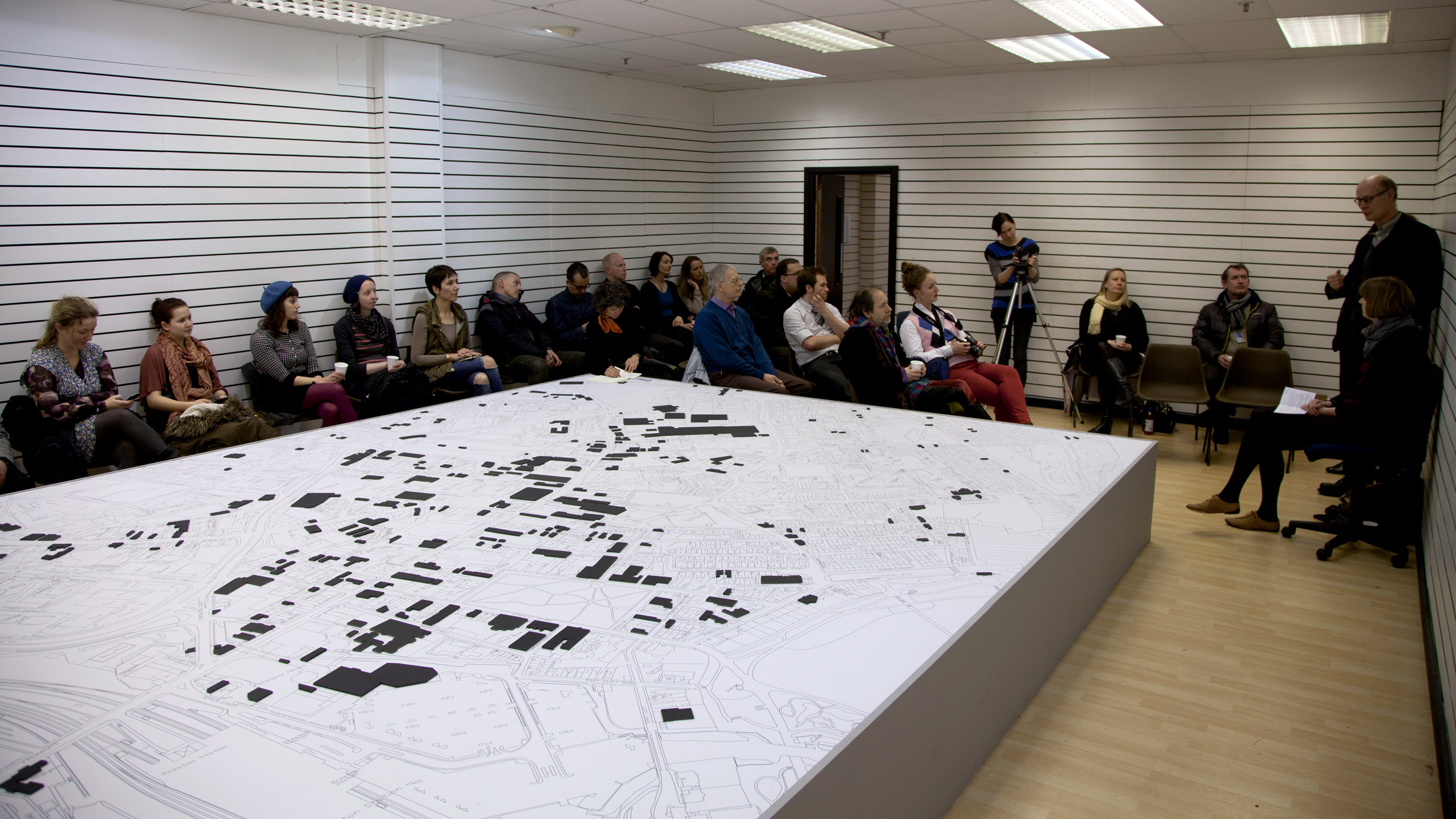 Interestingly there were no official statistics available about vacant properties, so the project started by setting up an independent research trajectory. The empty places were identified by scanning all the streets of Preston and supplemented with research done online and in the local archives. Each individual property was photographed and marked on a map of the city center. The map of empty buildings was presented in an empty shop in the main shopping area. From here debates were organized. During the exhibition period the former shopping space transformed into a setting for political debate.