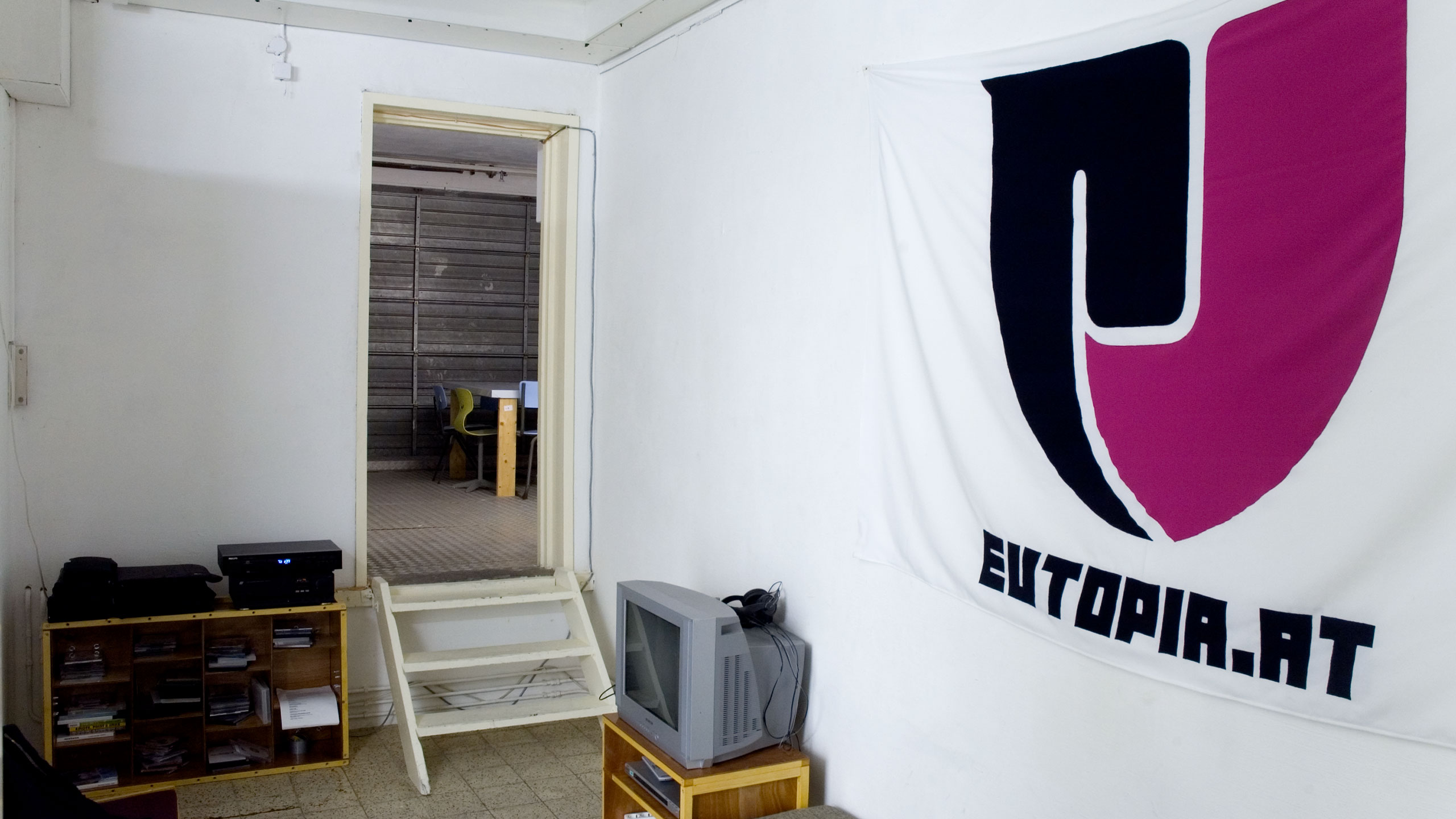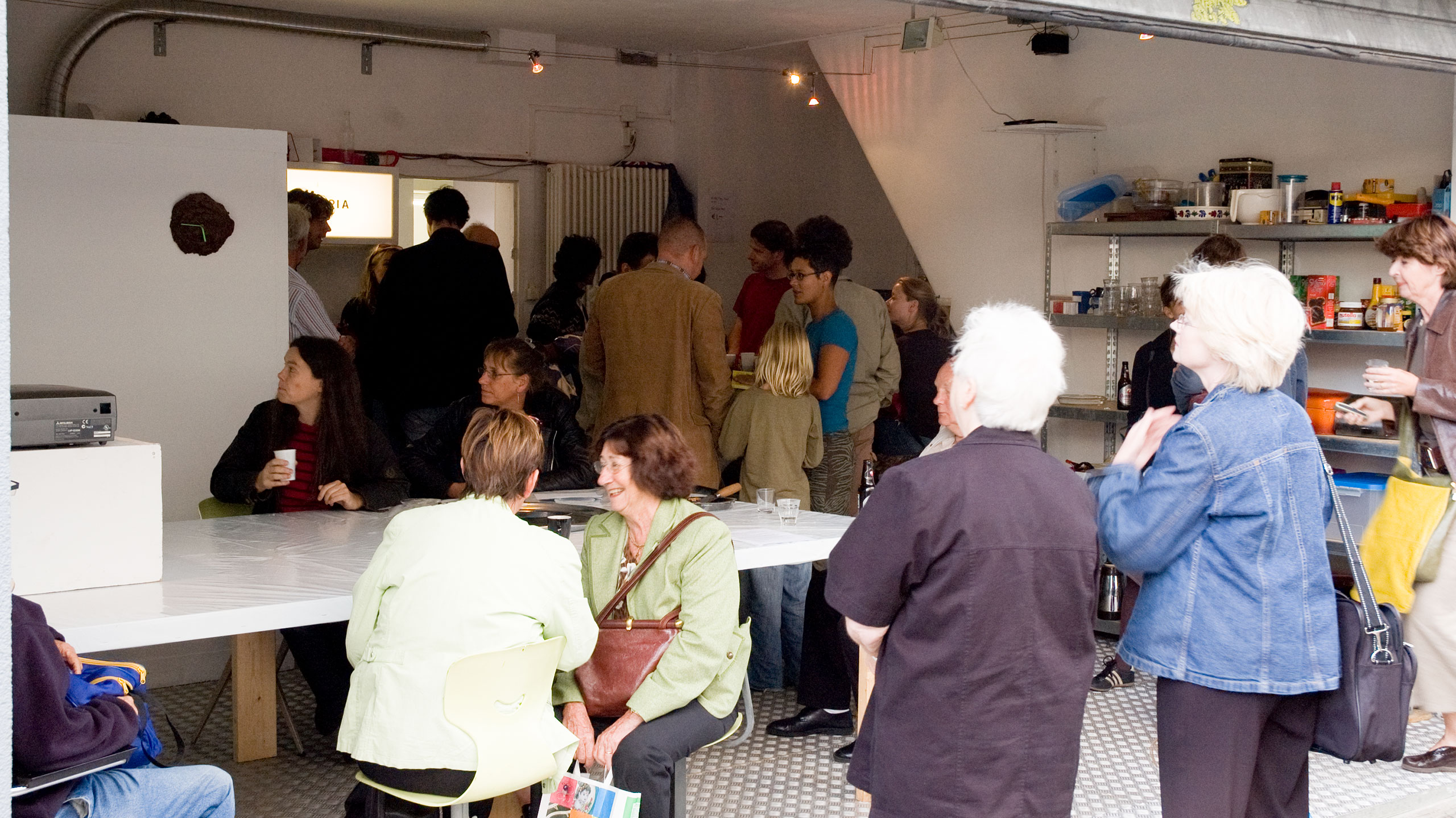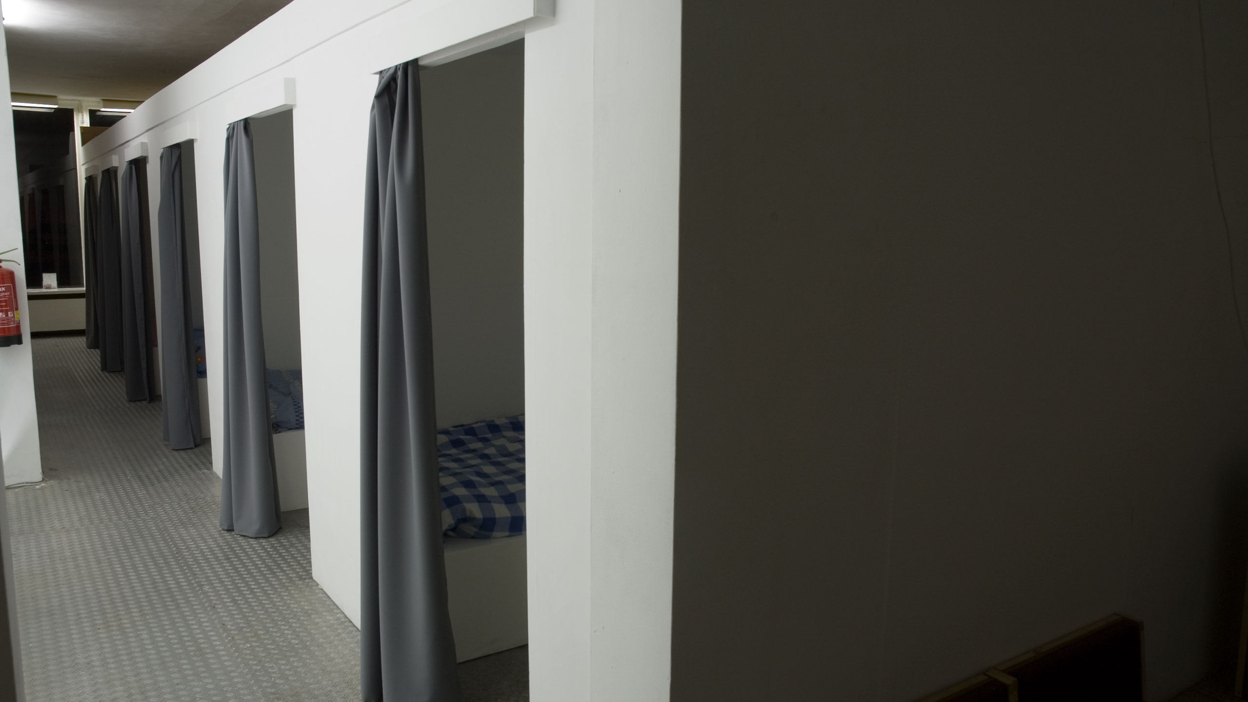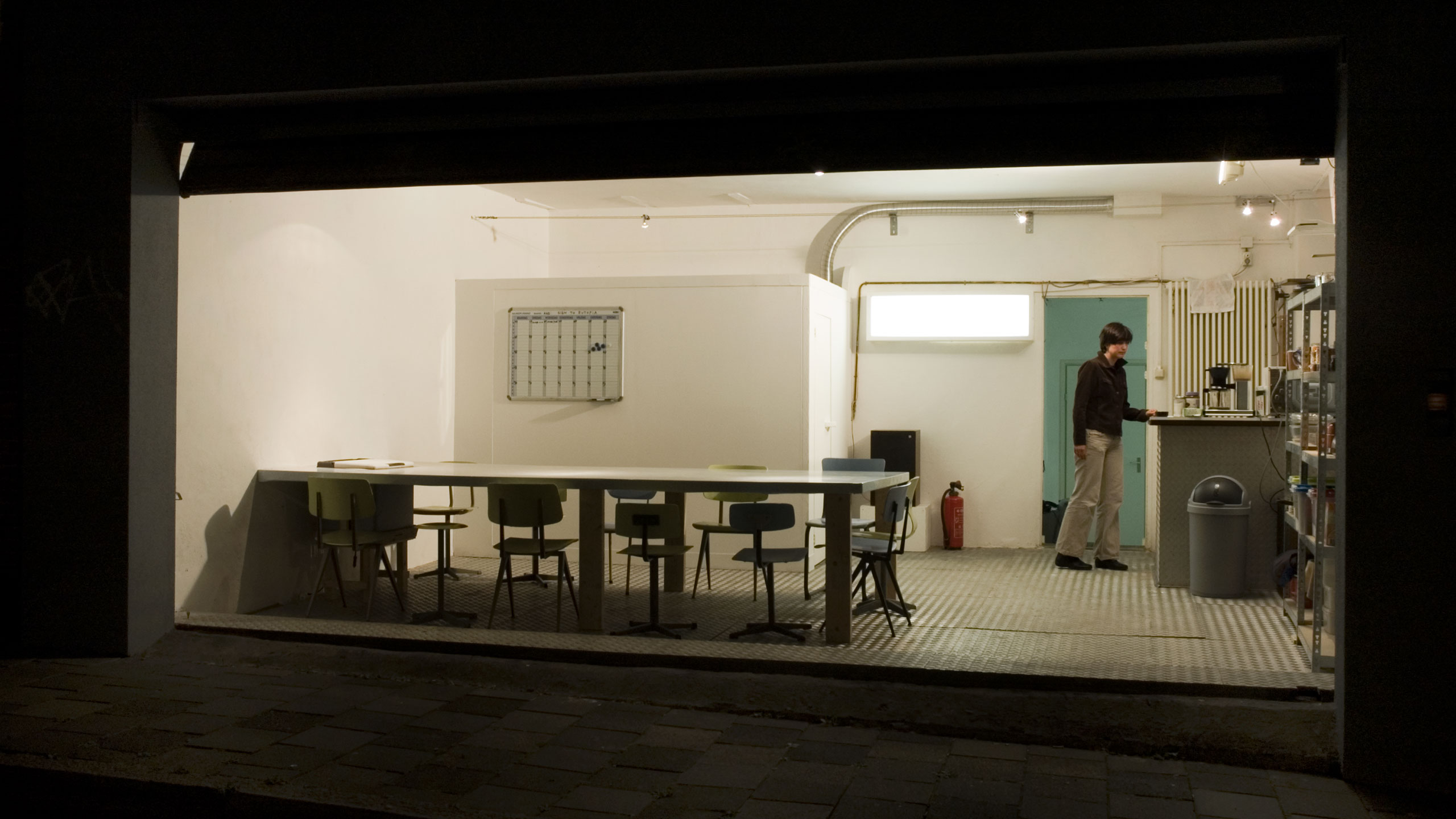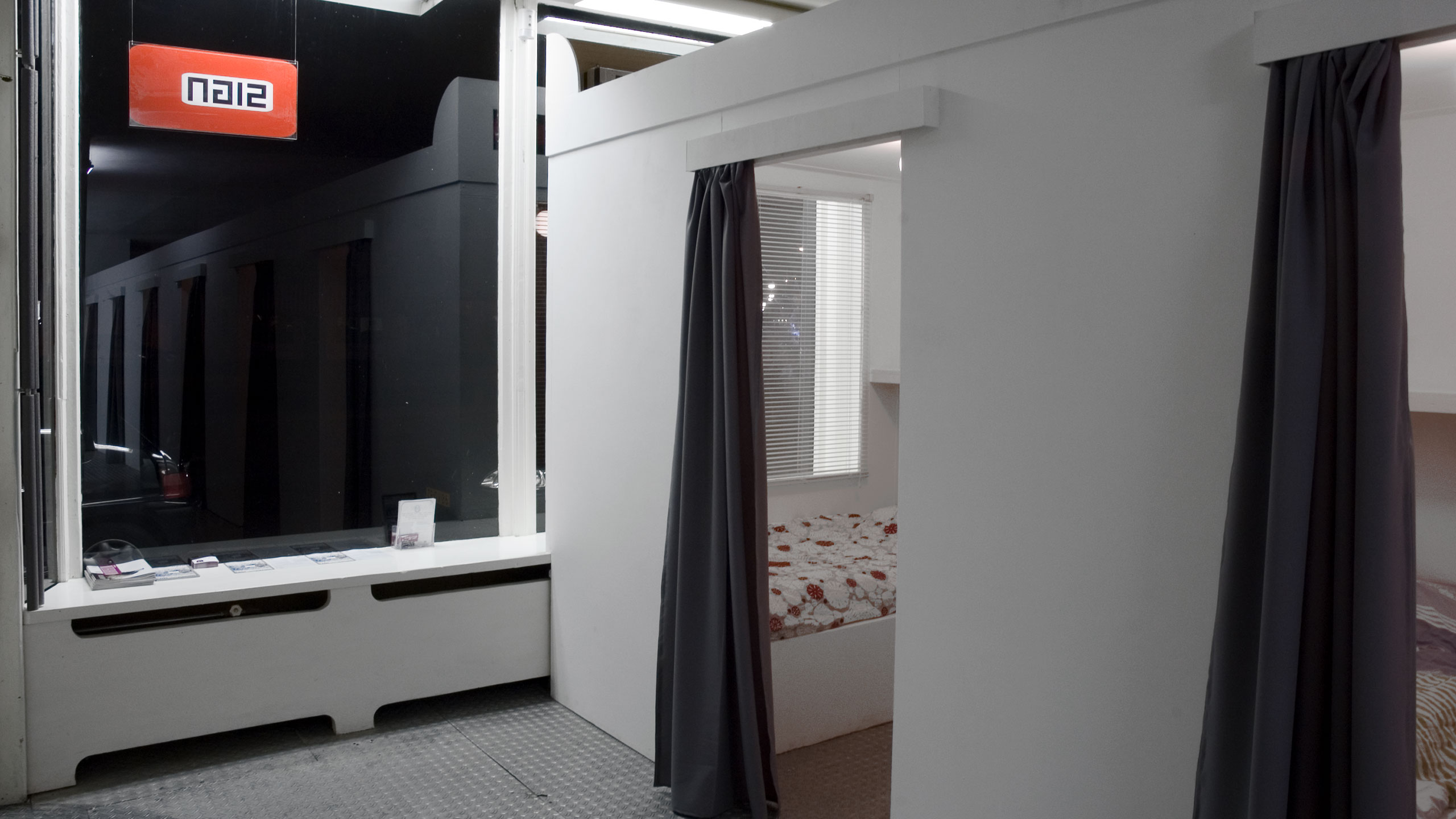 To make this residence possible we build a living area in the gallery of Sign, complete with sleeping cabins, shower, kitchen and a meeting area. The meetingplace was situated in the back space of Sign. The garage door was open when we were there. It gave the residence place an open and transparent character.