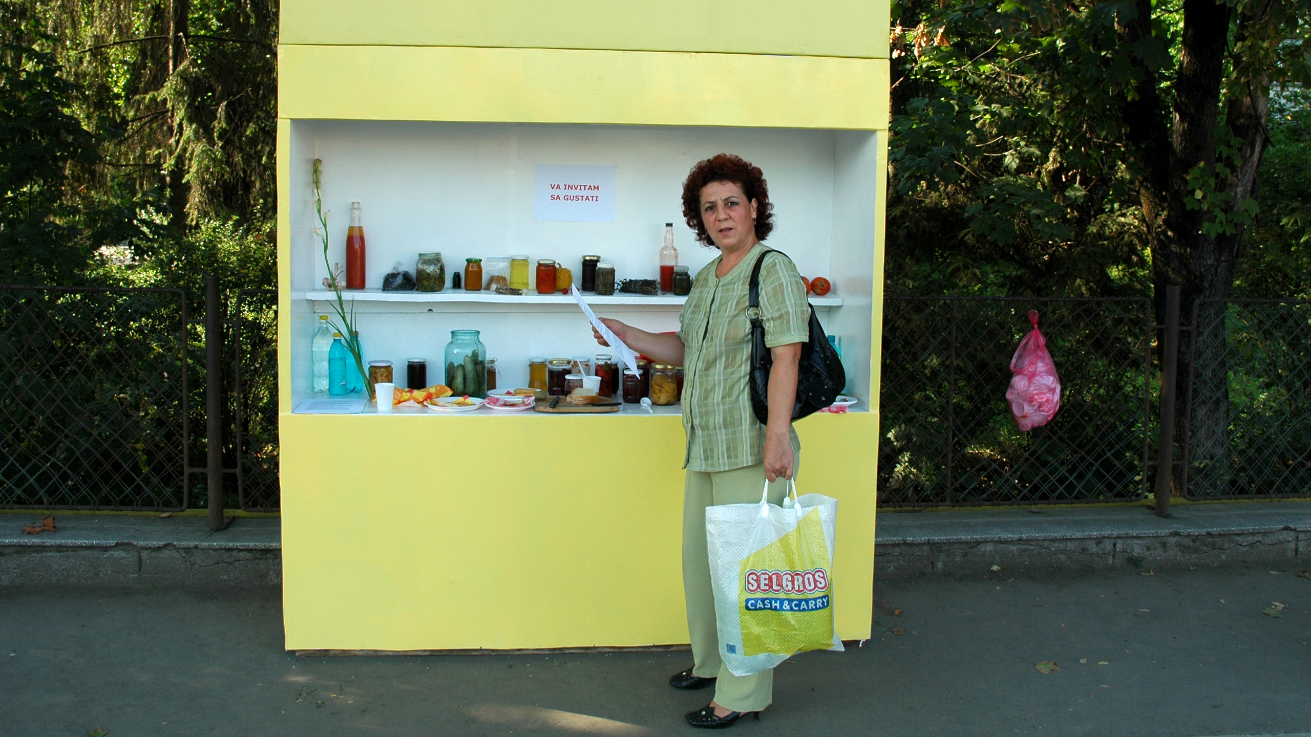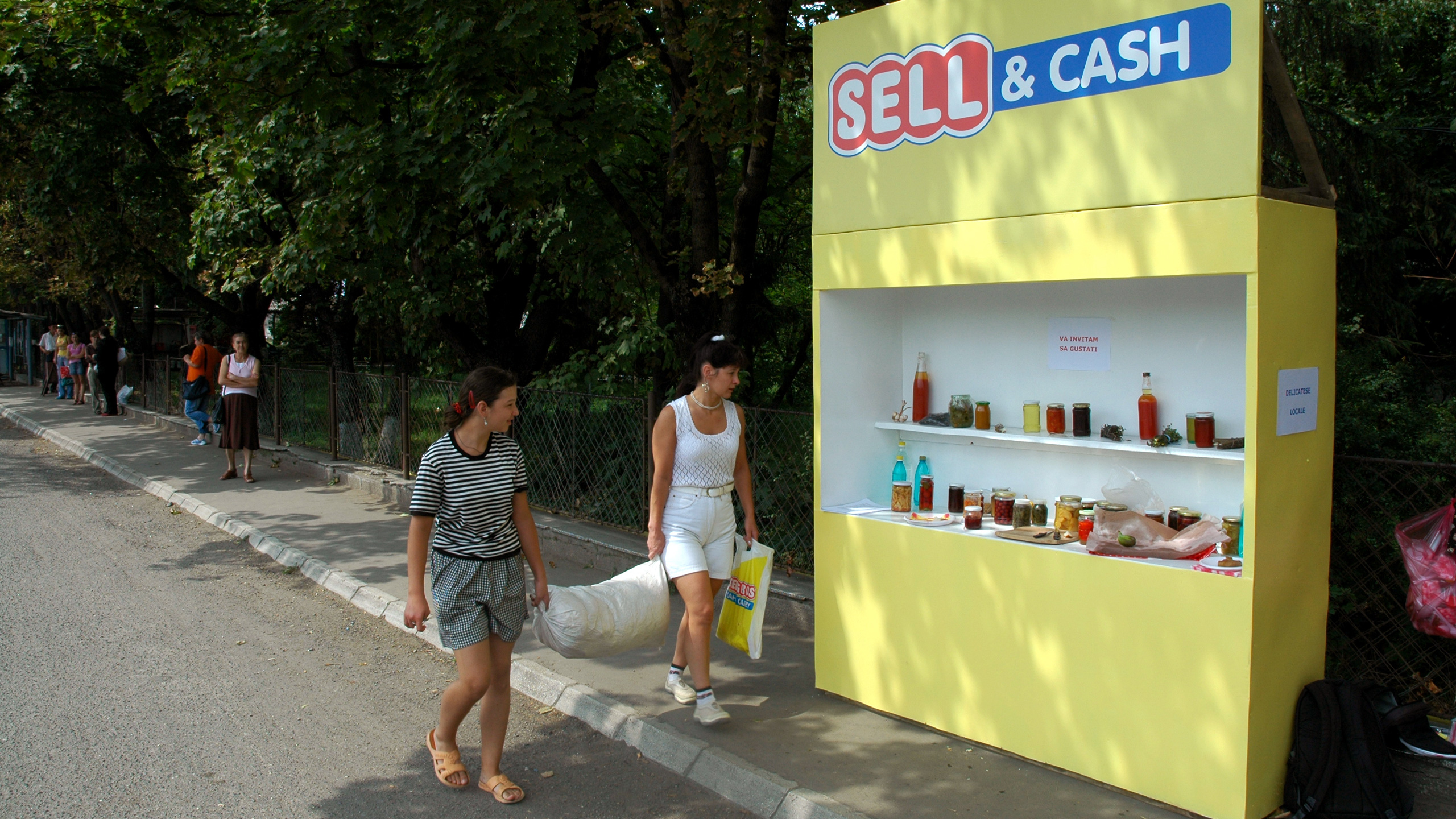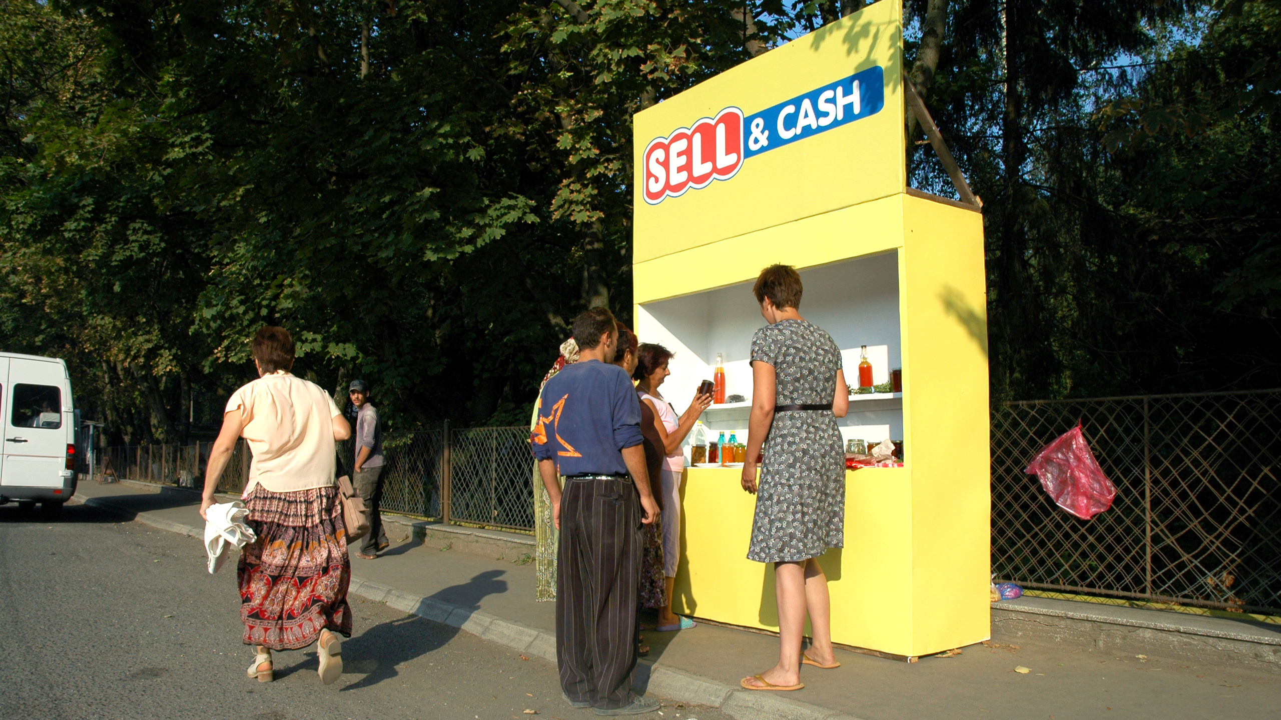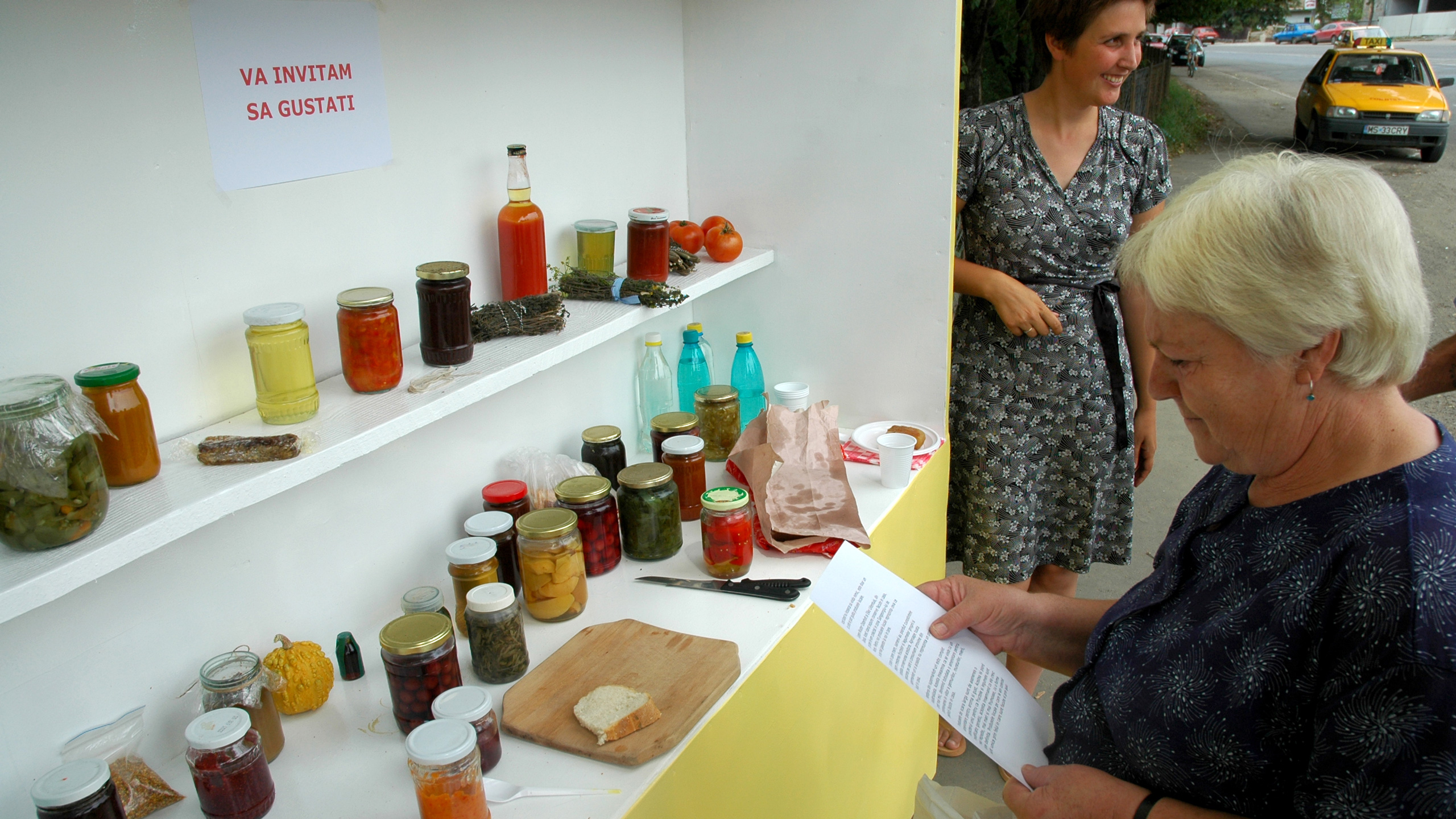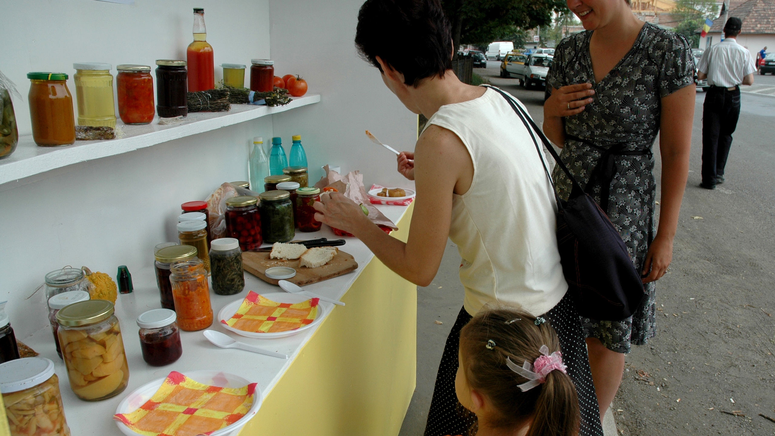The work addressed the rapid dismantling of a local economy and agrarian tradition in a village in Romania due to the arrival of new foreign supermarkets. As a result the genetically modified crops replaced a century old agricultural biodiversity. The aim of the project was to promote the disappearing local food culture by collecting products, such as compote (preserved fruit juice), tuica (plum spirit), honey and a variety of pickles from local farmers. The products were shown in a promotion booth, designed in the colours and typography as found in the design of the newly build supermarket. During one day, local residents were invited to taste their own unique products.