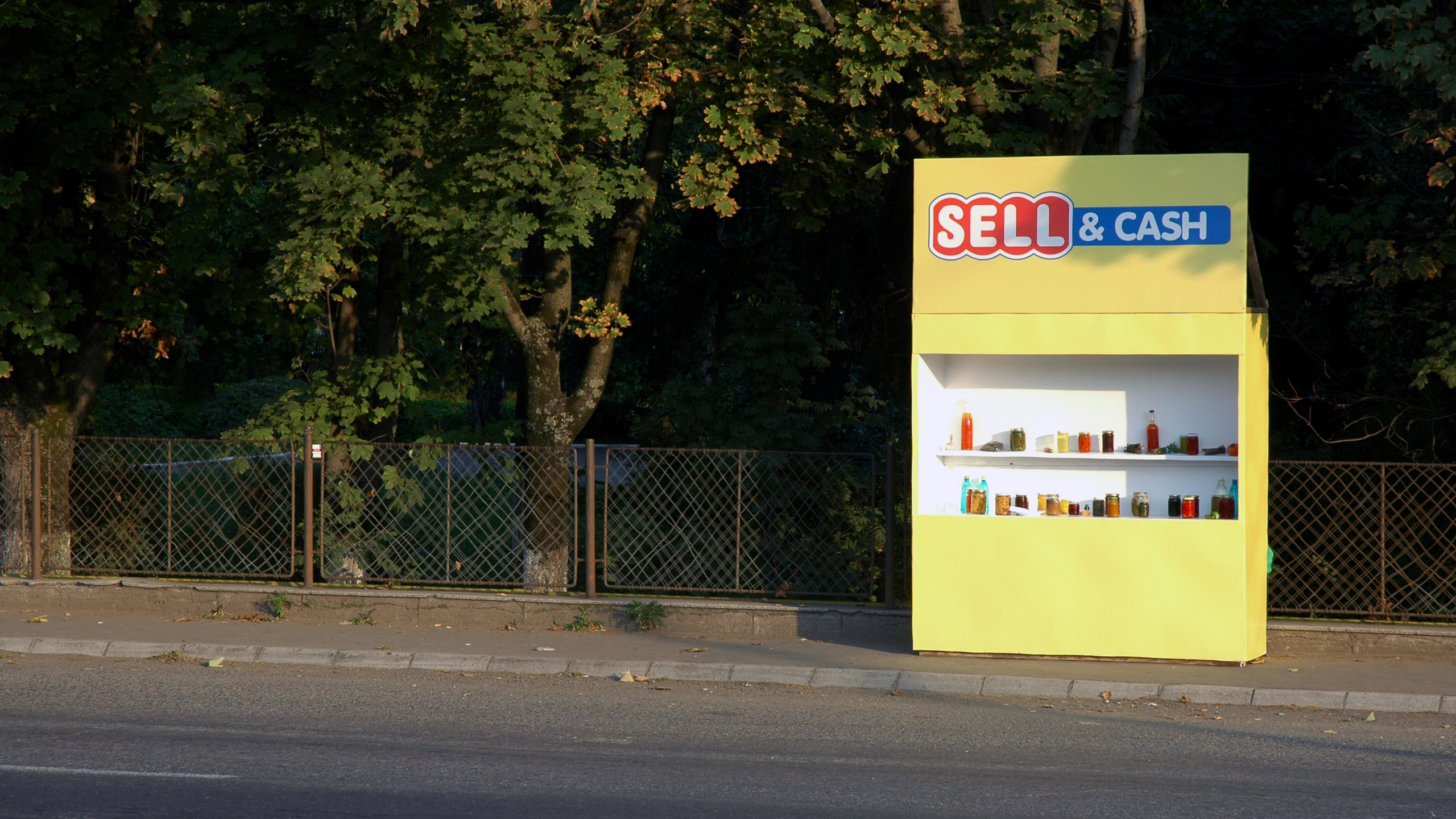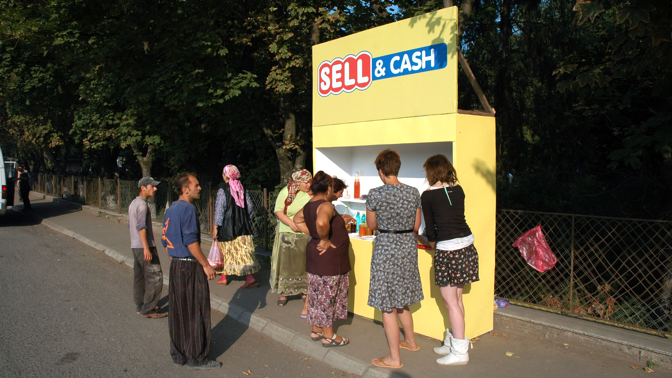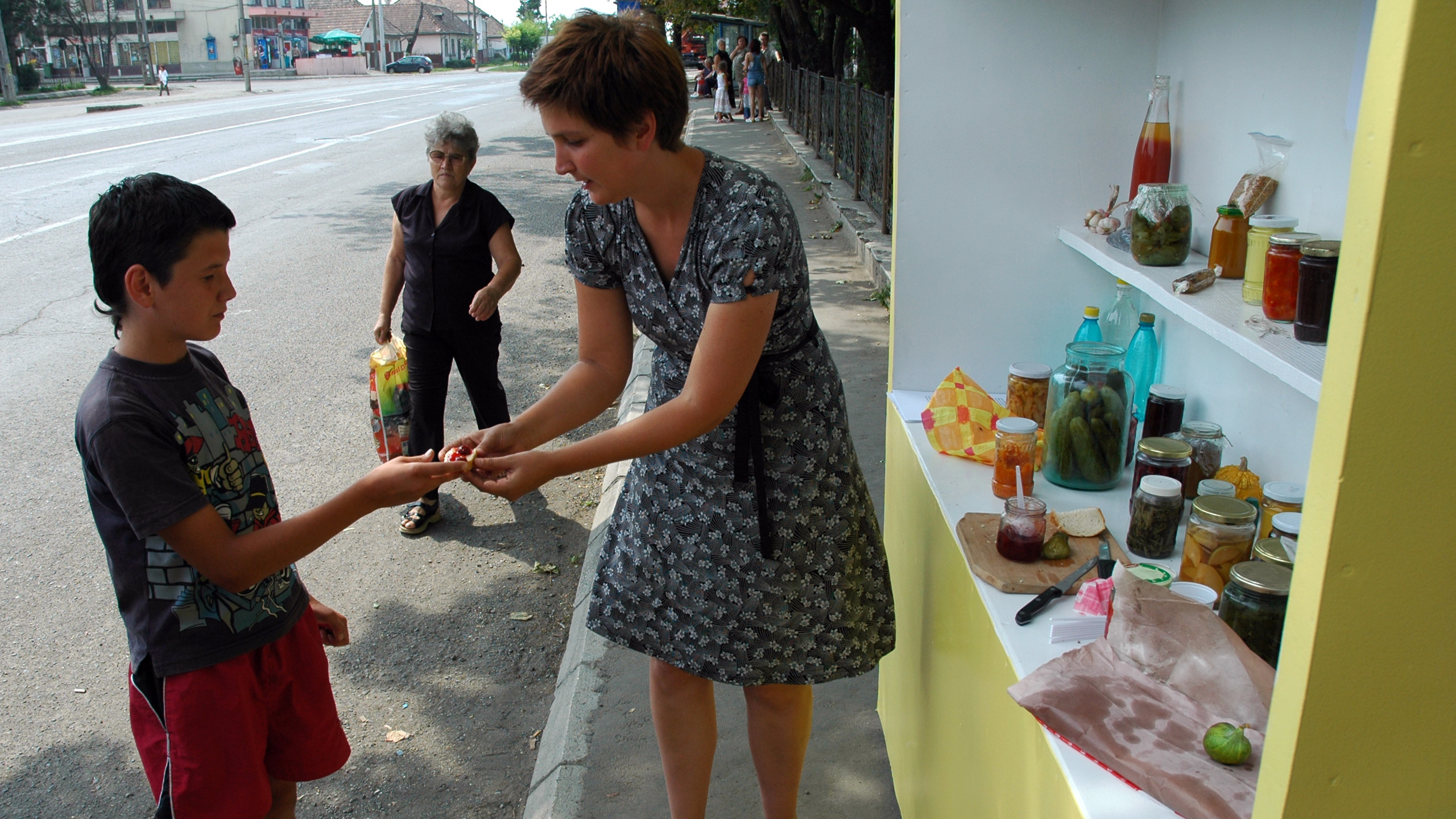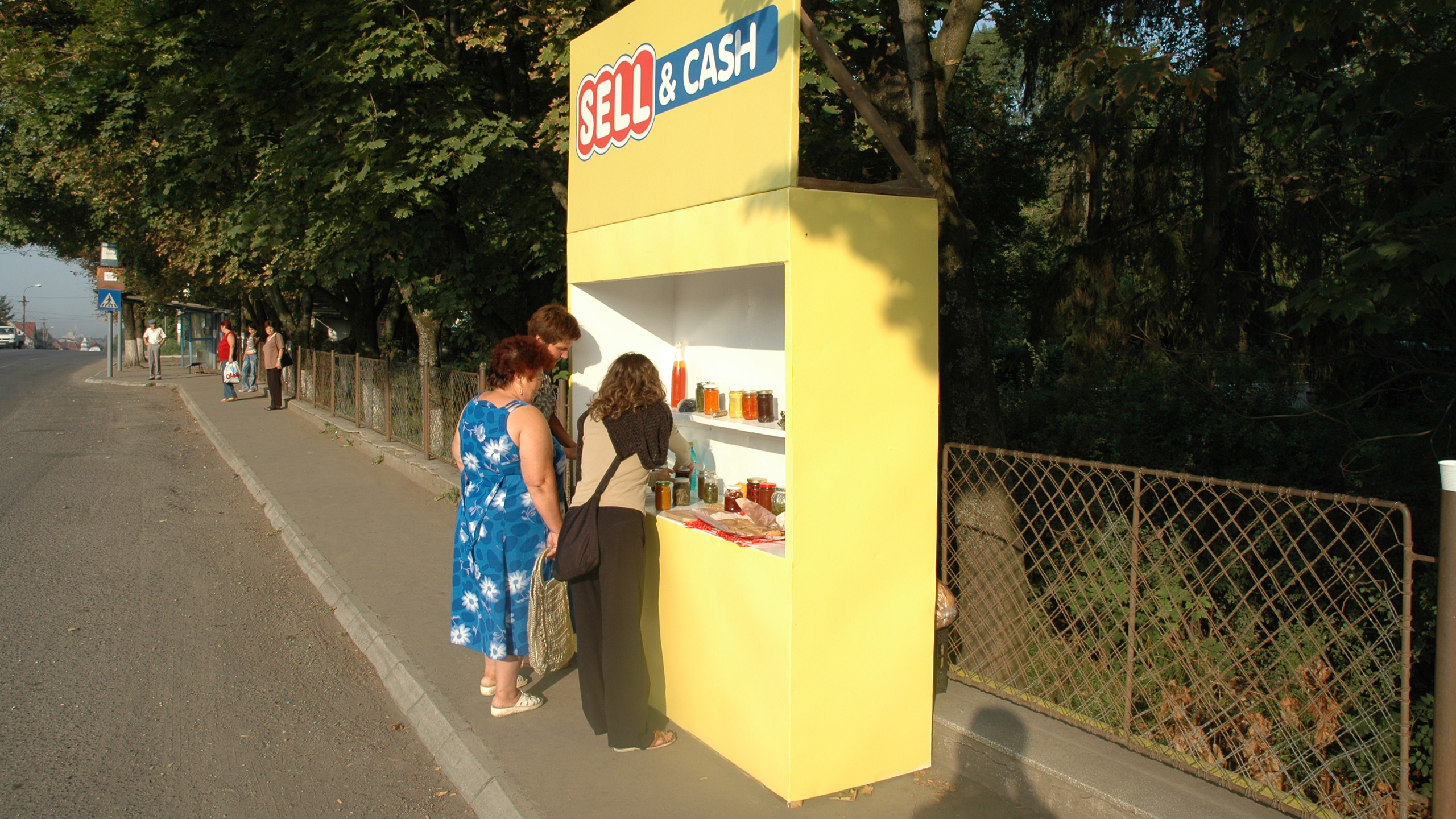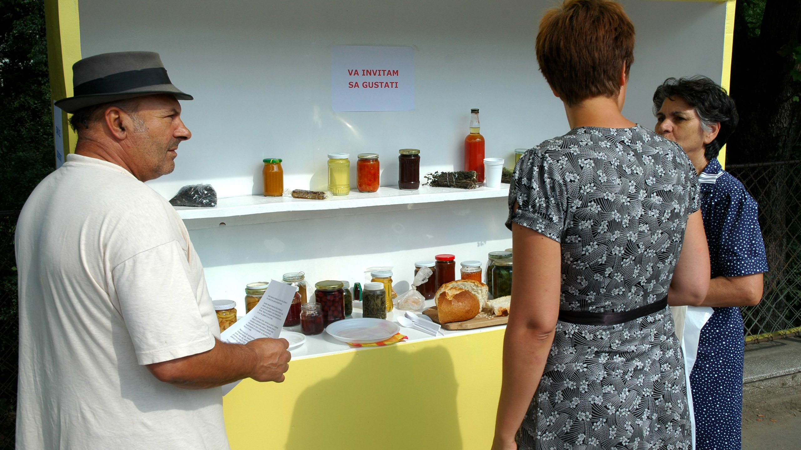 The work addressed the rapid dismantling of a local economy and agrarian tradition in a village in Romania due to the arrival of new foreign supermarkets. As a result the genetically modified crops replaced a century old agricultural biodiversity. The aim of the project was to promote the disappearing local food culture by collecting products, such as compote (preserved fruit juice), tuica (plum spirit), honey and a variety of pickles from local farmers. The products were shown in a promotion booth, designed in the colours and typography as found in the design of the newly build supermarket. During one day, local residents were invited to taste their own unique products.