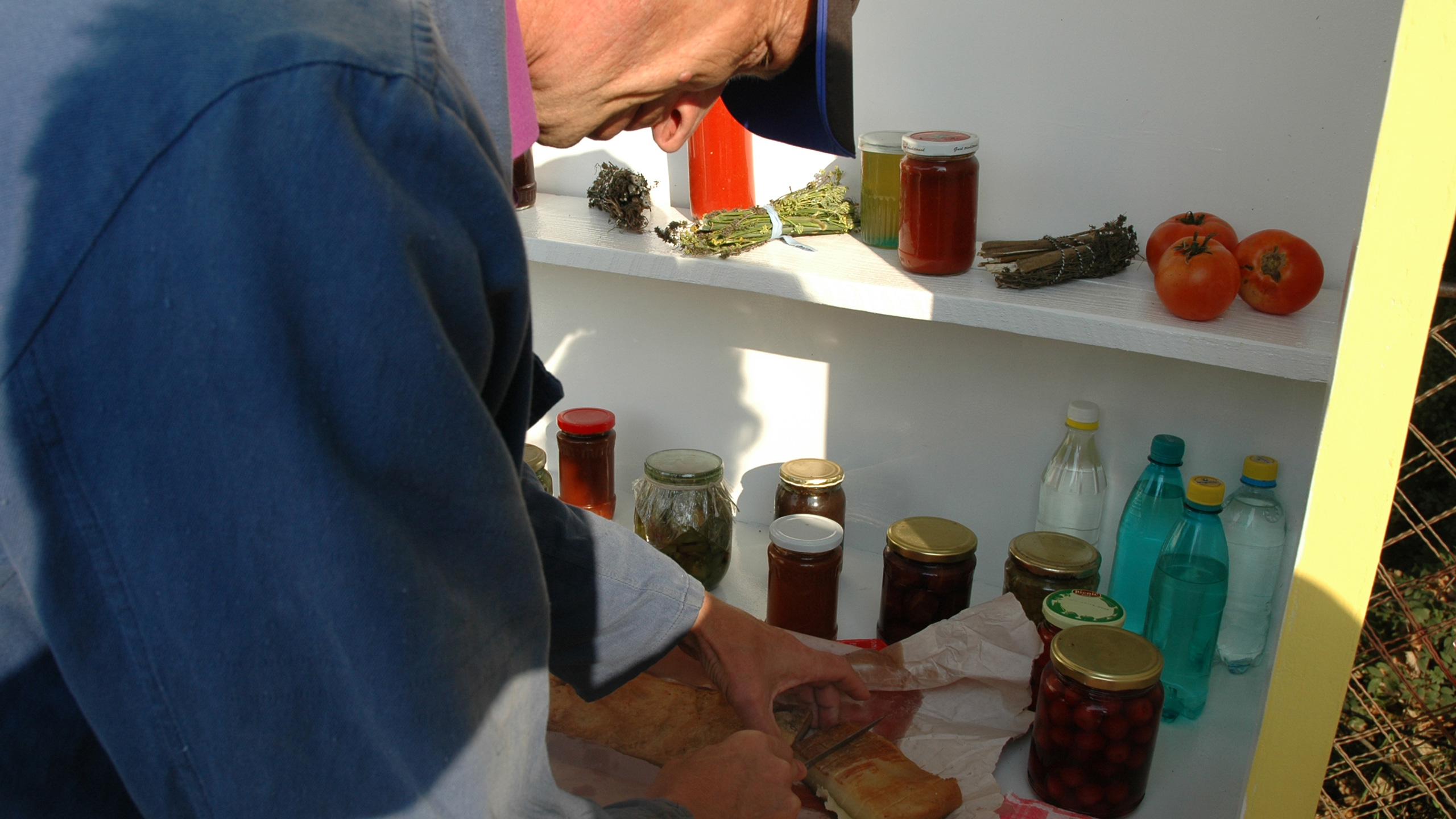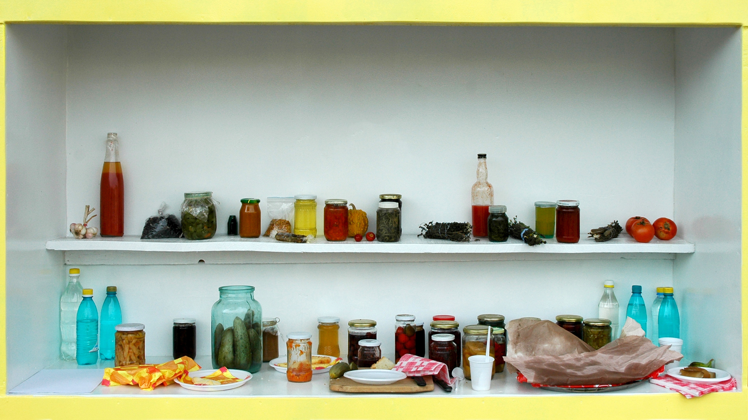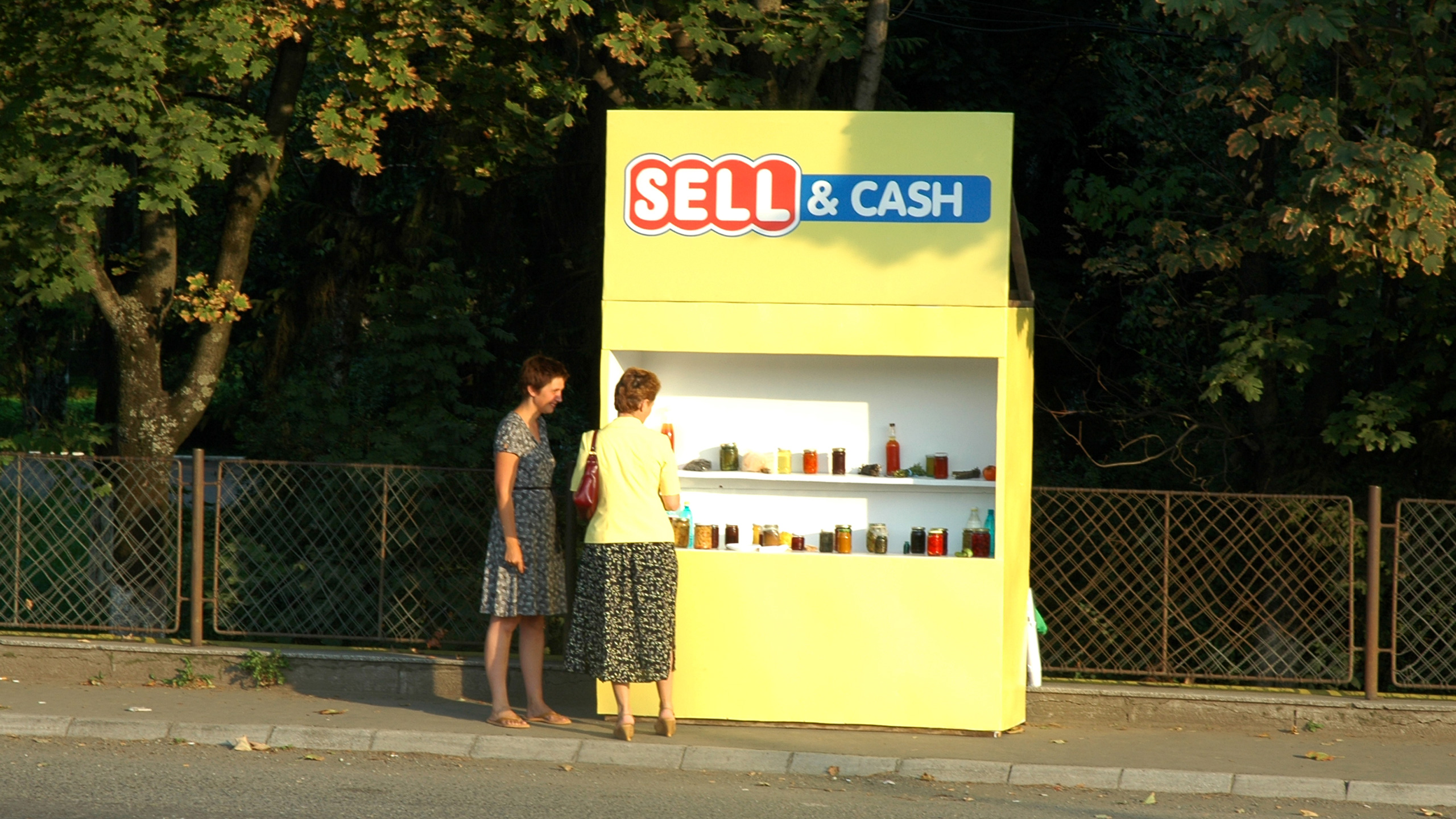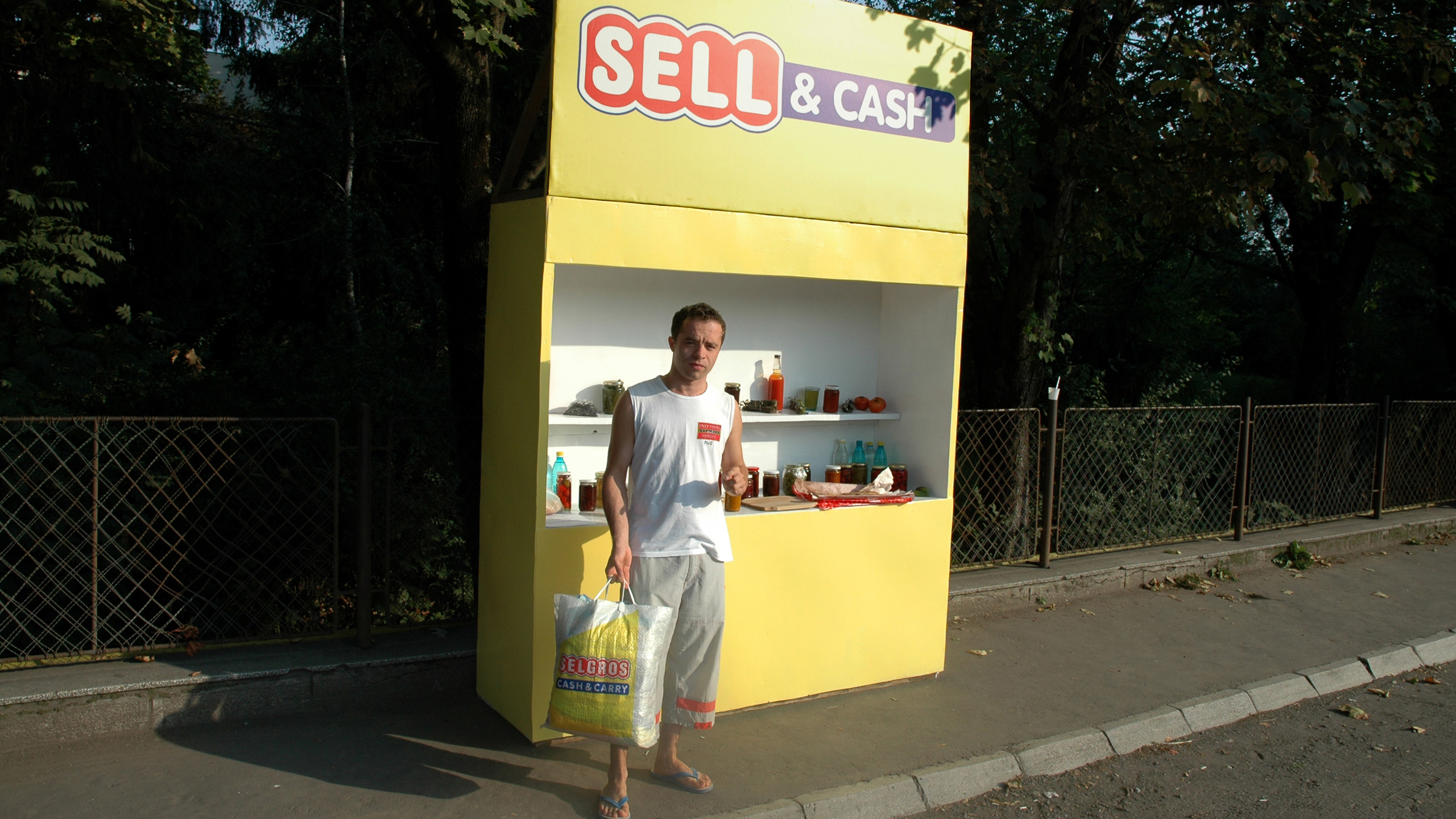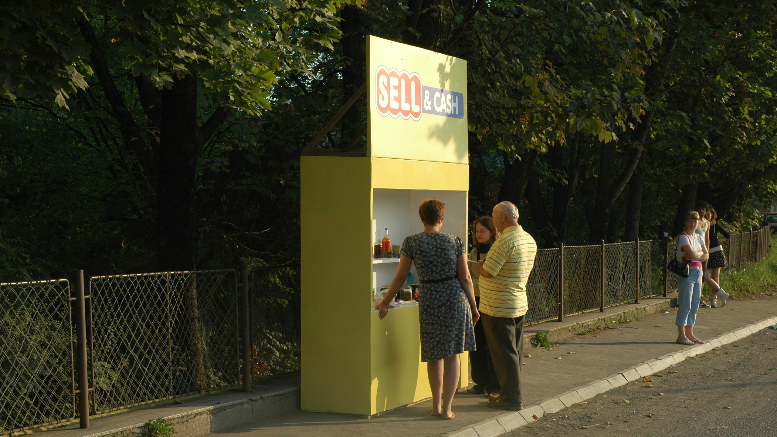 The work addressed the rapid dismantling of a local economy and agrarian tradition in a village in Romania due to the arrival of new foreign supermarkets. As a result the genetically modified crops replaced a century old agricultural biodiversity. The aim of the project was to promote the disappearing local food culture by collecting products, such as compote (preserved fruit juice), tuica (plum spirit), honey and a variety of pickles from local farmers. The products were shown in a promotion booth, designed in the colours and typography as found in the design of the newly build supermarket. During one day, local residents were invited to taste their own unique products.