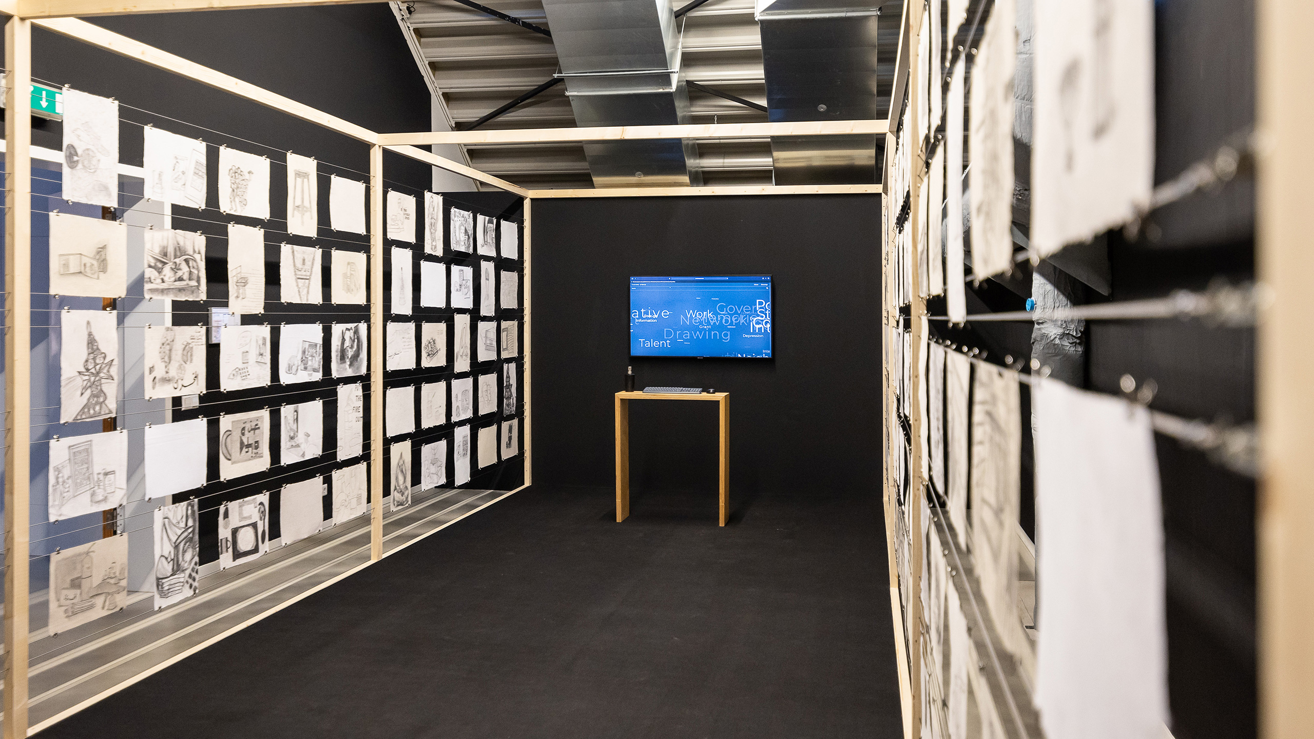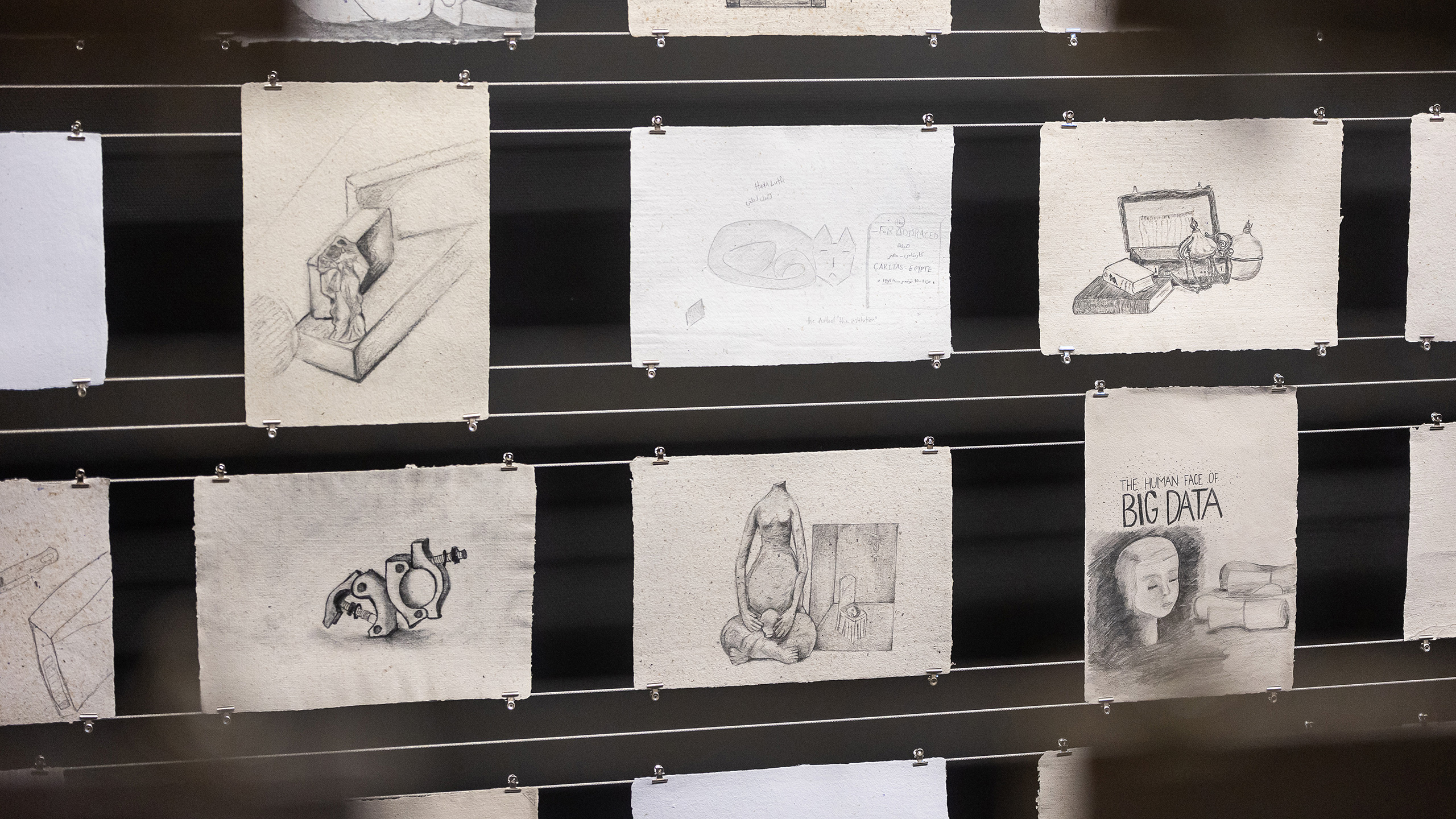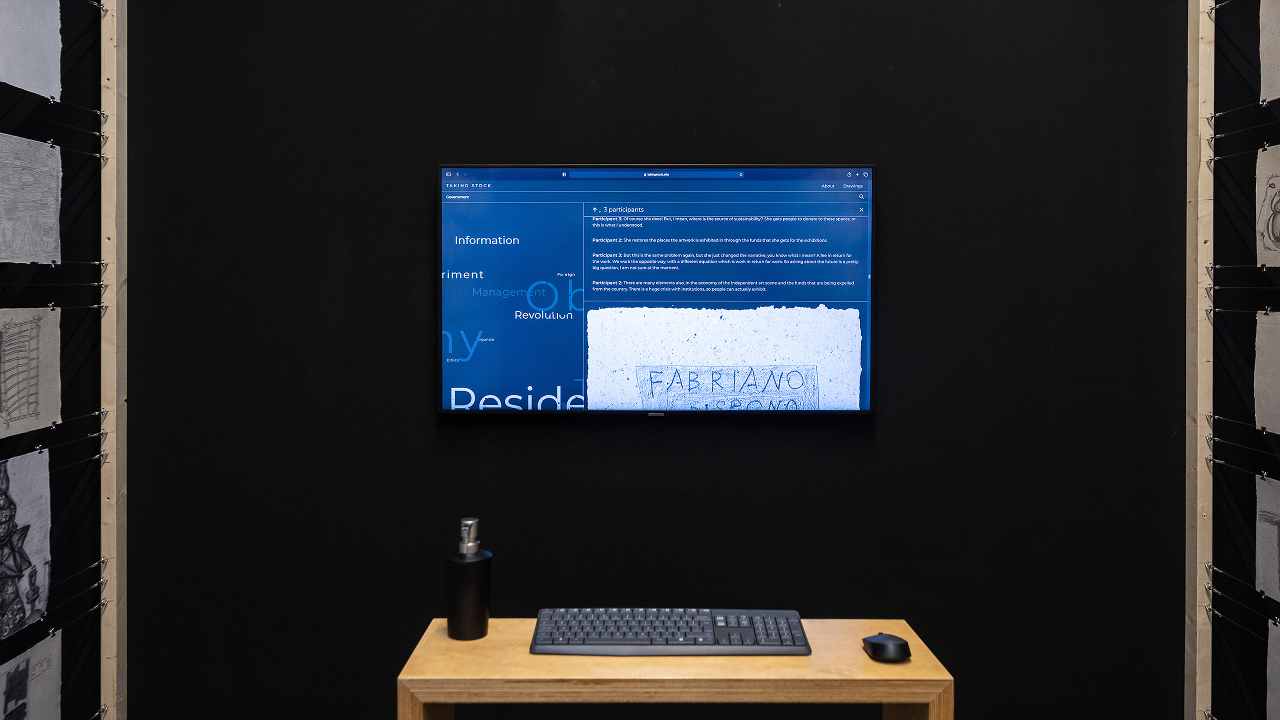 The intimate and informal conversations that accompanied the drawing sessions were recorded, transcribed, coded and published online on a website. The exhibition at Framer Framed consists of an installation showing the participants’ collection of 130 handmade drawings in Cairo, accompanied by a projection of the Taking Stock website, an interactive platform that unlocks the digitised conversations.